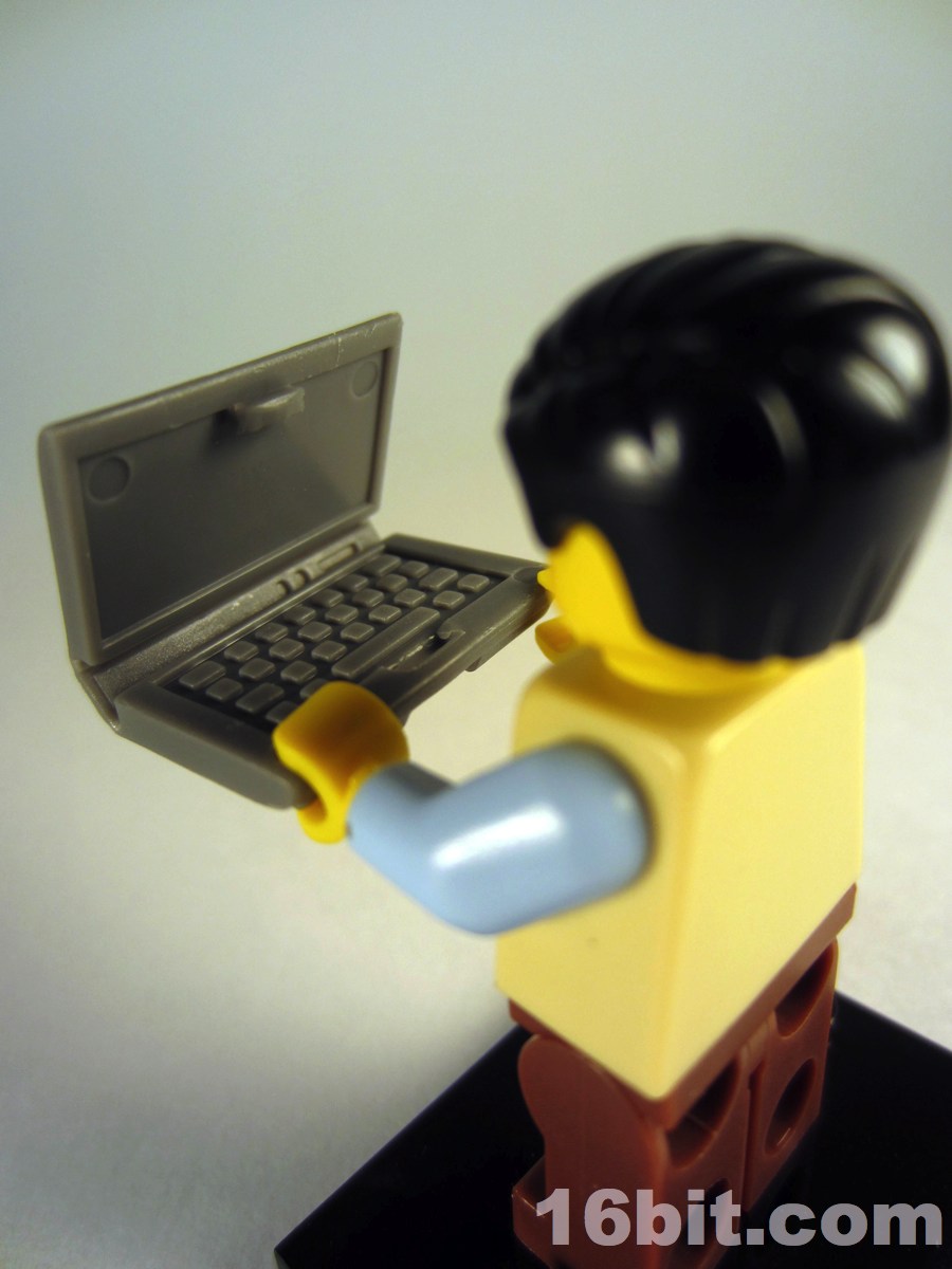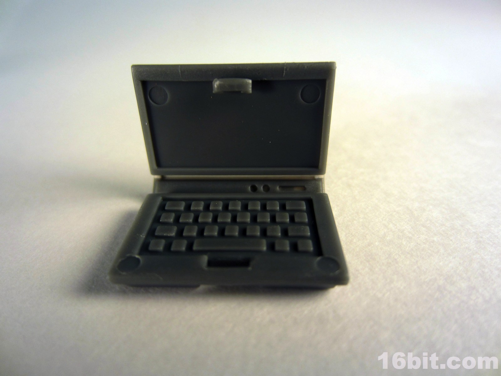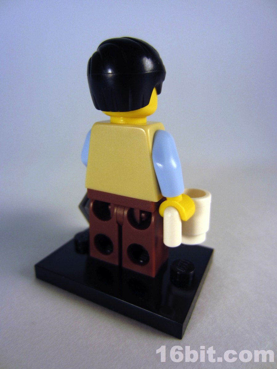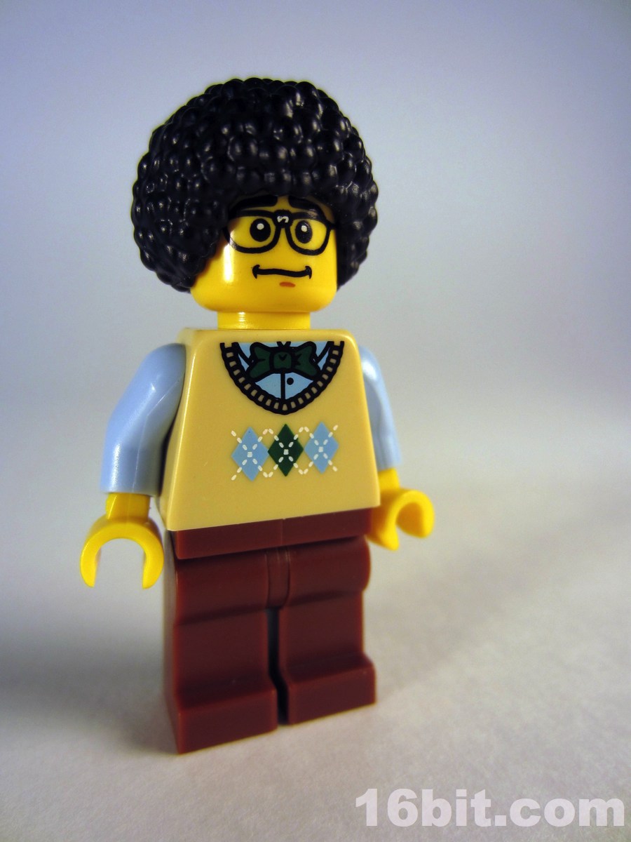 The figure has a nicely detailed sweater vest with a bow tie, which is a little too much like the "dud" from the Mystery Date game I remember seeing on The Simpsons. The hair is neat, and I think could make the basis for a decent Devo (Nu-Tra era) were the bodies to be found. The deco is simple, although as I've been pulling out my 1980s LEGO minifigures lately, it's not exactly cheap. I remember when we got a blue torso with white outlines, and that was it! This figure has multiple colors and complicated, fine detail. The glasses are particularly dorky, and the eyebrows and smile are of an affable fellow. What's particularly neat are the accessories. A mug with the C:\ DOS prompt is delightful and another nod to buyers over 30. The laptop seems inspired by some of the Dell and Apple designs, with a circle and a LEGO logo on the outside. The interior has no deco to speak of, but there are sculpted keys and a blank screen that begs for a sticker. The laptop isn't jointed, so you may notice some minor stress marks where the plastic folds. (Confidential to LEGO: Playmobil puts separate joints in so they don't snap or tear. I'm just saying.)