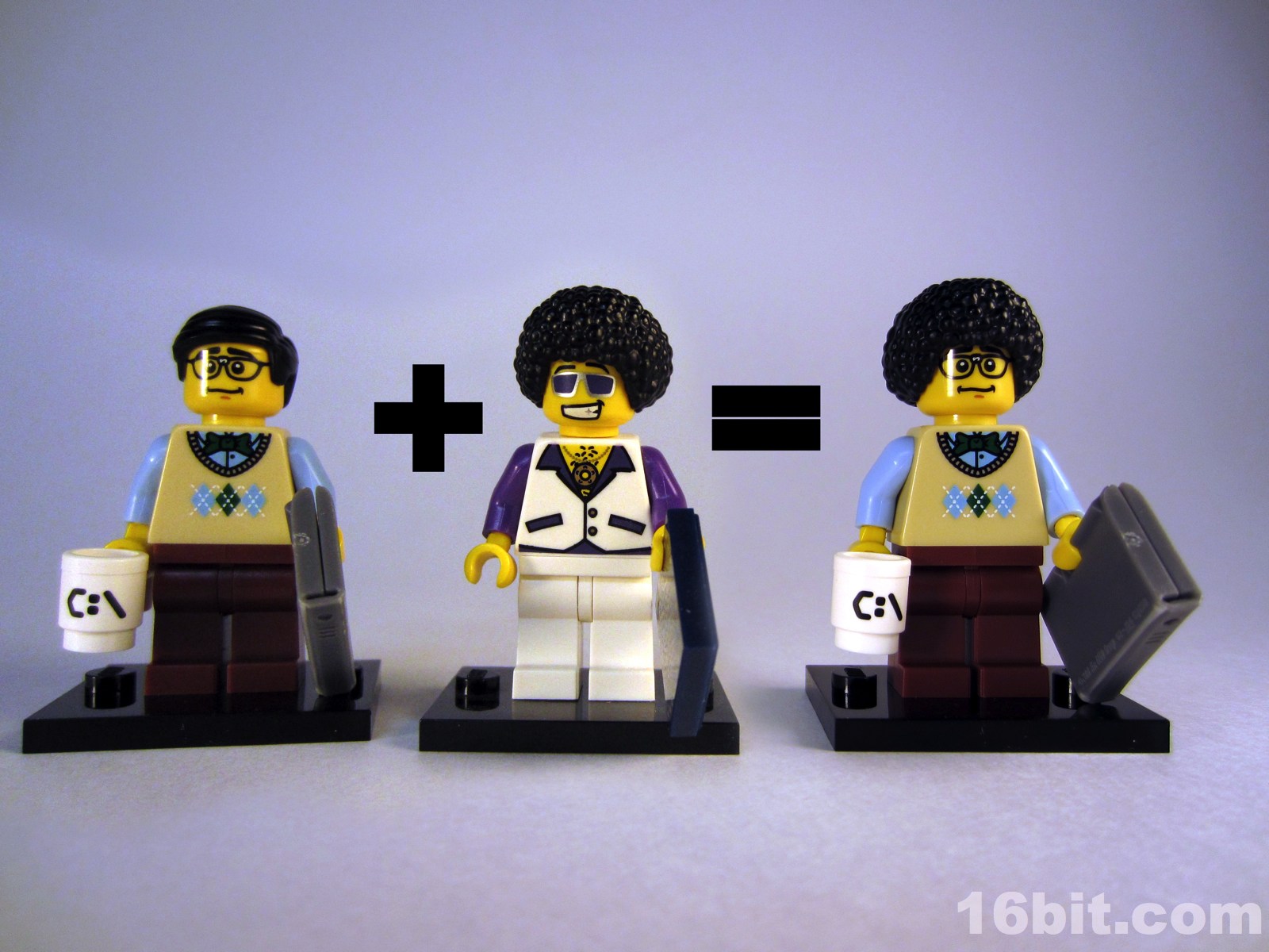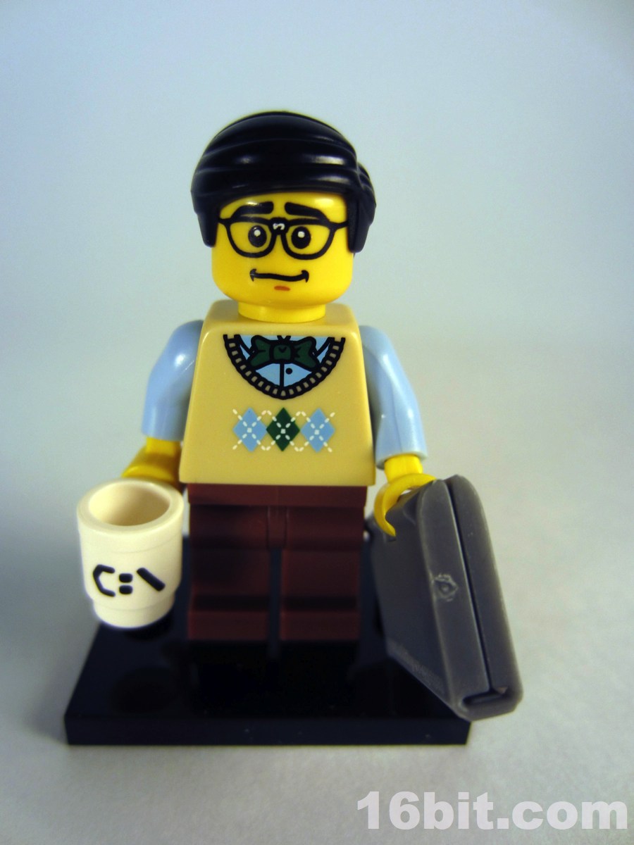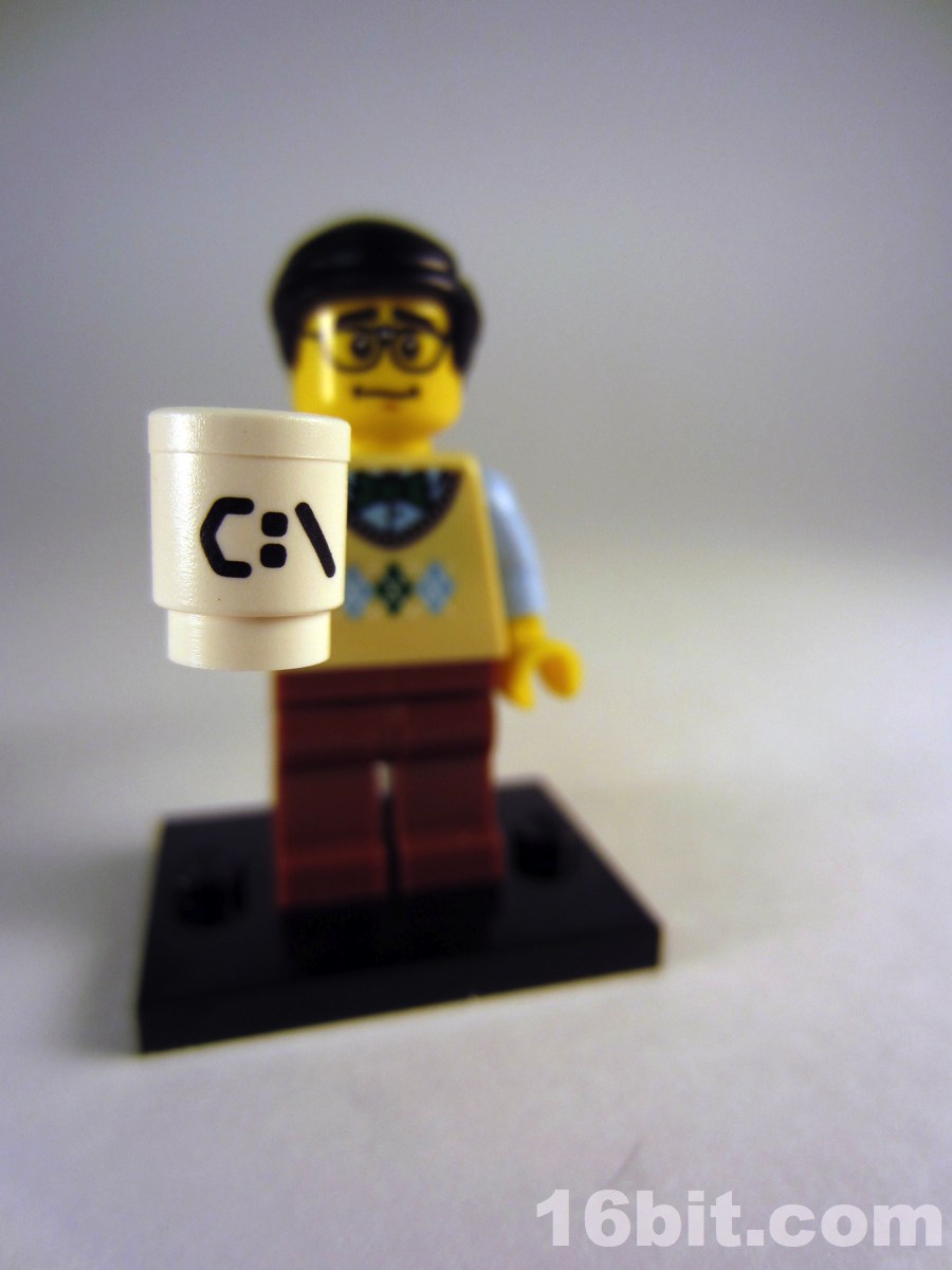 This is a perfectly acceptable figure, but I think that history will prove it to be more valuable as a series of parts. The head could be a future Mark Mothersbaugh figure, the hair could be a variety of interesting things, the body has a few decent uses, and I assume the mug and laptop are going to be desirable for anyone making a LEGO office. I've got mugs, but not C:\ mugs. I'm not crazy about "nerd" figures because mentally I always approach them as if they have a post-it note on them saying "Hey Adam, this is what we think you're like" but it's pretty charming. Most figures in this line have a role-- the sports players beg for you to build tennis courts; the historical figures don't really belong anywhere just yet. The computer programmer could go pretty much in any modern-era LEGO scenario, be it in a town or... I guess that's pretty much it. I appreciate the design being something I can use with multiple sets, and it's a great addition to any LEGO City... city.