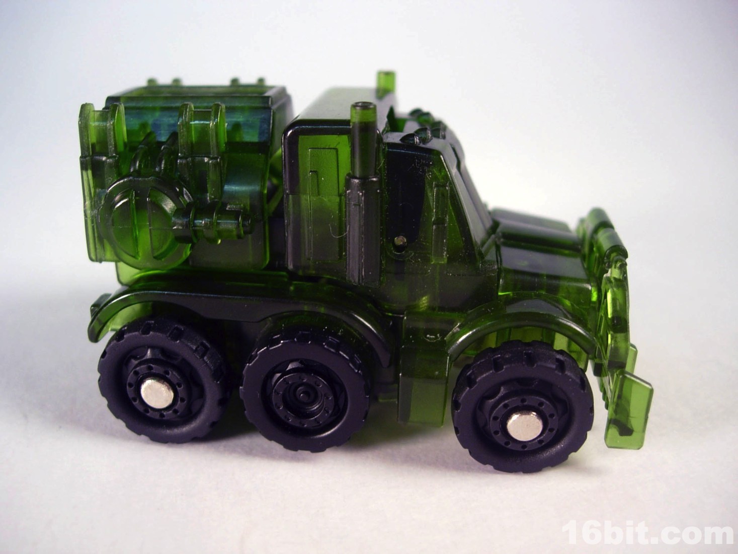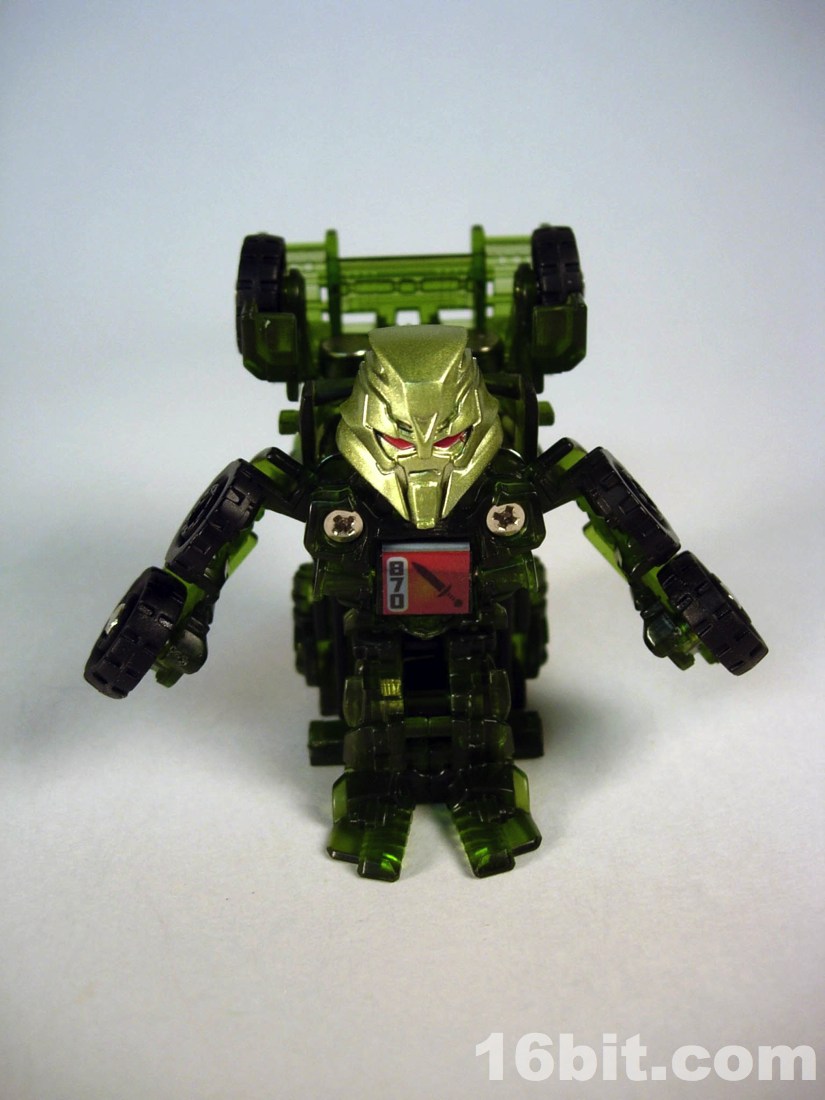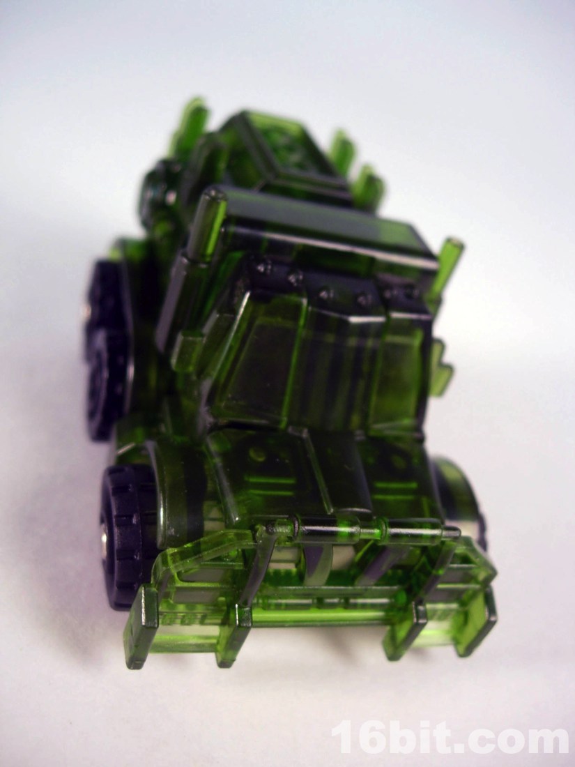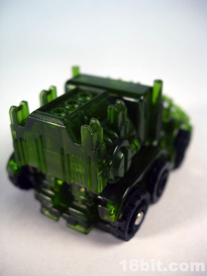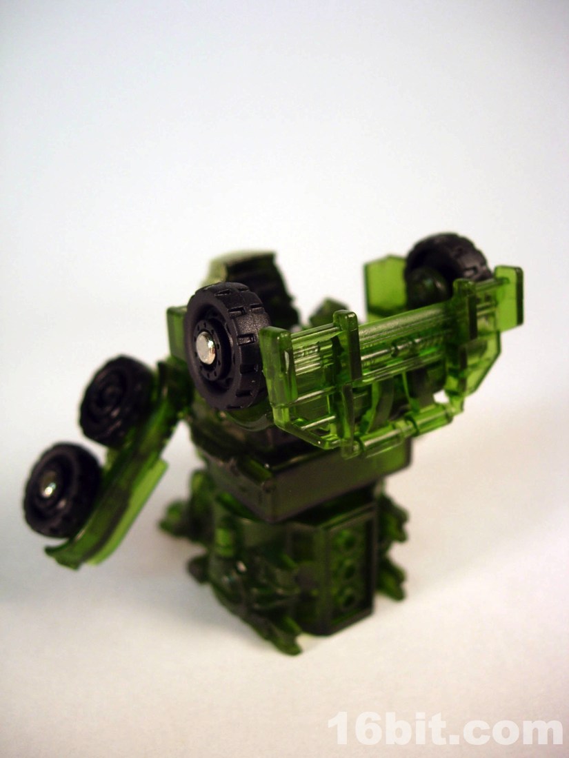 Few clear Bot Shots are effectively "new" figures, Megatron is a really interesting mix of existing and new parts to make a figure which is, well, new. A painted version of this mold is due in wave 5, but this one is out right now. The head is similar-but-slightly-different from the previous Megatrons, with a new "trailer" piece and a recycled body from Optimus Prime. The end result is effectively Dark of the Moon Tanker Megatron, except cast in clear green plastic with a little bit of paint. The robot mode is, well, here it is. Standard non-articulated design with a lot of paint on the head, for a change.