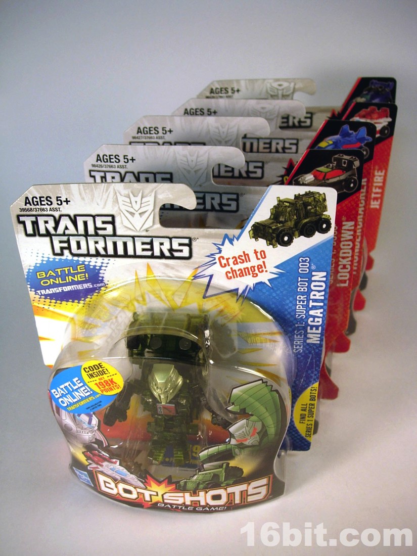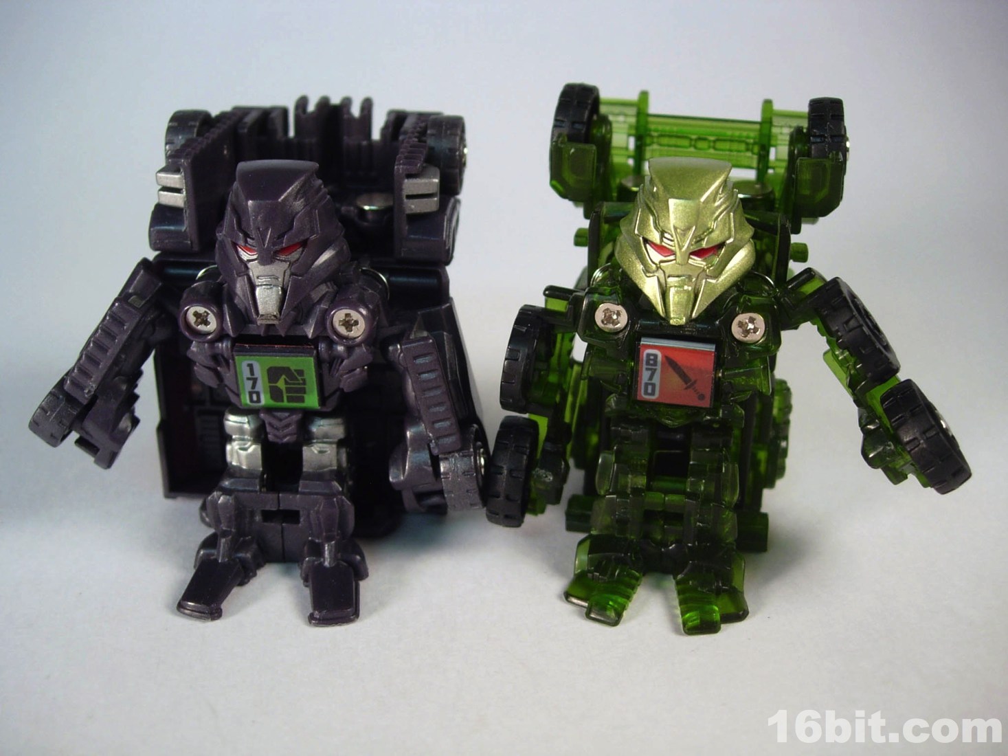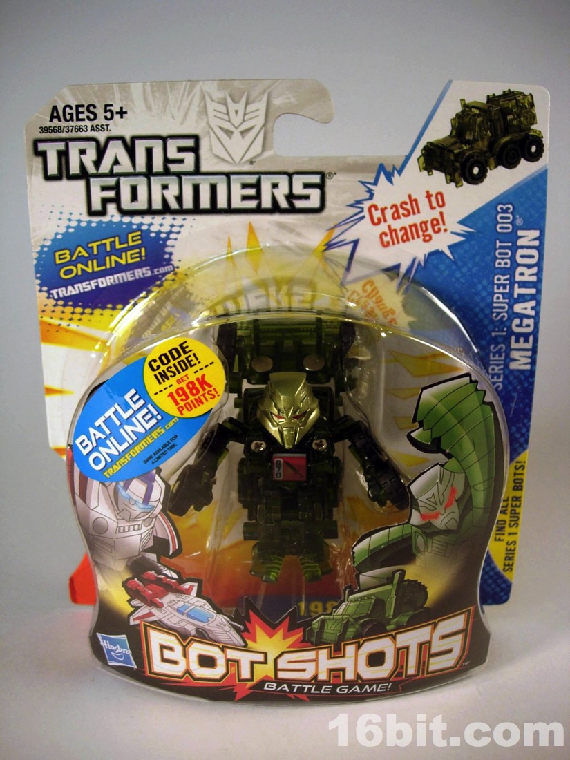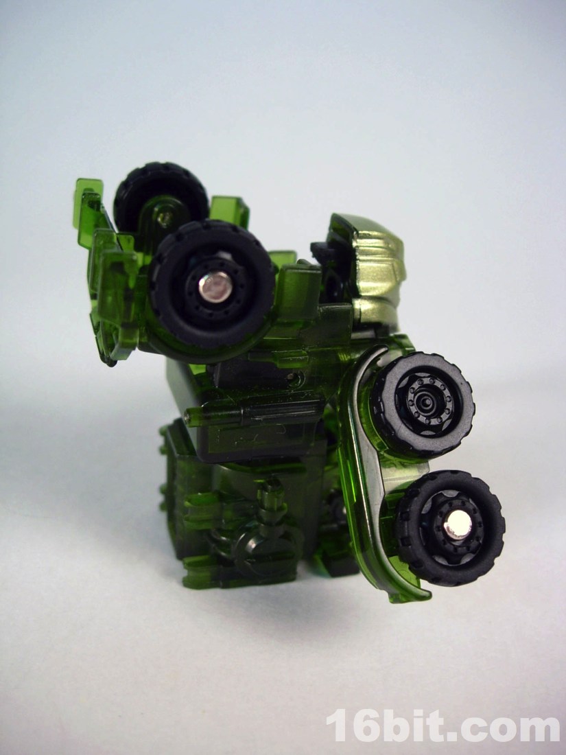 Few clear Bot Shots are effectively "new" figures, Megatron is a really interesting mix of existing and new parts to make a figure which is, well, new. A painted version of this mold is due in wave 5, but this one is out right now. The head is similar-but-slightly-different from the previous Megatrons, with a new "trailer" piece and a recycled body from Optimus Prime. The end result is effectively Dark of the Moon Tanker Megatron, except cast in clear green plastic with a little bit of paint. The robot mode is, well, here it is. Standard non-articulated design with a lot of paint on the head, for a change.