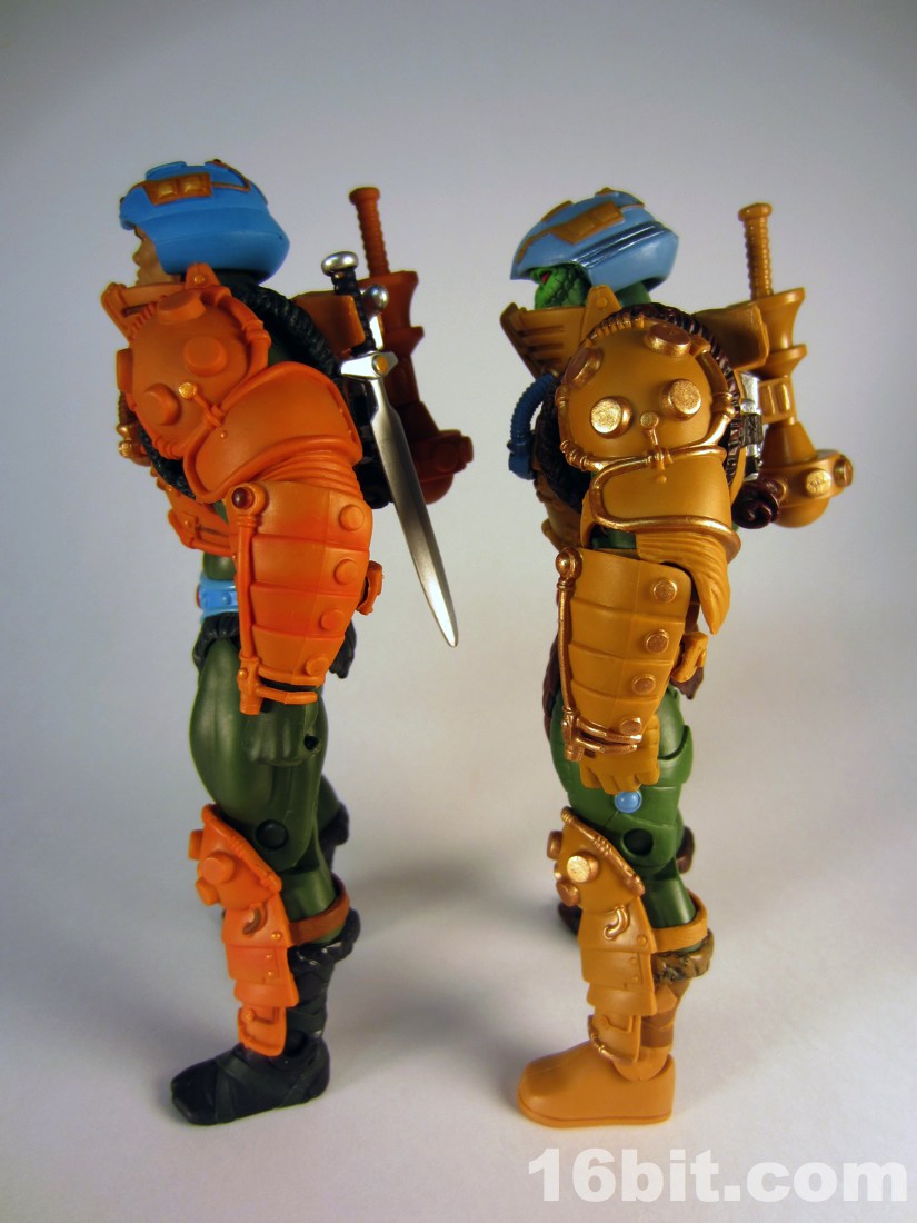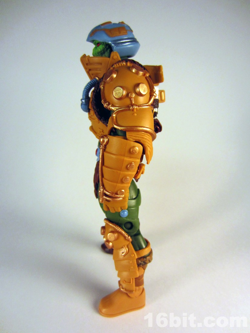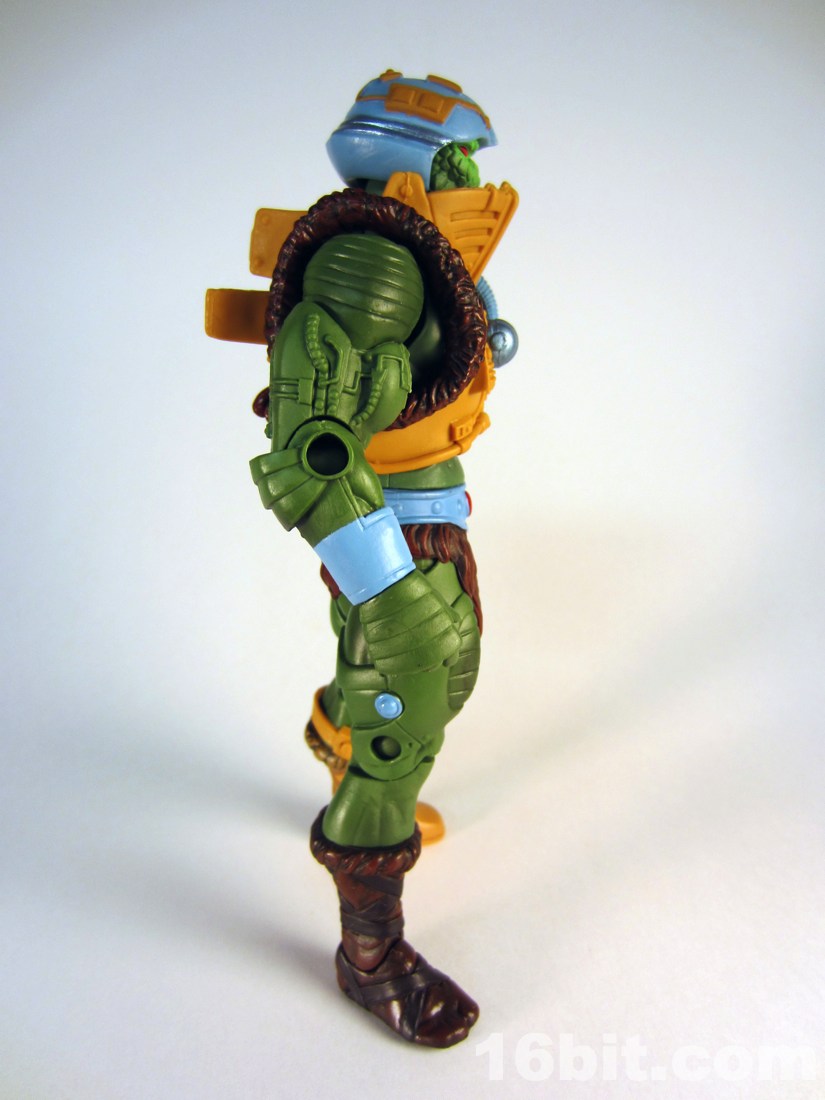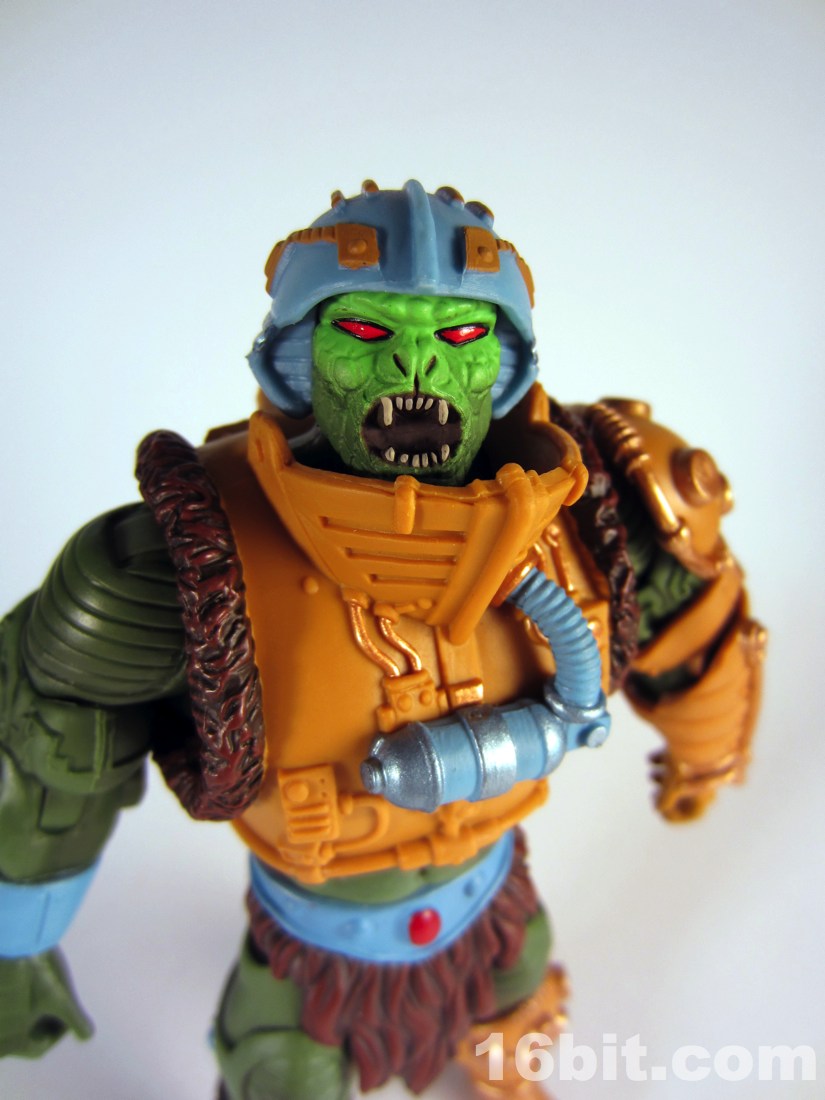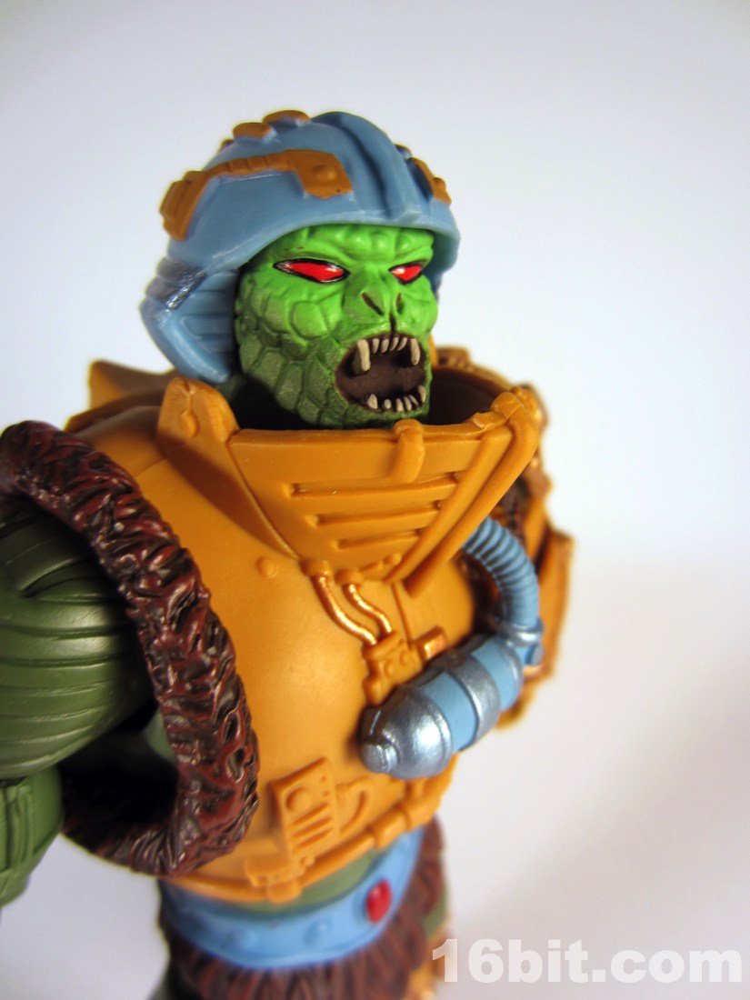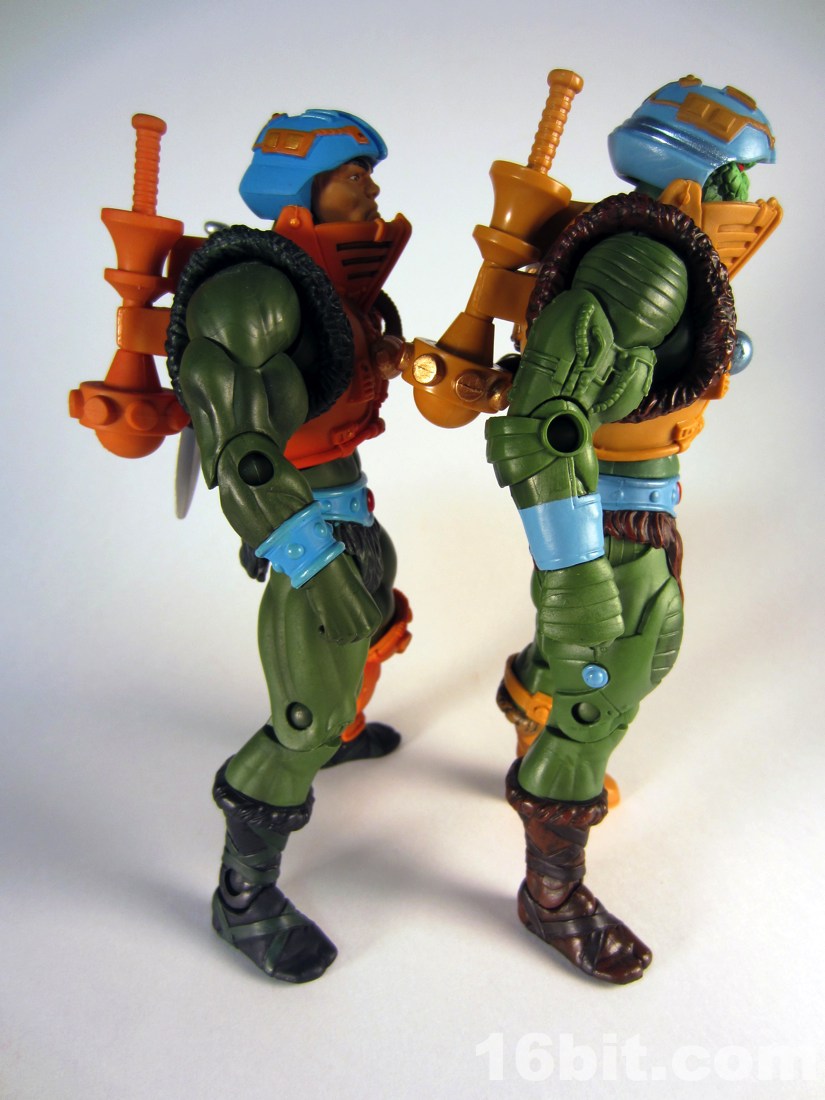Snake Man-At-Arms probably has a more interesting backstory than most figures, because in this case fans actually got Mattel to redesign him after being unveiled to the public. If you go look at the NYCC coverage you'll see the same basic head, but the figure's body is different than the one in this review. He's made primarily of standard Man-At-Arms (2009) parts, but in the 2002-esque coloring. Mattel changed the figure to incorporate things like Roboto's arms and Trap Jaw's legs, plus mismatched feet which more accurately portray the 2002 version of Duncan's action figure. The new paint job is nothing to sneeze at, either.