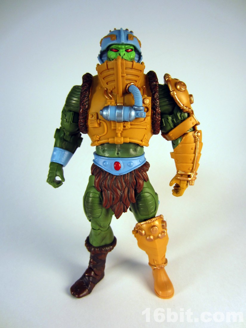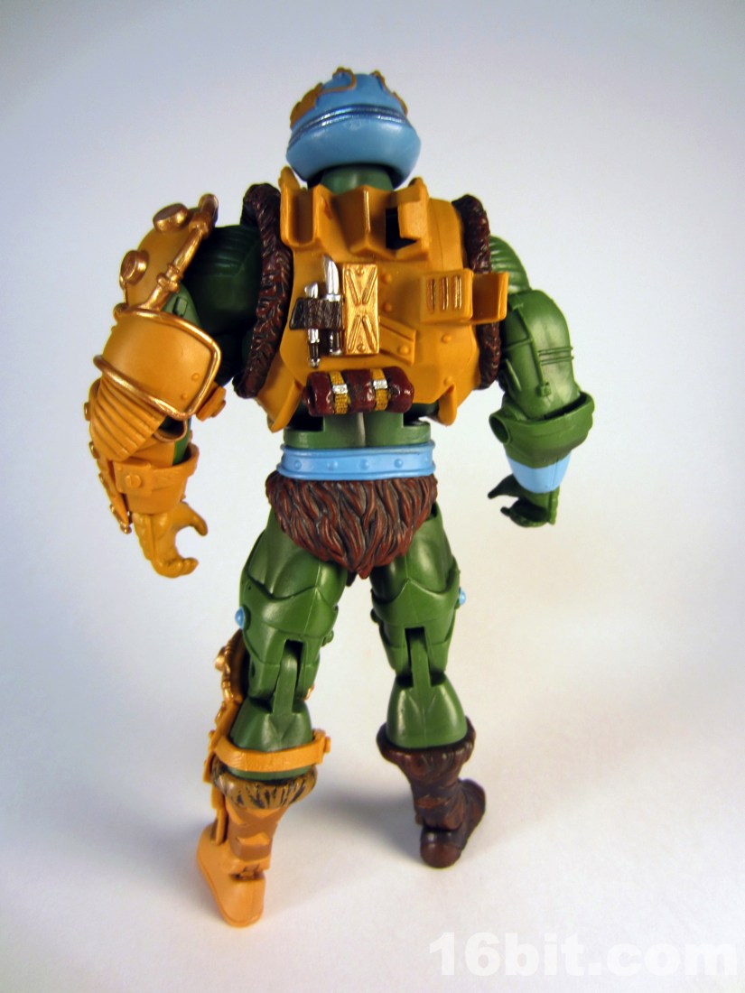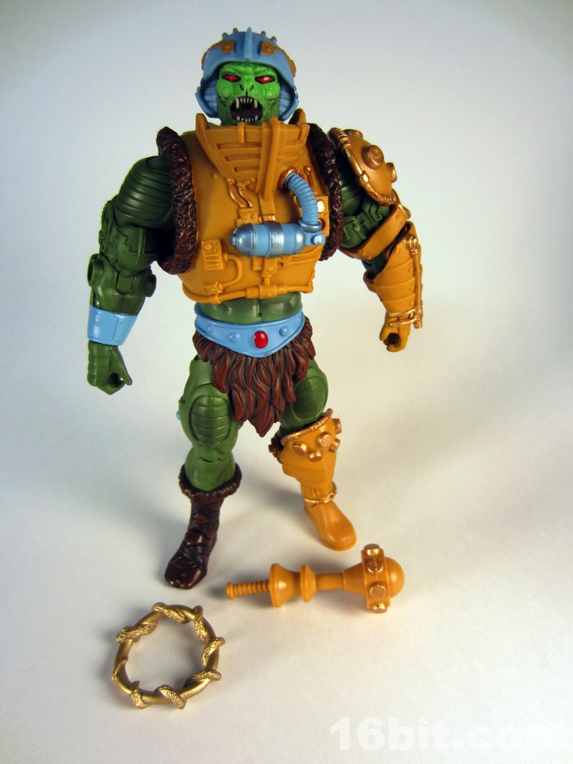 Metallic highlights were added to his armor which bring out some detail nicely, and other things (like painted rivets) were dropped. He sports the longer loincloth, and his left leg is the same basic one used on the Eternian Guards. I should also note that not just his face, but his helmet has been retooled. Some stripes and grooves were added to the snake version, and if you don't care for it the snake head is easily swapped with one of the previous Man-At-Arms noggins.