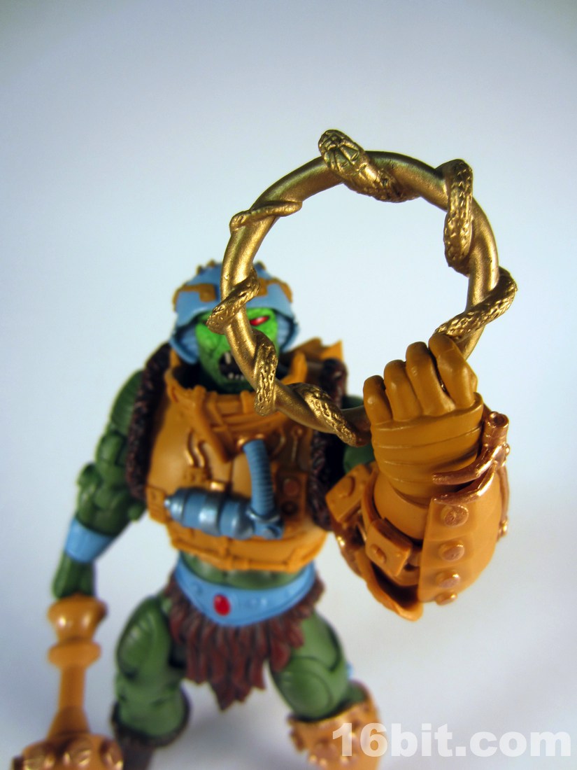 Accessories are somewhat lacking, as evidence by the empty weapon storage rack on his back. It can carry Snake Man-At-Arms' club, but no other swords or guns were included so it just looks empty most of the time. A pity, but in the days of cost-cutting it seems necessary. Aside from a redecorated club, he also includes the "snake ring" which caused his transformation in the storyline. It's painted gold and looks pretty nice, but as a toy collector it's mostly just a nice curiosity. I don't wear the rings, I have nowhere to really display it, so into the parts bin it goes! It's a shame, as this figure had very little new tooling in it and one of the two new pieces is something I really don't need. It's nice, it's well-executed, I just can't do anything useful with it.
