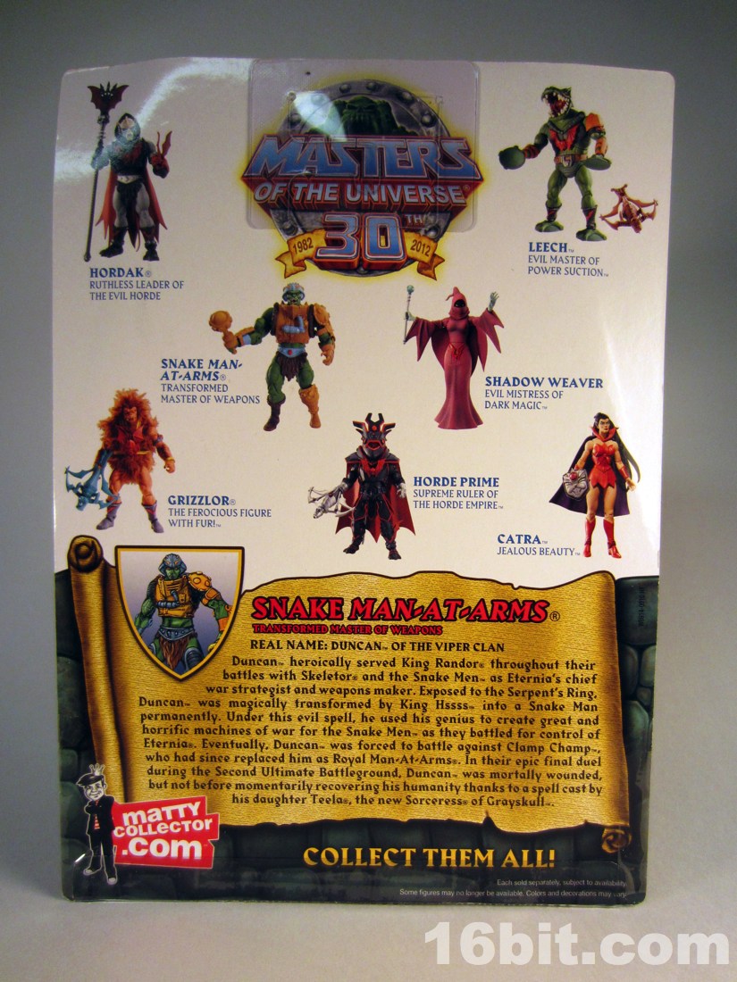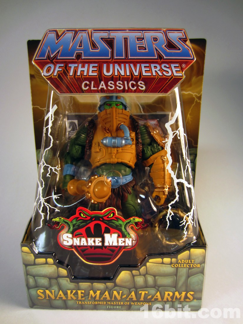 The character Snake Man-At-Arms comes from a 2003 episode of the Masters of the Universe cartoon in which Duncan gets turned into a snake man, temporarily. The idea was to bring him back that way permanently as the Snake Men vehicle designer, and to some extent this was explored in a comic book which came packaged with the DVDs of the show. The Classics fiction takes it a step further by not only transforming him, but letting you know he dies. So along with the Sorceress, they slowly seem to be killing off a few of the heavy-hitters from the original series but at least we got a decent action figure out of it.