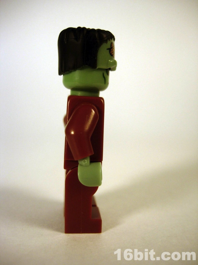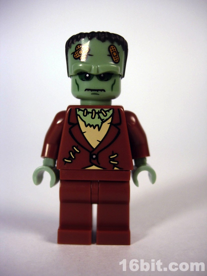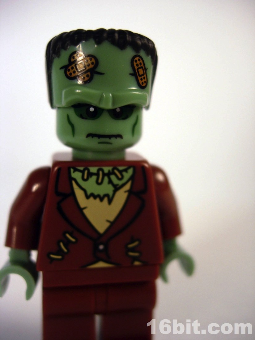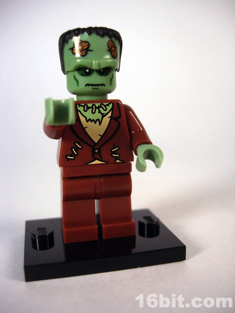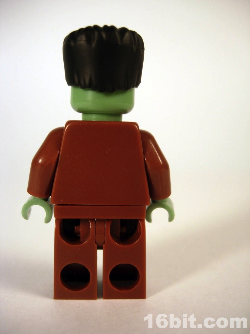 Of the many figures in this collection so far, this is a relatively simple one. There's only printing on the front of the figure, there are no real accessories to speak of, and it's basically just a minifigure with a "hat" to make up the rest of his head. It turned out great, and to be honest it's not a monster that demands accessories. Sure, a villager with a torch or pitchfork would be nice, but the only things that make sense for Frankenstein (to most people) would be flowers or a small girl to throw around. The detail is great, and the bandages put a 20th century spin on the much-older monster's design. It's a clever departure from the usual stitches and staples, some of which are still present on his torso.