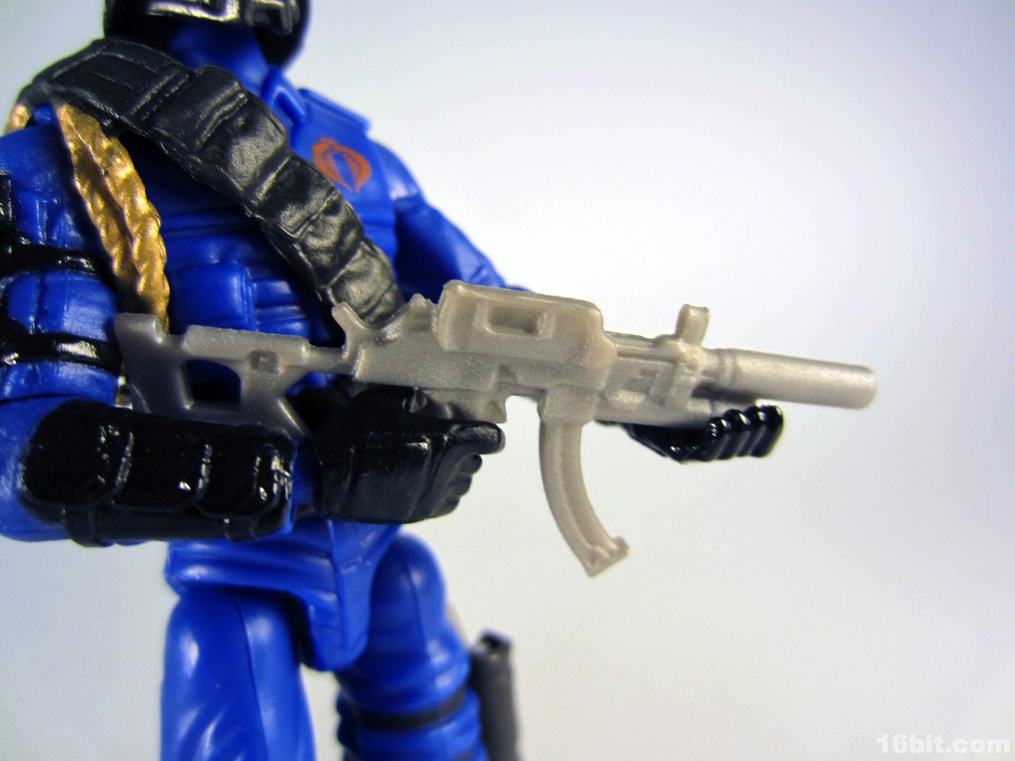 His pistol fits into his holster, but the holster is not quite snug enough-- as such, it might fall out if the figure is carried around. It's a nice gun, though, sort of pale but it basically looks fine. The rifle is similarly cool, and Cobra Commander has no real problem holding it with both hands. (The hands, of course, being a separate issue.)