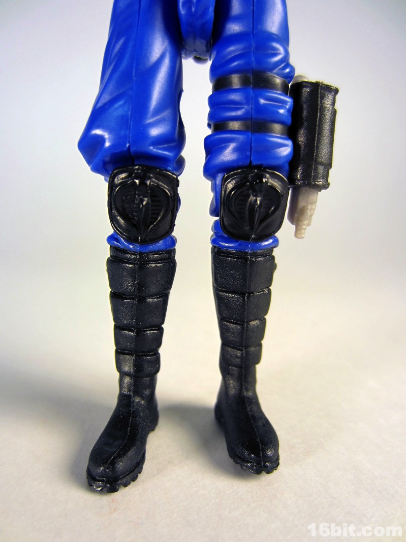 I know a lot of toy fans believe that as molds age and "wear out," figures might get loose joints or less-crisp detail. That's sort of how this one feels to me, except the sculpting is fantastic. I rarely buy new figures which feel worn-out as I take them out of the cardback, but it happens. Still, I love the cool snake helmet with the fangs and eyes, I'm a sucker for blue Cobra Commander figures, and this guy is a kajillion times better than the Cobra Commander from the last movie. In terms of design, this is a wonderful toy. Carded collectors should enjoy it. As an opened figure, I'm glad he can sit OK but the loose hip joints may make standing difficult-- display stand or no-- so let me know in the comments if yours was a little on the loose side, too. I suggest you get one if you can, at the right price, but be prepared for a few quibbling technical issues. (Even knowing that my sample had issues, I'd probably have bought it anyway. It just looks too cool.)