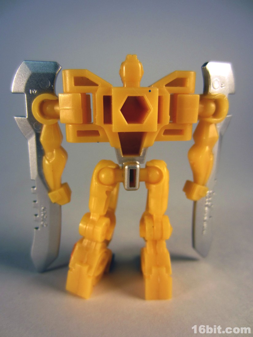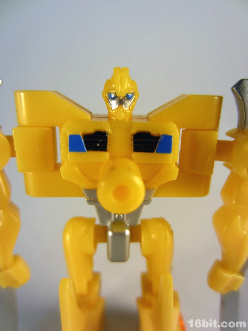 Transforming him to a weapon is fairly easy, the main issue being that the end result isn't as obvious as it is with the Optimus blaster. It's a "mode because we say it is" kind of a thing, so I guess I should say it feels a little undercooked as a weapon. The robot, though, feels pretty nicely realized. Bumblebee has a tiny head with fairly nice paint applications, plus a painted chest to add a little more to his form. Silver swords and black feet add to the detail, so this is one of the few times I think I could ever say that a miniature figure's paint job is far superior than its sculpt. Usually, it's the other way around.