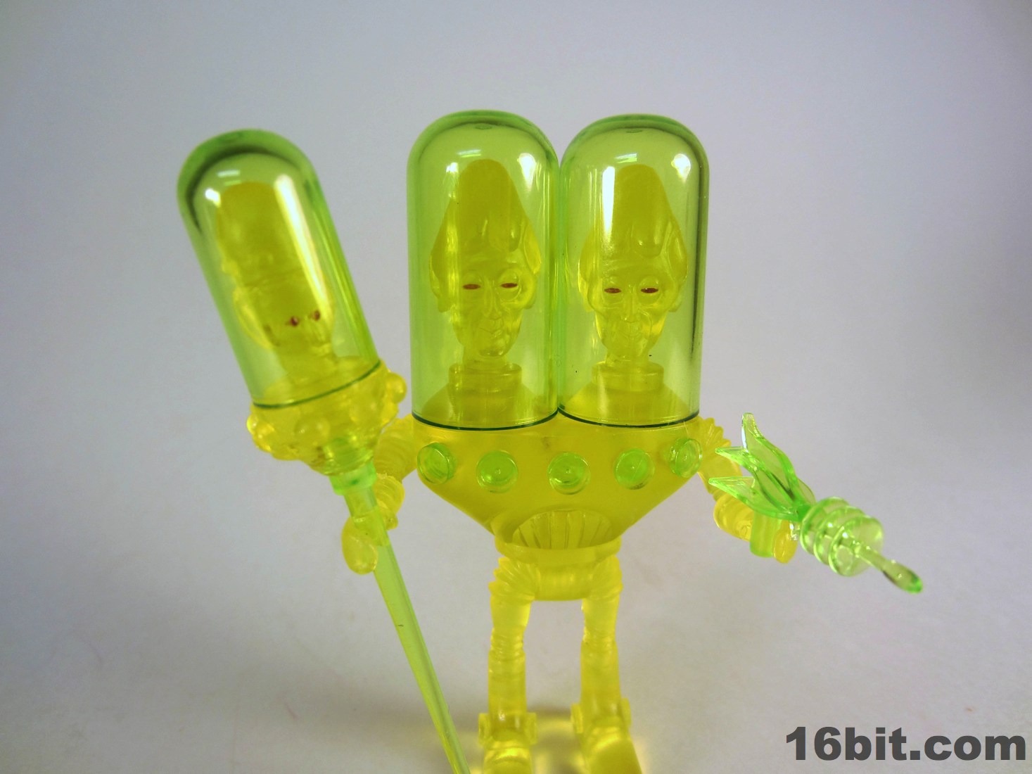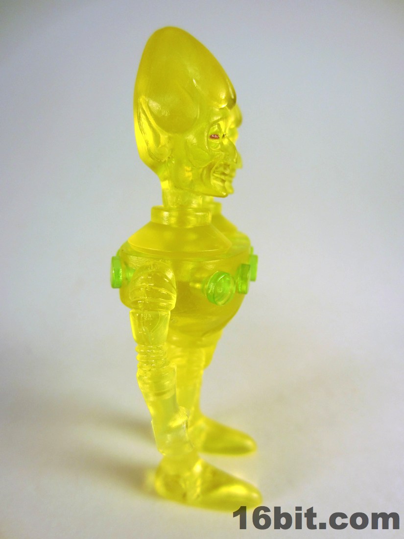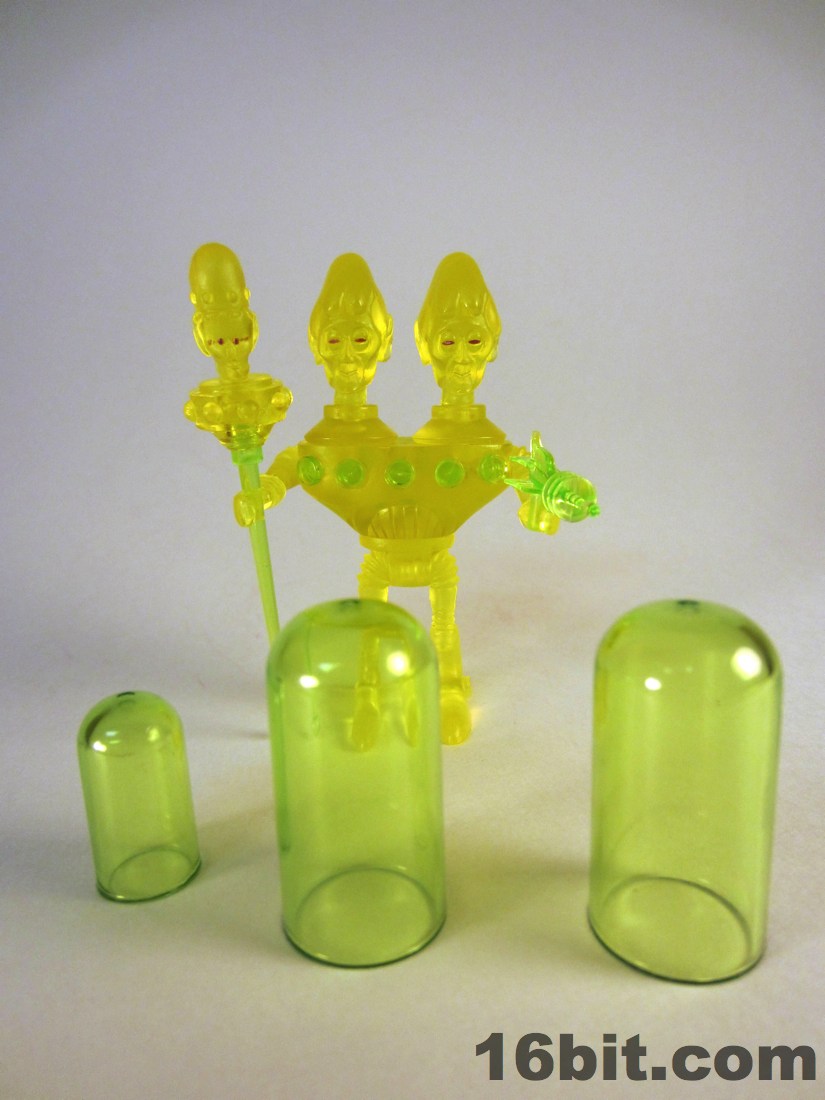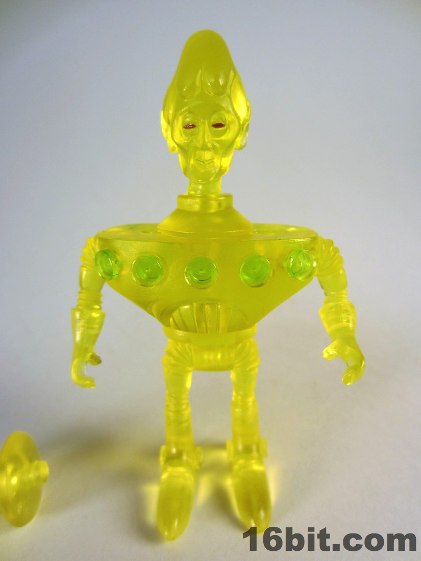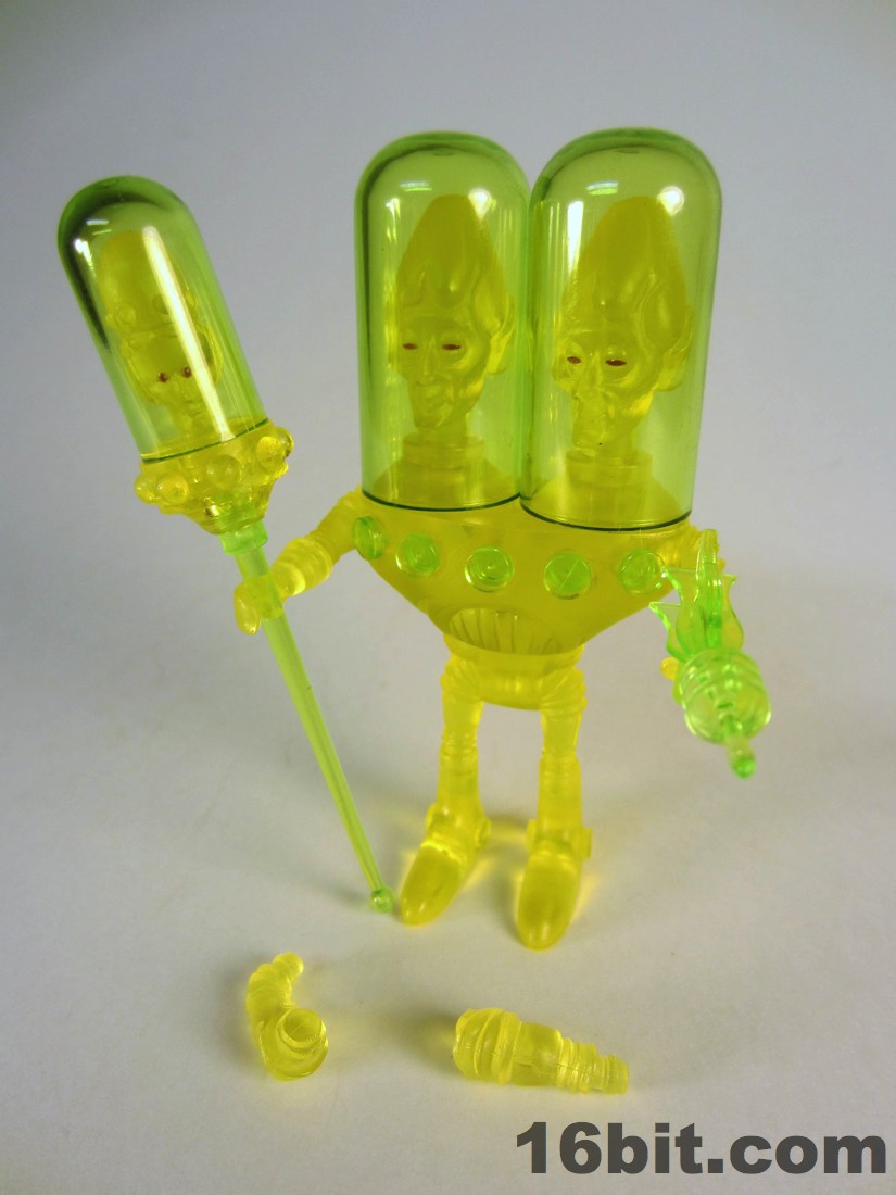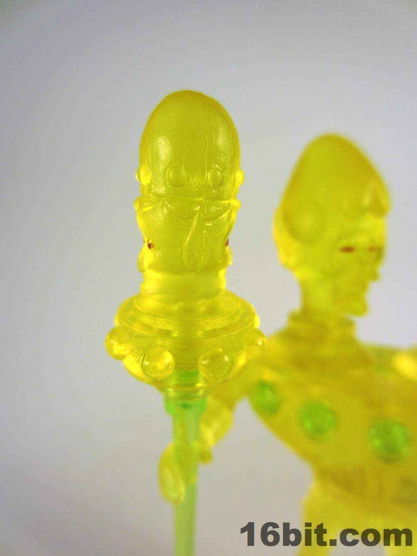 As always, the figure may be split apart and reconfigured through the use of Glyos plugs. Like Alpha 7 last year, the hands and feet use a proprietary smaller Glyos plug which I have yet to see used on any other figures. There's a preposterously high piece count here, with the staff alone being made of a helmet, a double-faced head, a pole, and a base that holds the whole thing together. Instead of painting sculpted round dots on the figure's body, each green circle is a removable Glyos plug rendered in clear green ABS plastic. Even his raygun is sculpted in amazing detail, with fins and emitters coming together to make something that's truly out of this world, or to be more precise, out of the late 1960s.