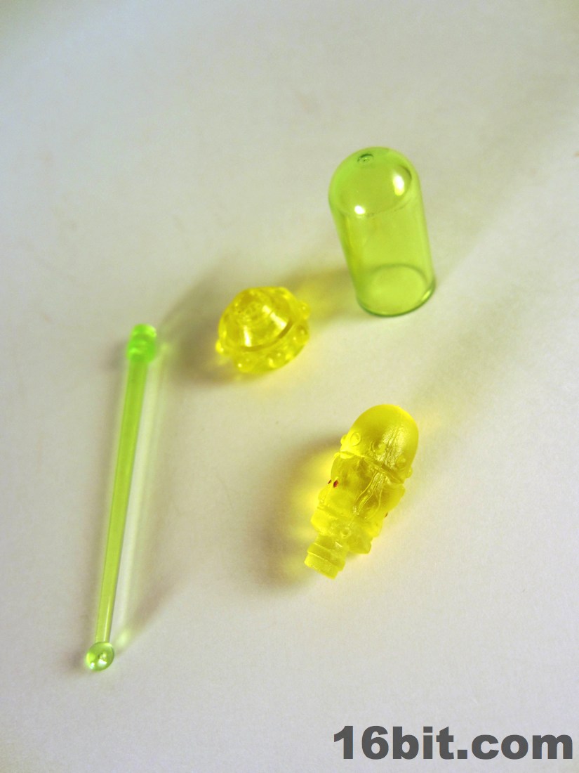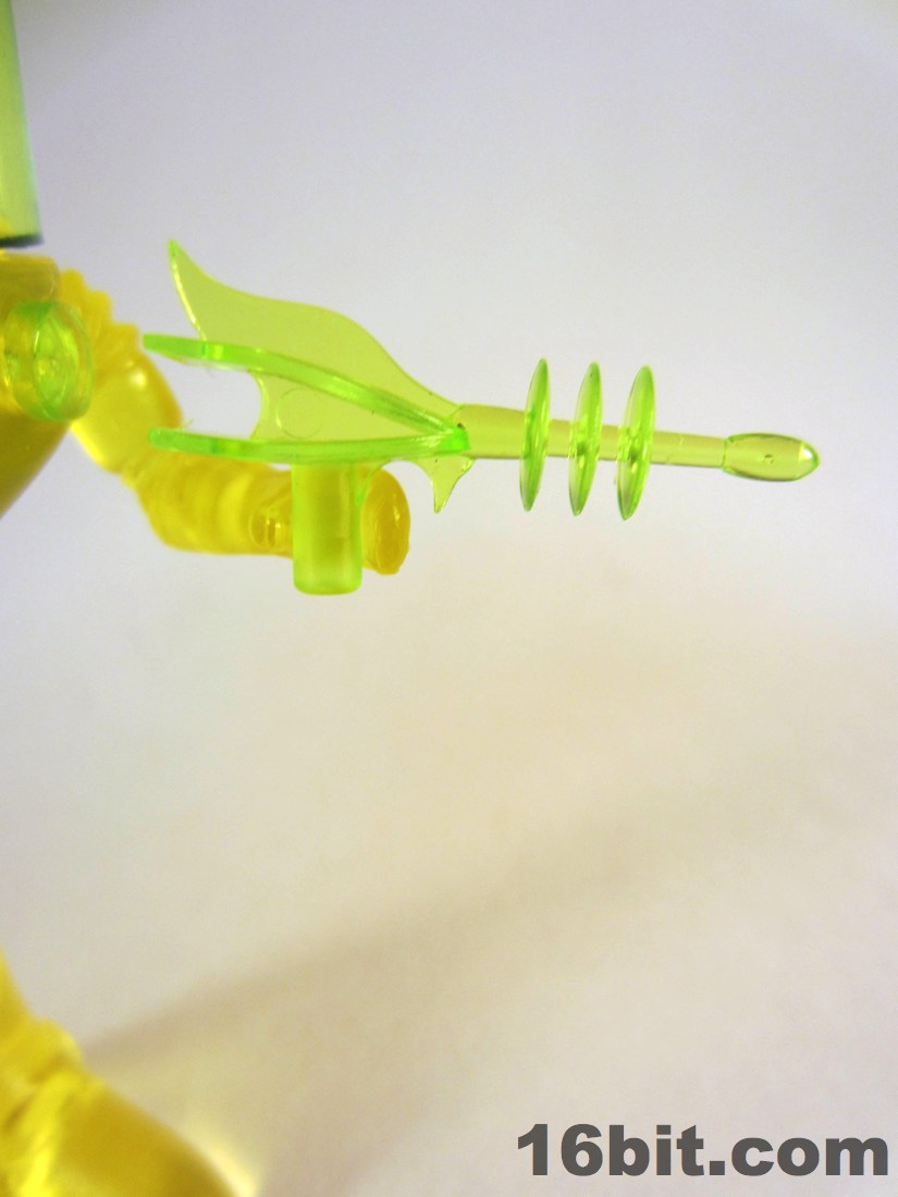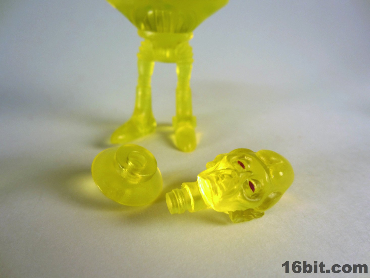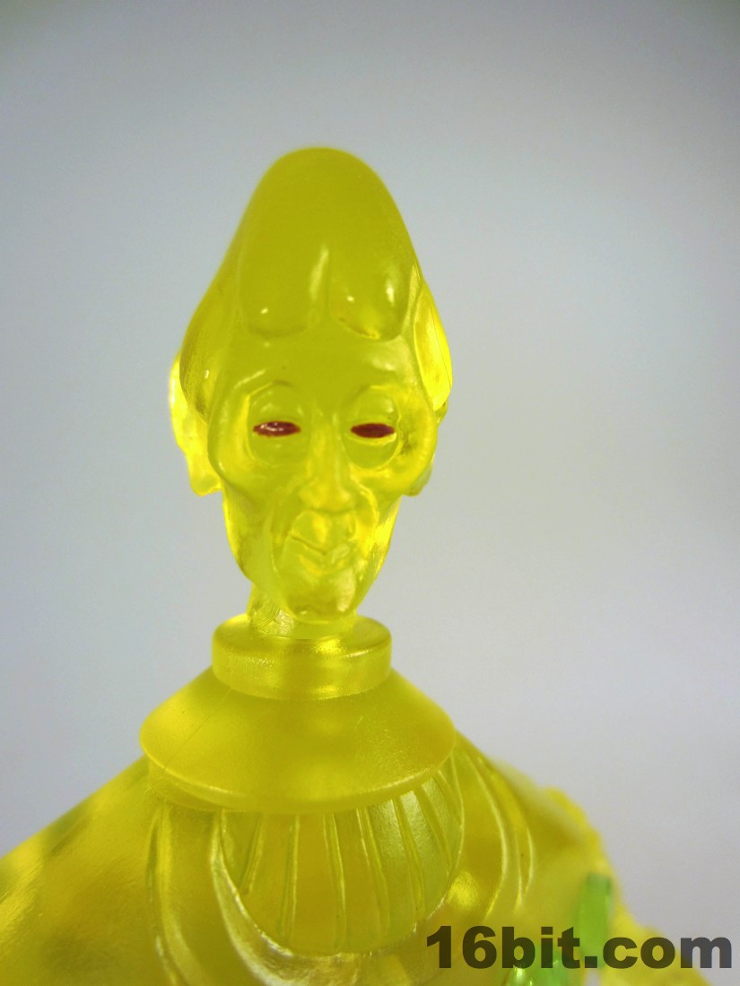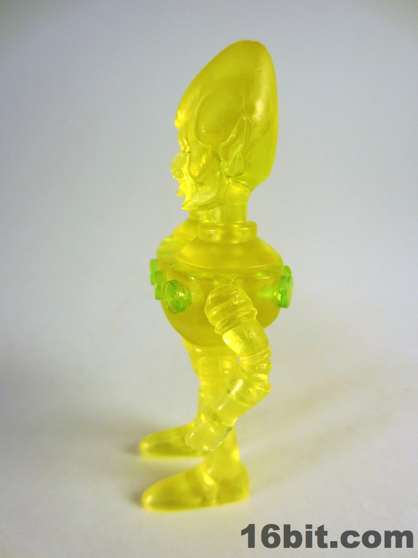 As always, the figure may be split apart and reconfigured through the use of Glyos plugs. Like Alpha 7 last year, the hands and feet use a proprietary smaller Glyos plug which I have yet to see used on any other figures. There's a preposterously high piece count here, with the staff alone being made of a helmet, a double-faced head, a pole, and a base that holds the whole thing together. Instead of painting sculpted round dots on the figure's body, each green circle is a removable Glyos plug rendered in clear green ABS plastic. Even his raygun is sculpted in amazing detail, with fins and emitters coming together to make something that's truly out of this world, or to be more precise, out of the late 1960s.