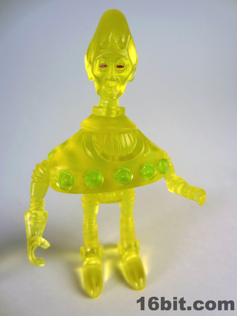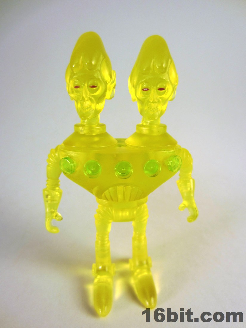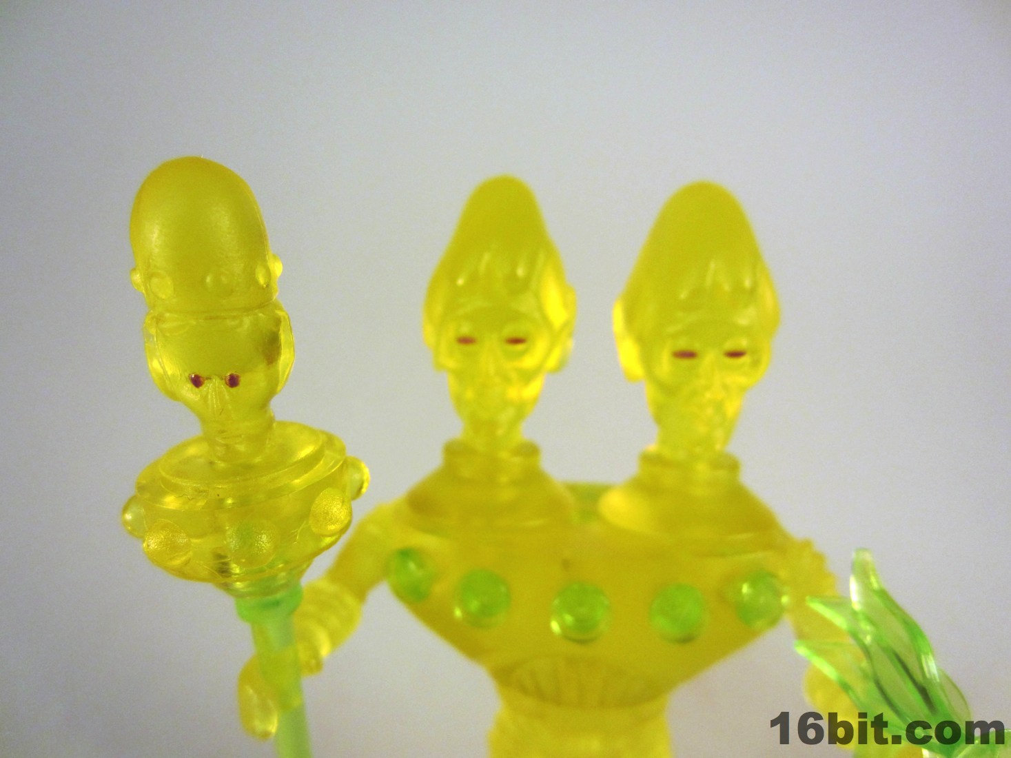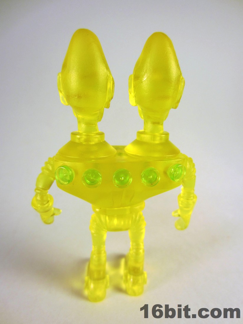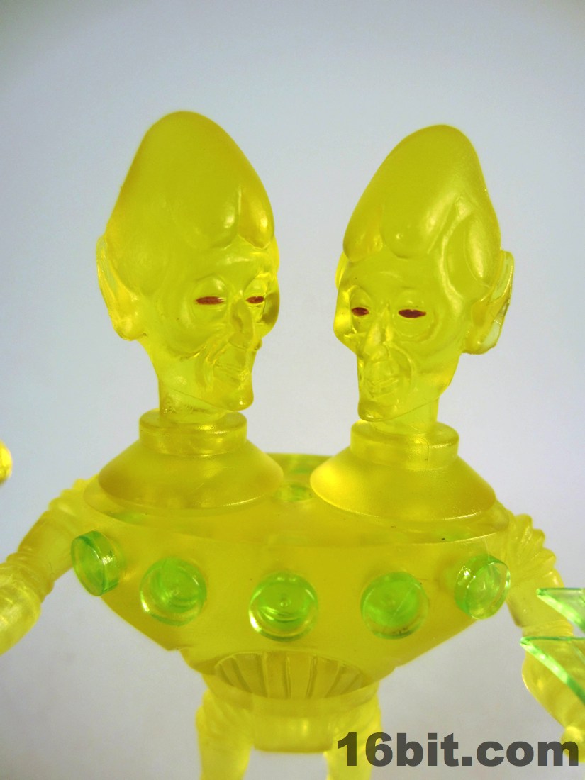 Four Horsemen Outer Space Men Alpha Phase Gemini Action FigureCast out of a paler than usual yellow plastic, this figure isn't an exact match for 2010's New York Comic Con Inferno or 2011's New York Comic Con Commander Comet, but it's close. The big boots do a great job of keeping him upright, and there's very little paint on the figure. Each face has 2 painted purple dots including the head on the staff, for a grand total of eight small purple dots.
