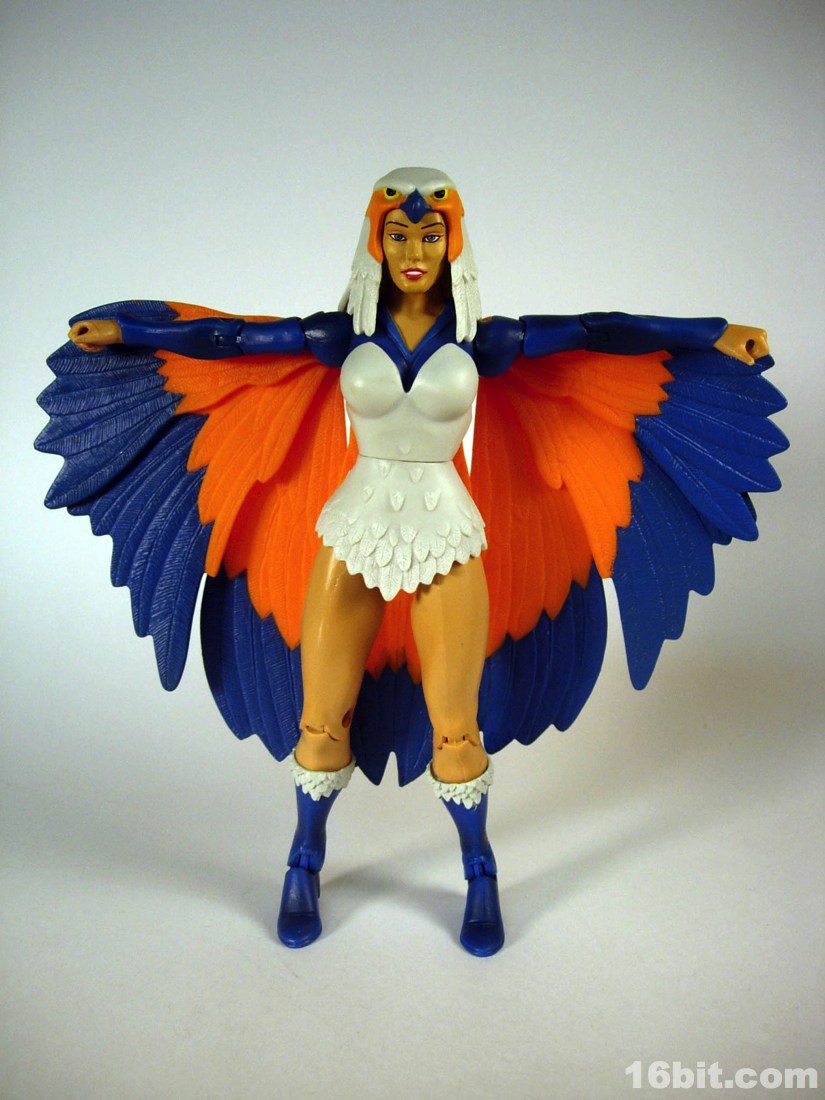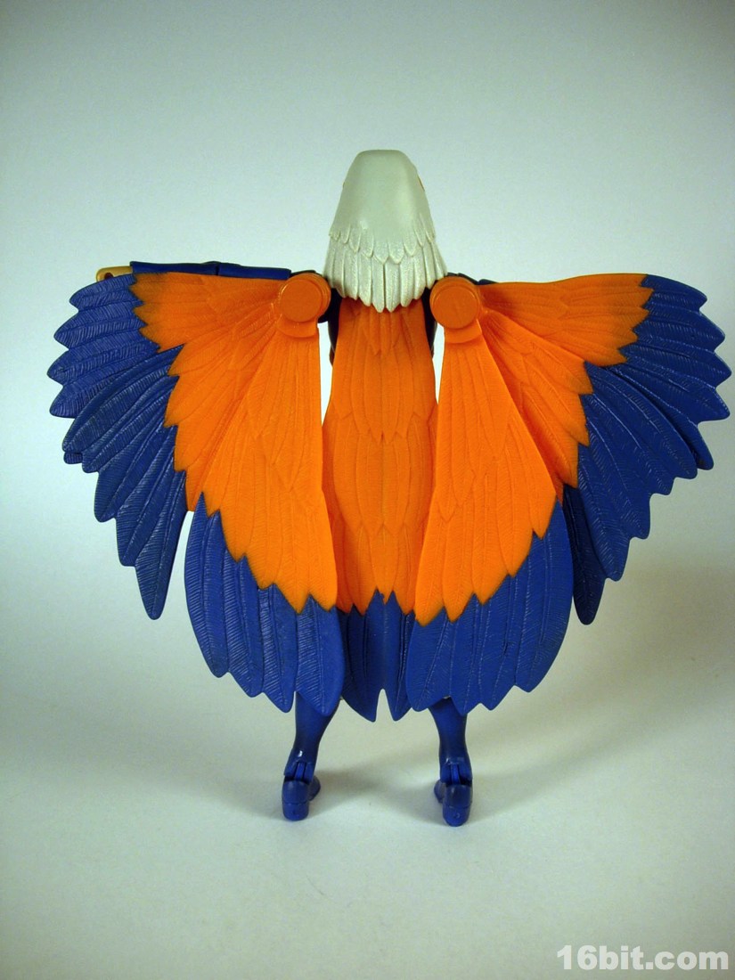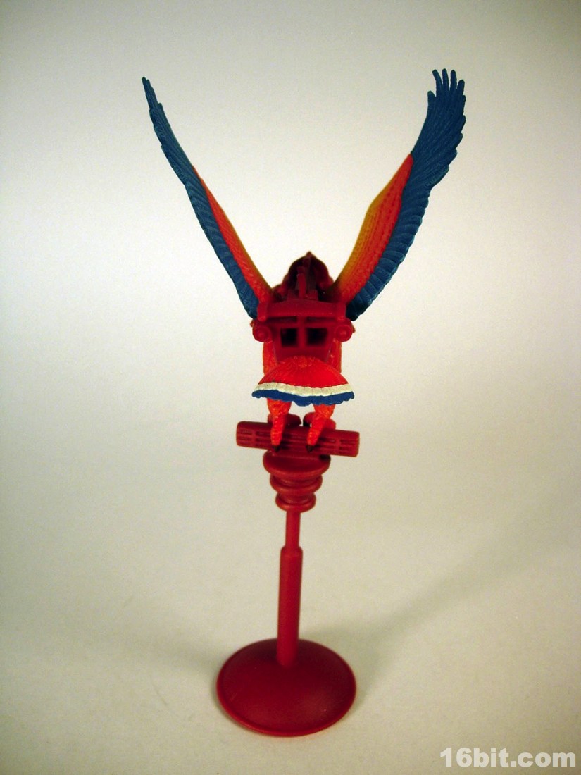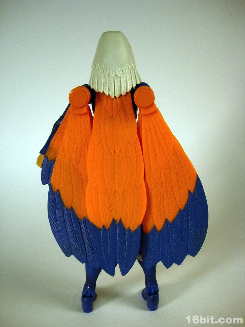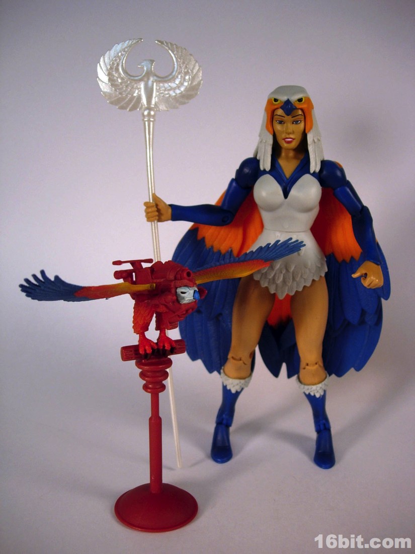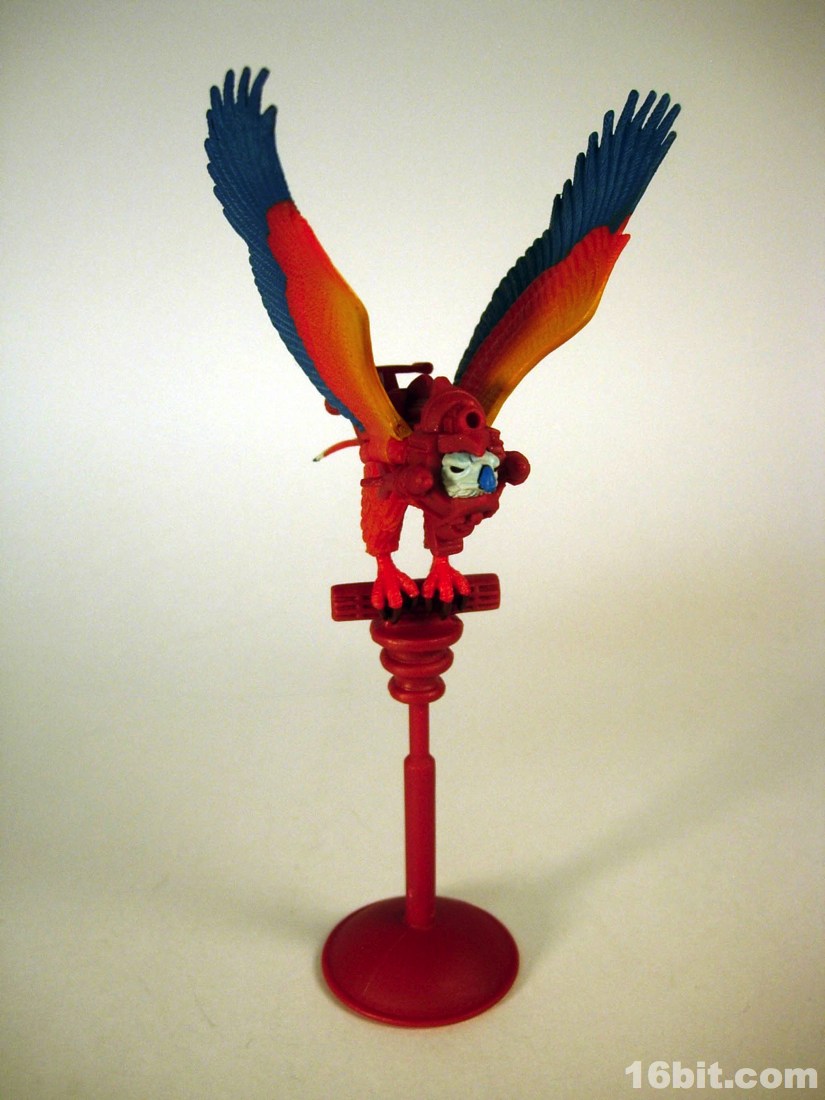 Mostly made of new parts, the Sorceress has a swell sculpt with tons of features which were the kind of things most toy fans would half-ass in the 1980s. Go ahead and take a look at bird toys from that era-- maybe you got a few feathers, and had to imagine the rest. The Four Horsemen sculpted dozens (if not hundreds) of feathers on this figure, with coloring similar to the original cartoon. Her articulation is good, but not great. The range of movement is pretty nice, but there are these strange wings which can get in the way. Granted, I don't have a better way of doing it, but she has these big pegs on the back of her shoulders where the wings fold over, and fall to display like in the pictures you see here. For a display piece, she's great. If you ever want her to do gesturing or combat, they tend to get in the way. While most figures in the line are pretty great no matter what you want to do with them, the Sorceress' functionality dictates her form on your shelf. You don't have as many options.