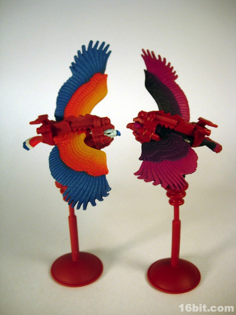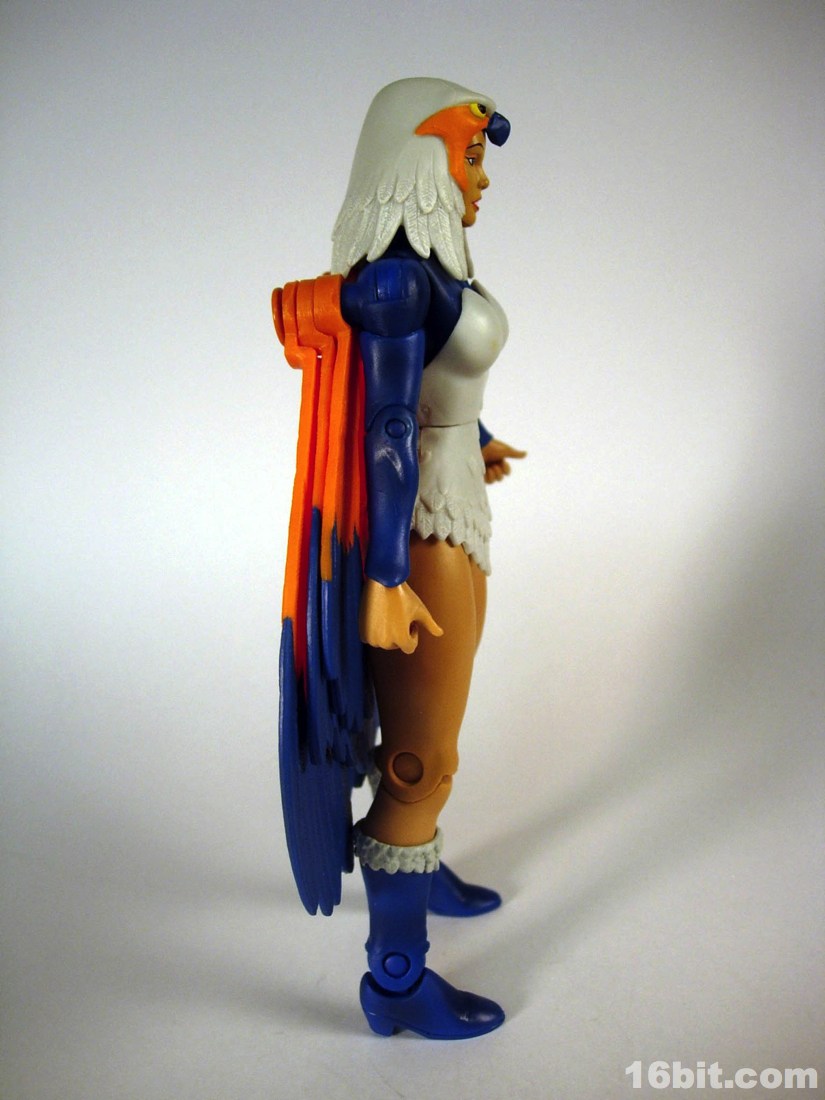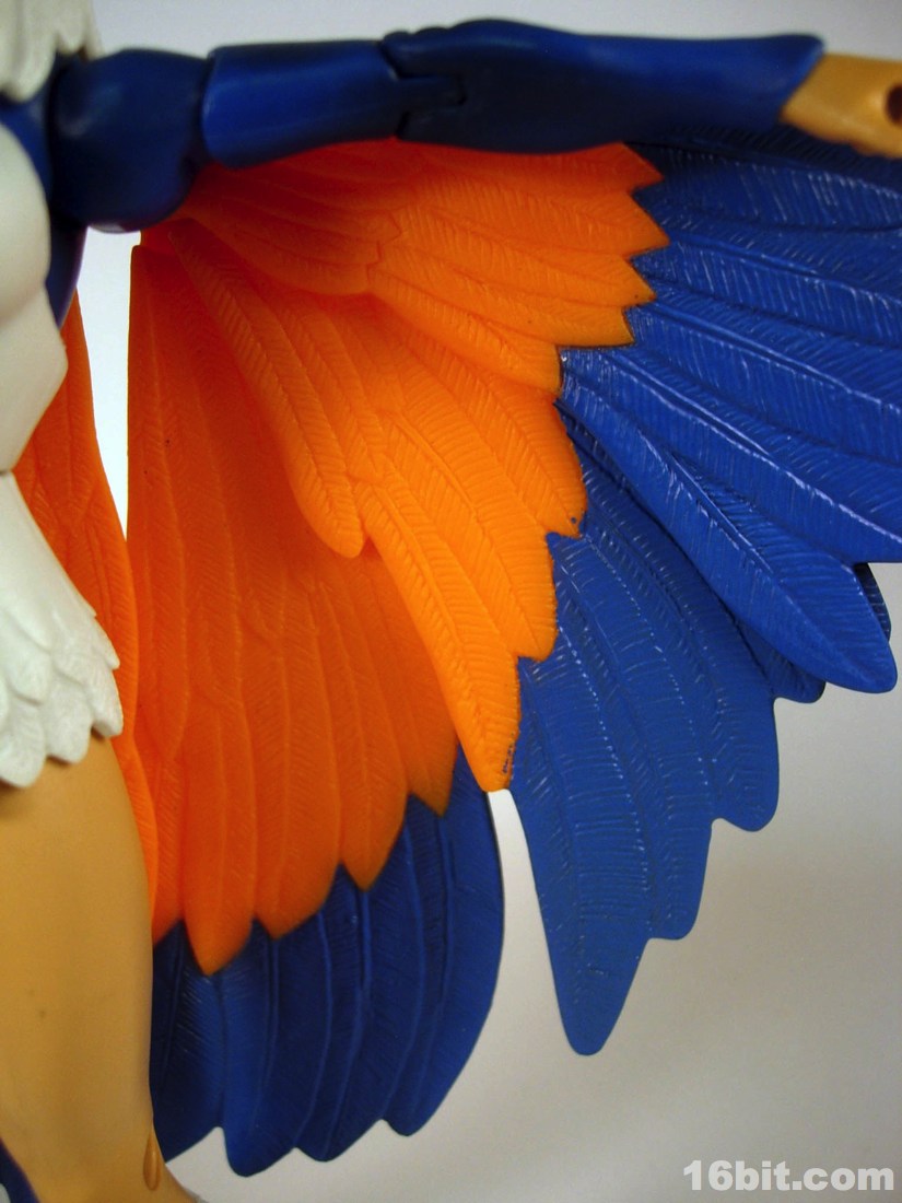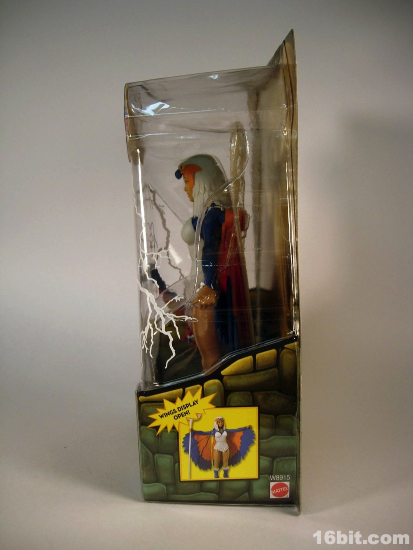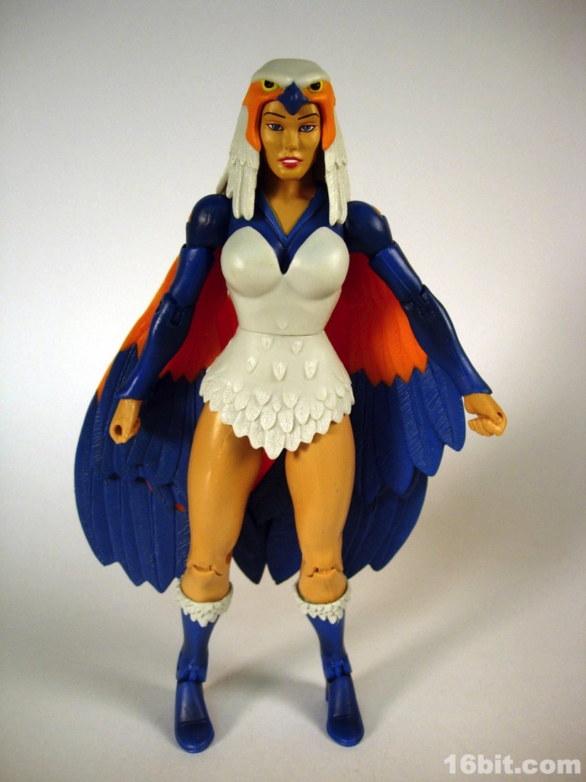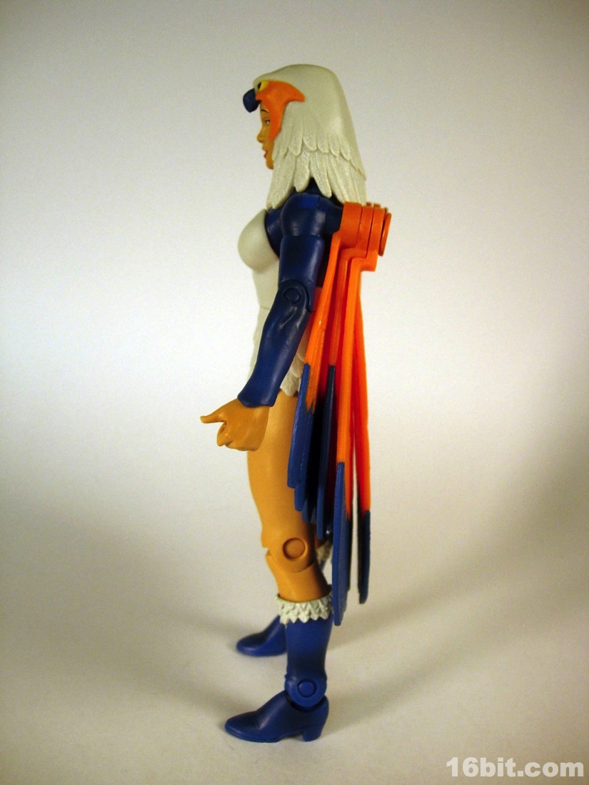 Mostly made of new parts, the Sorceress has a swell sculpt with tons of features which were the kind of things most toy fans would half-ass in the 1980s. Go ahead and take a look at bird toys from that era-- maybe you got a few feathers, and had to imagine the rest. The Four Horsemen sculpted dozens (if not hundreds) of feathers on this figure, with coloring similar to the original cartoon. Her articulation is good, but not great. The range of movement is pretty nice, but there are these strange wings which can get in the way. Granted, I don't have a better way of doing it, but she has these big pegs on the back of her shoulders where the wings fold over, and fall to display like in the pictures you see here. For a display piece, she's great. If you ever want her to do gesturing or combat, they tend to get in the way. While most figures in the line are pretty great no matter what you want to do with them, the Sorceress' functionality dictates her form on your shelf. You don't have as many options.