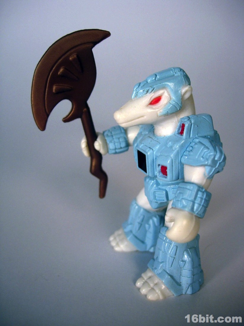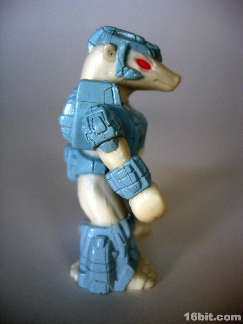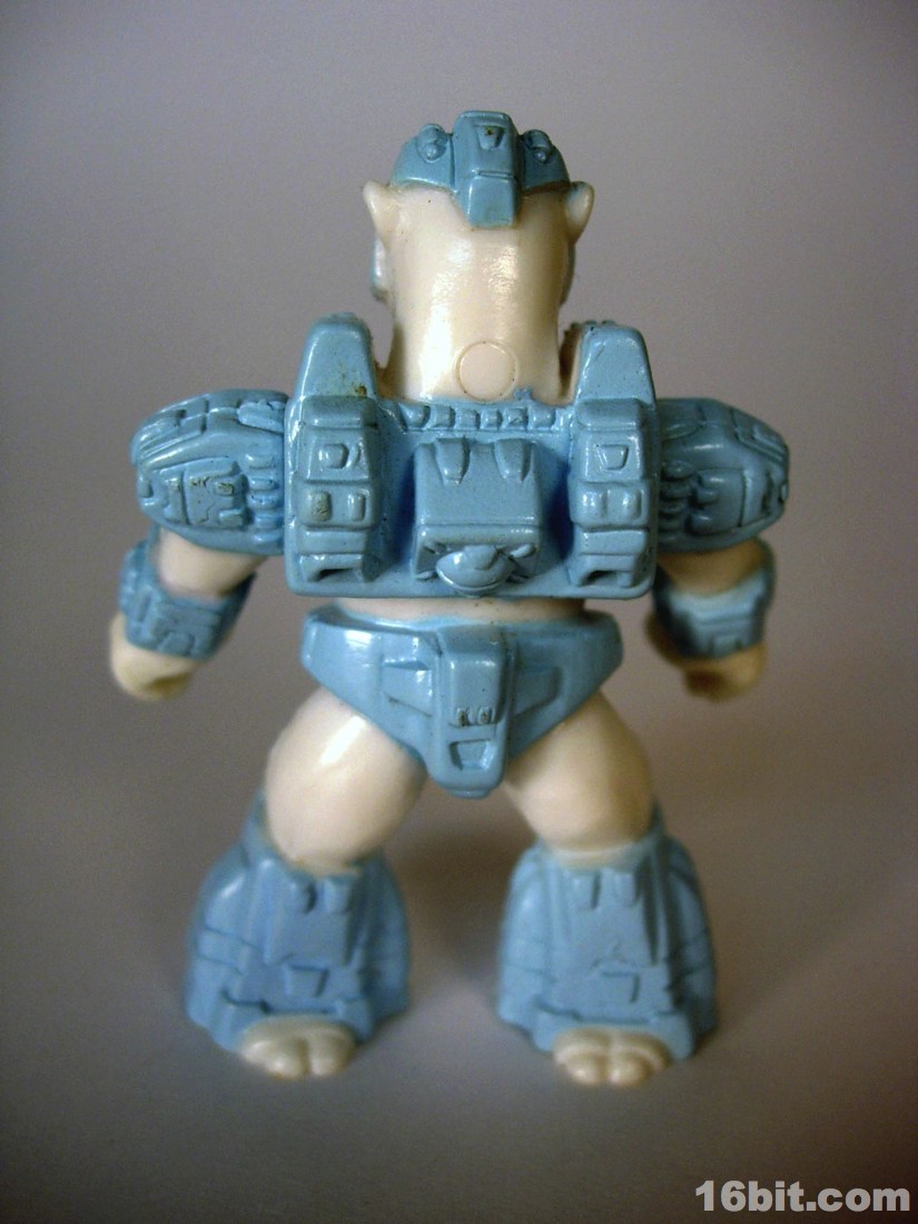 With two points of articulation, the figure can stand with no problems and holds his weapon just fine. He has a nifty smile, and tons of sculpted grooves in his armor. Red eyes really pop out of the head, and I would wager black eyes would have looked more adorable. (Note to Takara: if/when you do your dirt-cheap reissues, please redecorate the figure with black eyes and a black nose.)