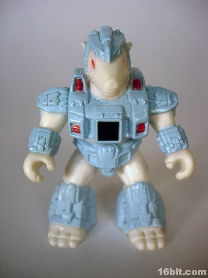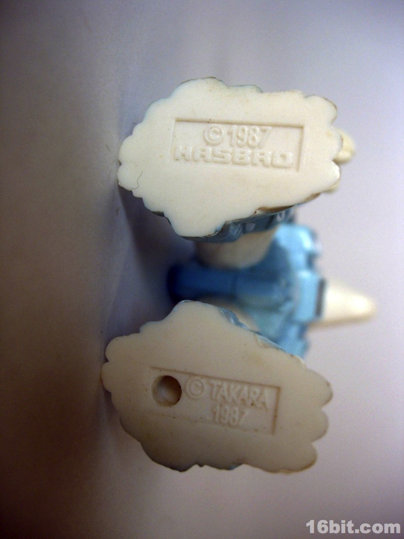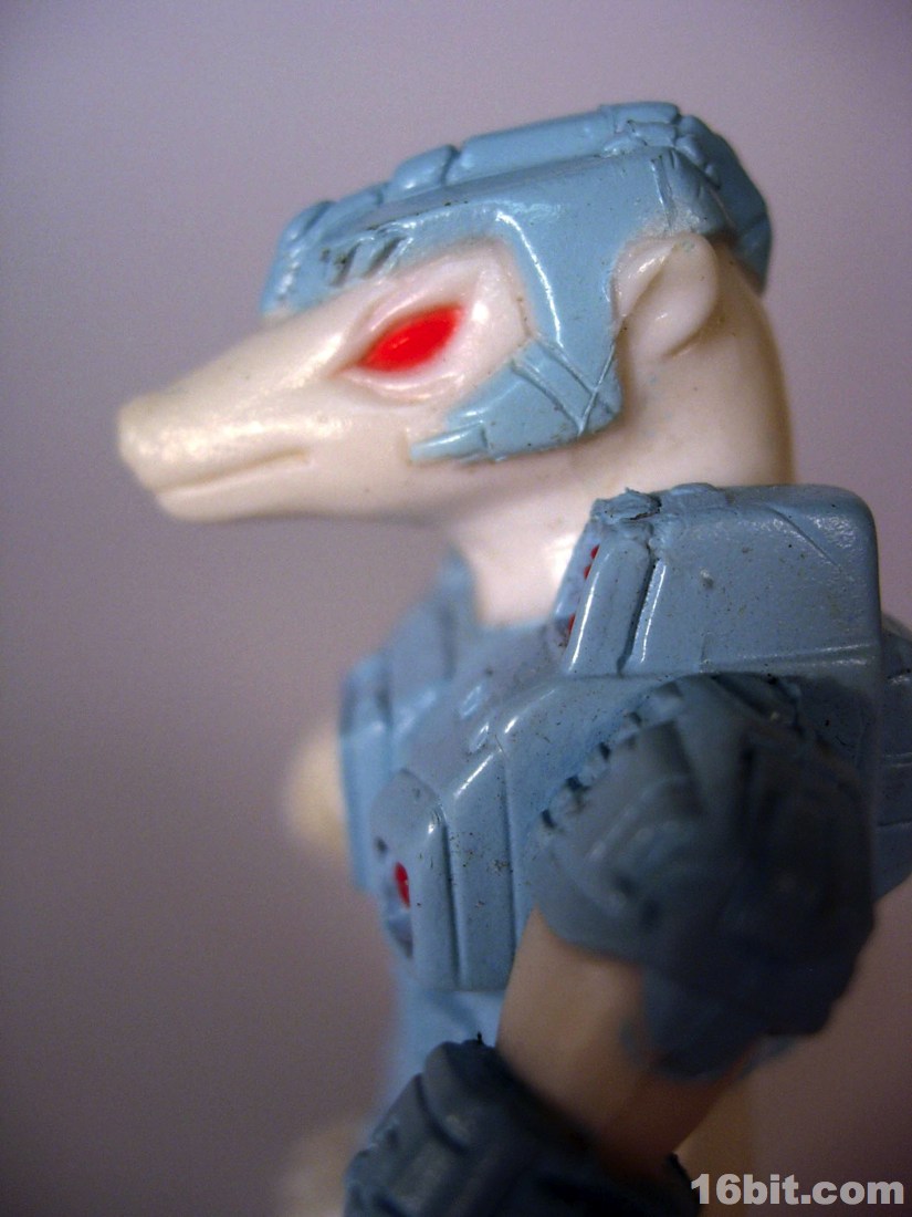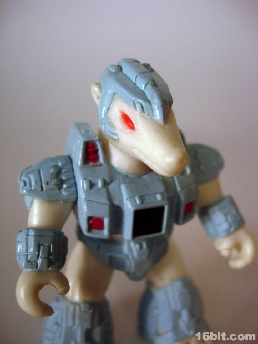 With two points of articulation, the figure can stand with no problems and holds his weapon just fine. He has a nifty smile, and tons of sculpted grooves in his armor. Red eyes really pop out of the head, and I would wager black eyes would have looked more adorable. (Note to Takara: if/when you do your dirt-cheap reissues, please redecorate the figure with black eyes and a black nose.)