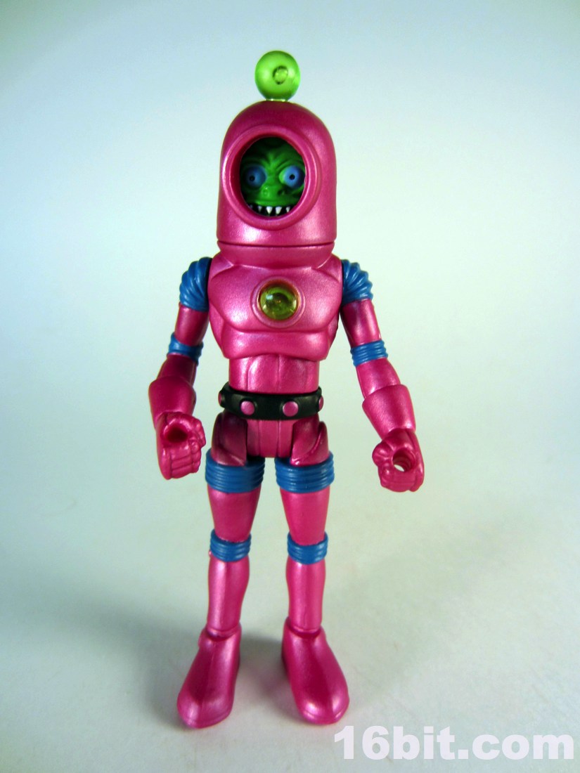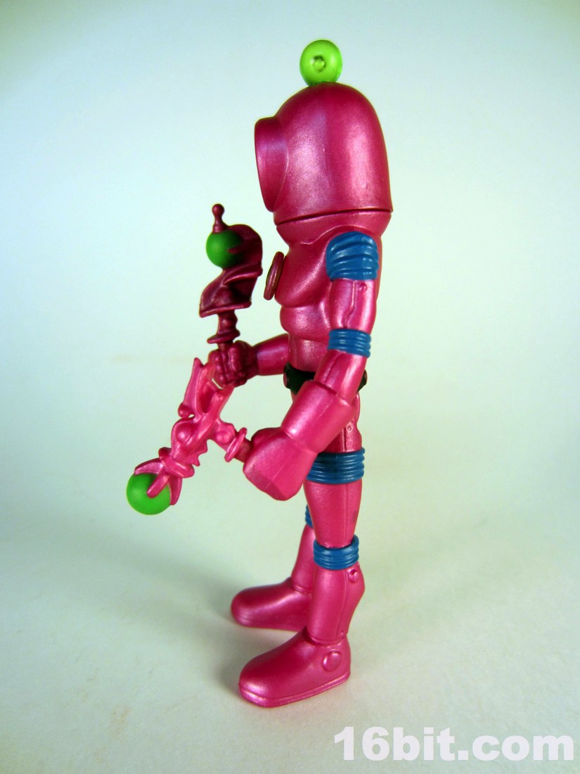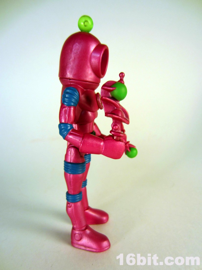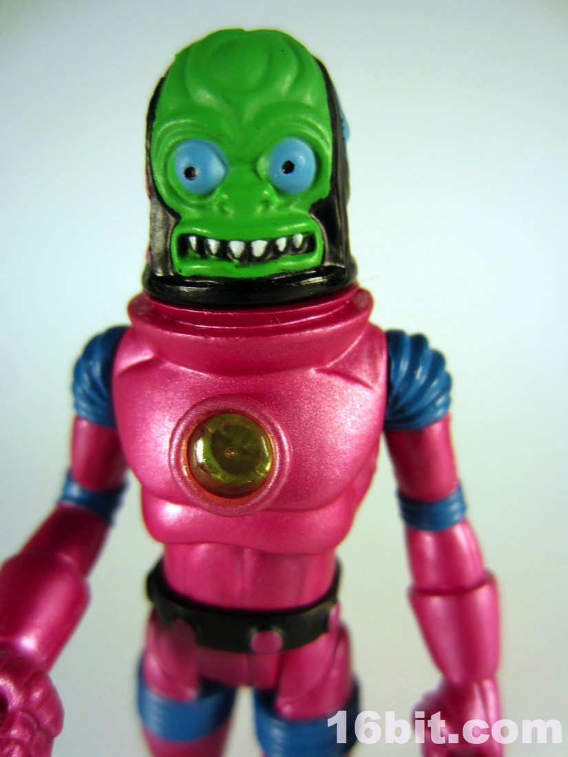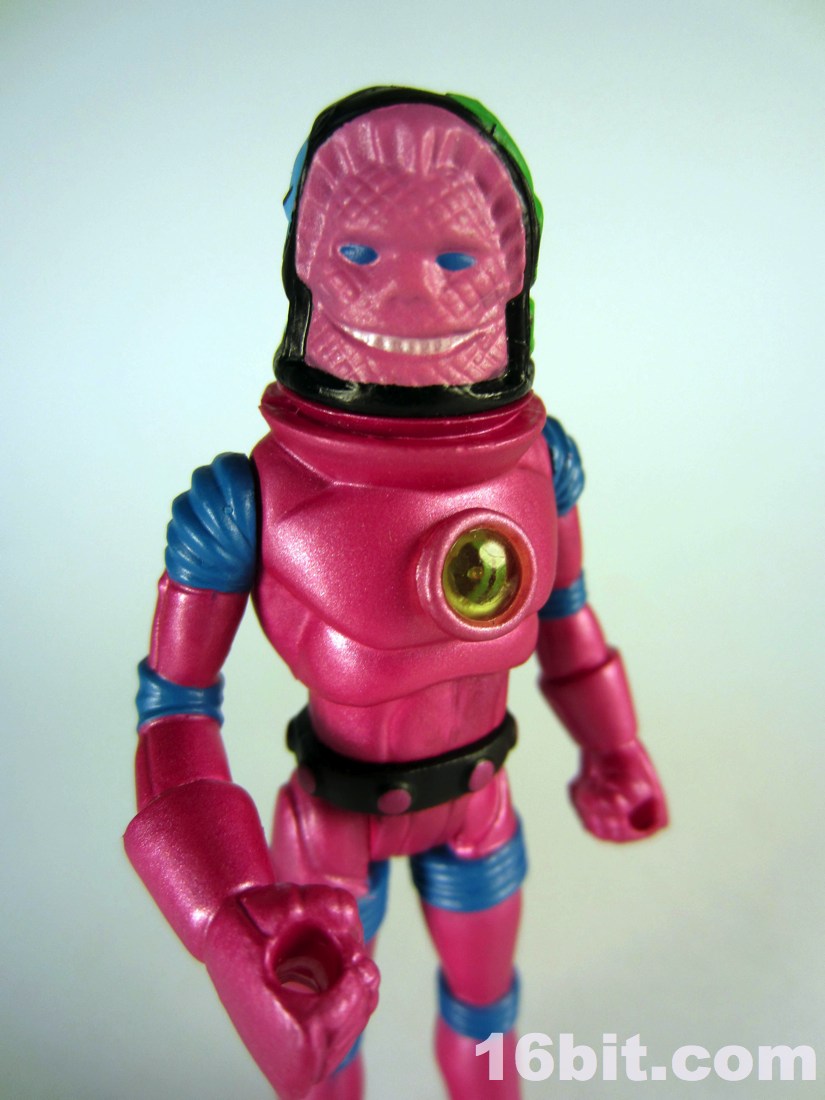 With about 20 parts when fully disassembled, this figure is more or less the same thing you've come to love and expect. The key difference, of course, is the insanely awesome paint job that should do a fine job of blinding your friends when they walk in the room. This time around, the "alien" head is blue, the "ape" head is green, and the "reptile" head is pink. His "button" on his chest plus the knob on his helmet are clear green, with the accessories rendered in the same pink plastic with painted green elements.
