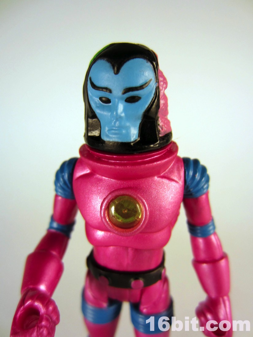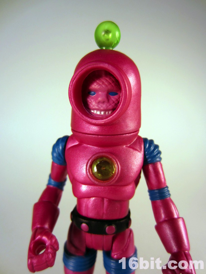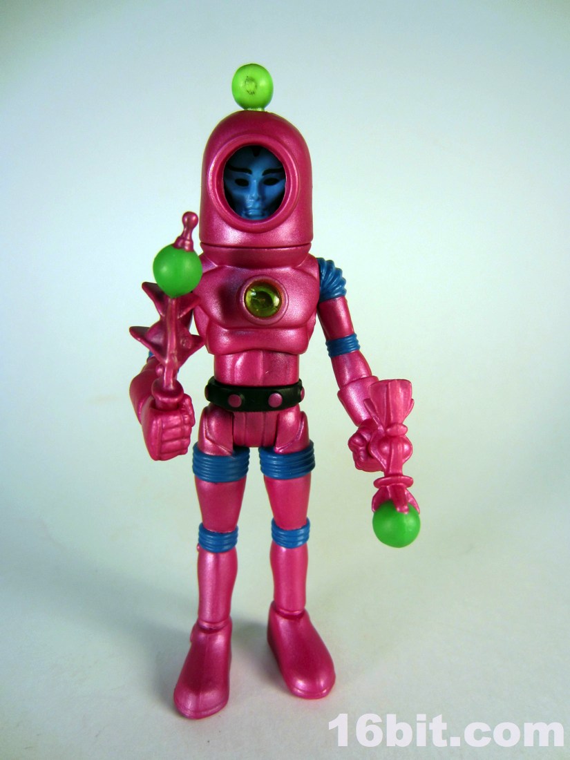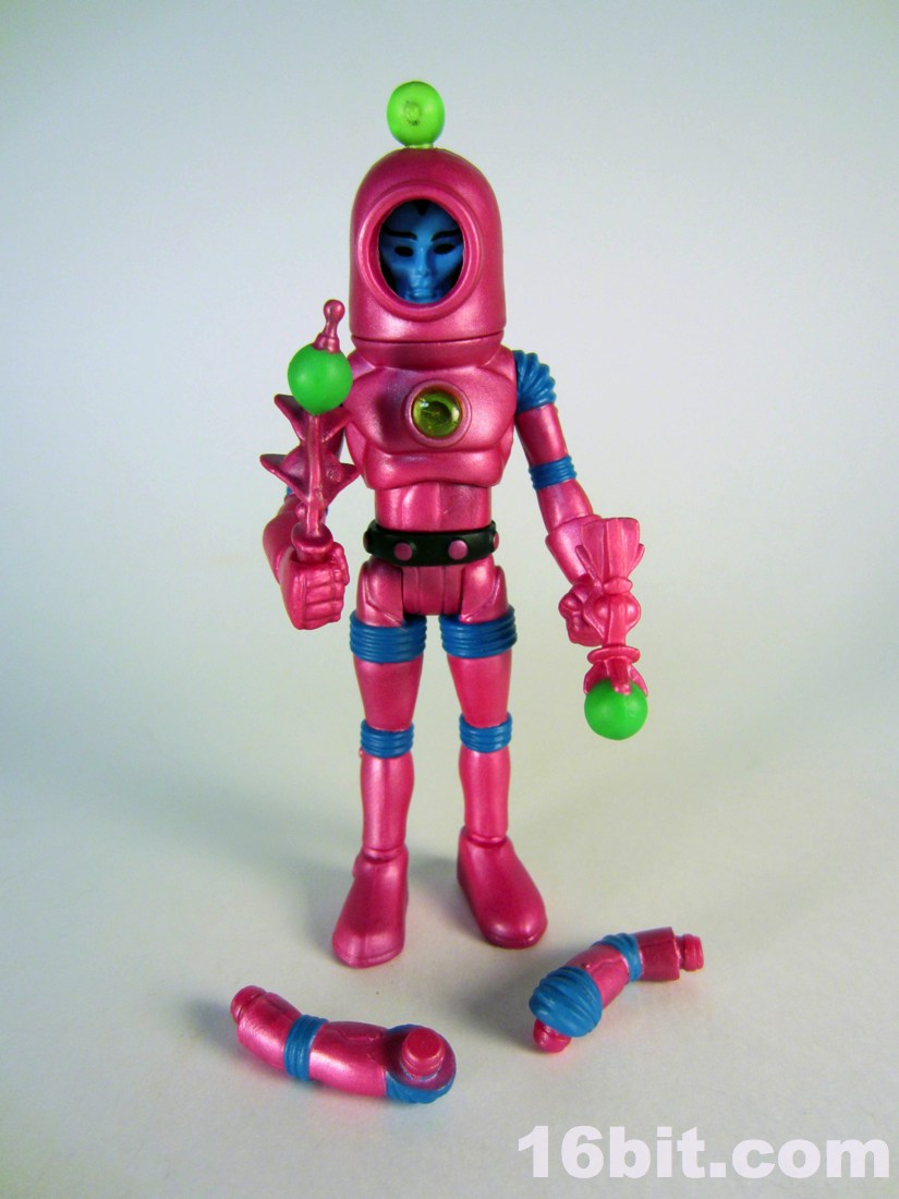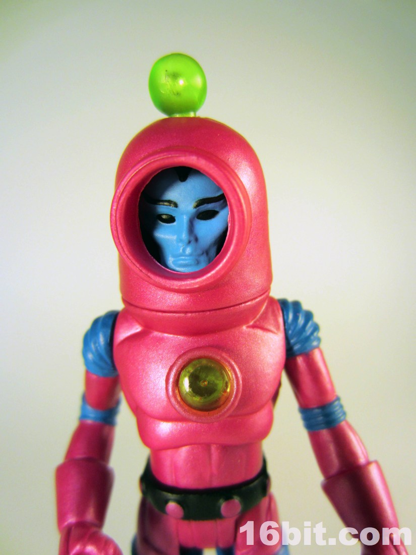 With about 20 parts when fully disassembled, this figure is more or less the same thing you've come to love and expect. The key difference, of course, is the insanely awesome paint job that should do a fine job of blinding your friends when they walk in the room. This time around, the "alien" head is blue, the "ape" head is green, and the "reptile" head is pink. His "button" on his chest plus the knob on his helmet are clear green, with the accessories rendered in the same pink plastic with painted green elements.