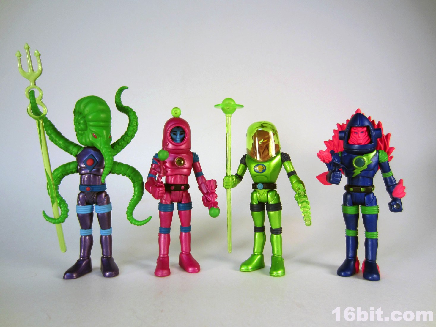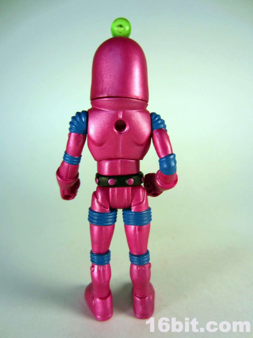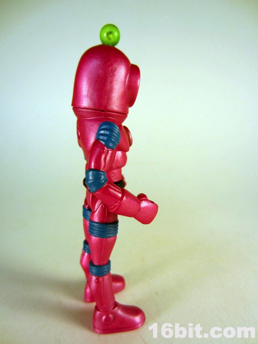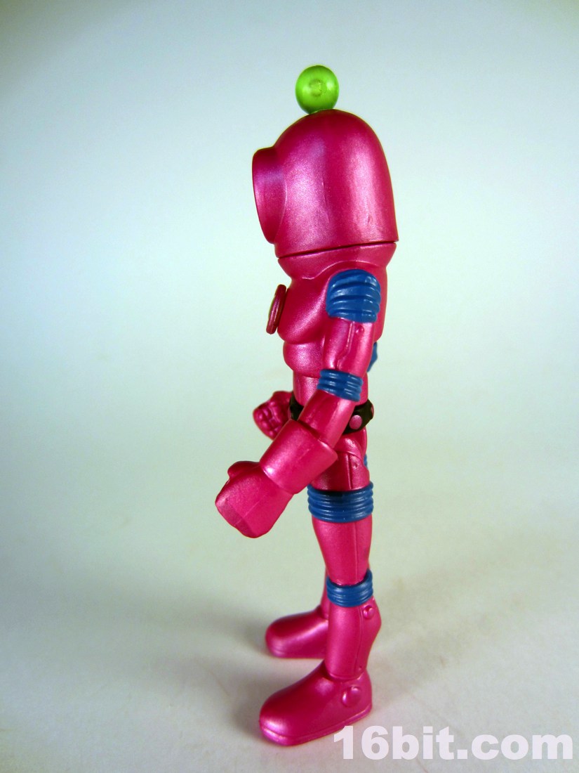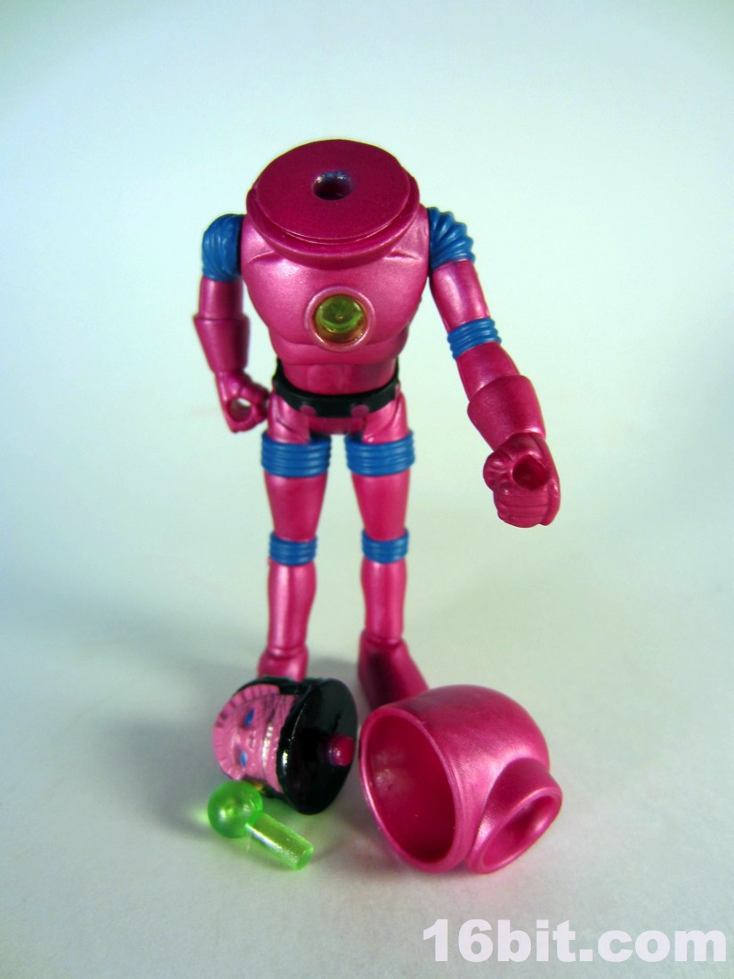 With about 20 parts when fully disassembled, this figure is more or less the same thing you've come to love and expect. The key difference, of course, is the insanely awesome paint job that should do a fine job of blinding your friends when they walk in the room. This time around, the "alien" head is blue, the "ape" head is green, and the "reptile" head is pink. His "button" on his chest plus the knob on his helmet are clear green, with the accessories rendered in the same pink plastic with painted green elements.
