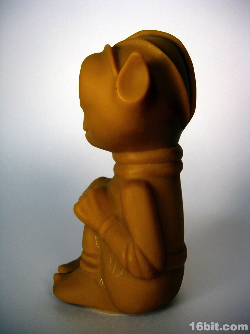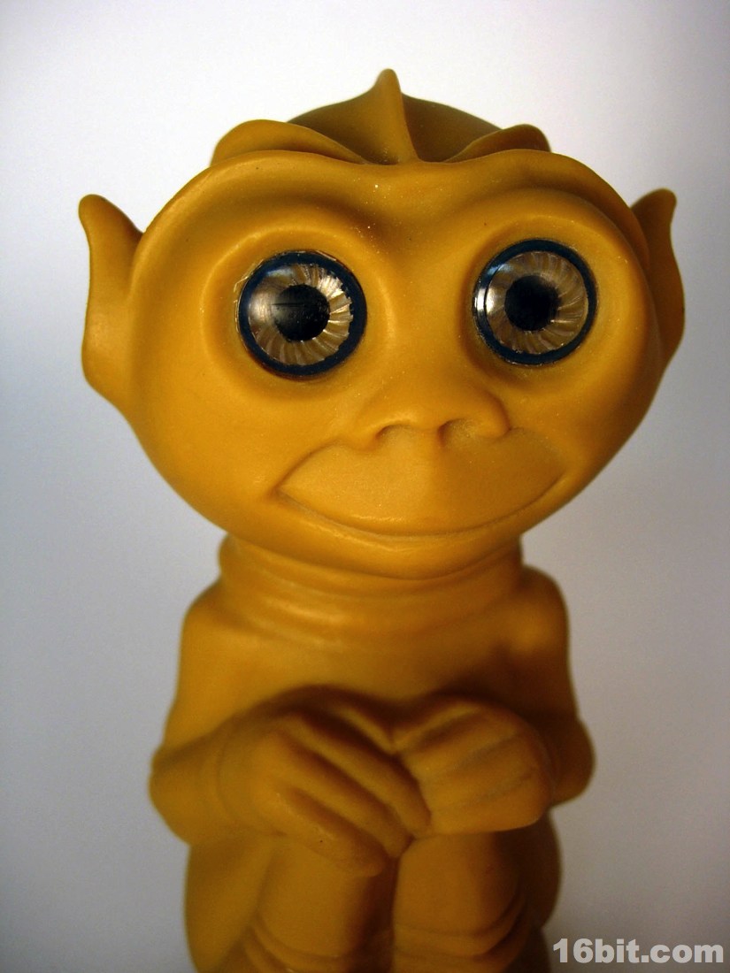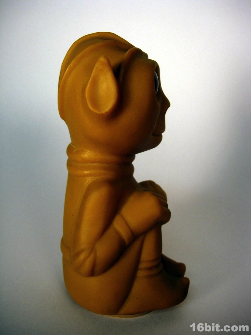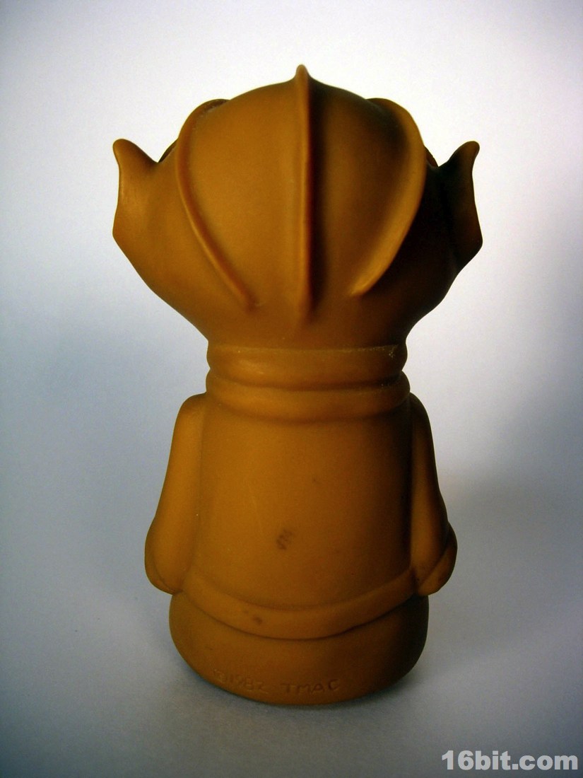 This figure feels like a kind of a toy that would probably make the designer/urban folk soil themselves in glee. It's ahead of its time, feeling like a cross between a piggy bank and a collectible figure. There's no coin slot, and no limbs to speak of, so really it's just a bizarre creature in a line of aliens who are all named after humans, but backward. "Captain Steve," get it? This 4 1/2-inch tall alien is sculpted crouching, or perhaps sitting, and features clear blue eyes on a tan body. Due to the color of plastic used, the total lack of paint never even registered with me-- the light and shadows filled in the detail nicely, making his smile, his nose, and various rings on his costume pop nicely. He has curly shoes (or boots), pointy ears, and various crests on the back of his head. It looks more than a little like a genie, while other creatures in this line more closely resembled lizards or animals than aliens from another world.