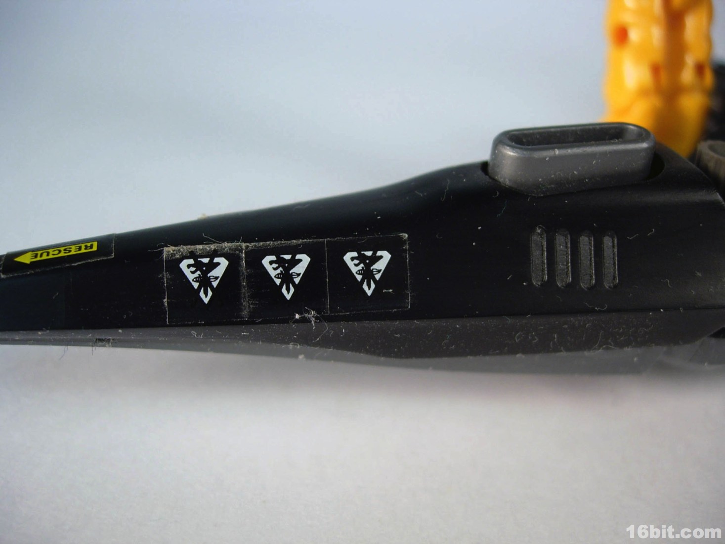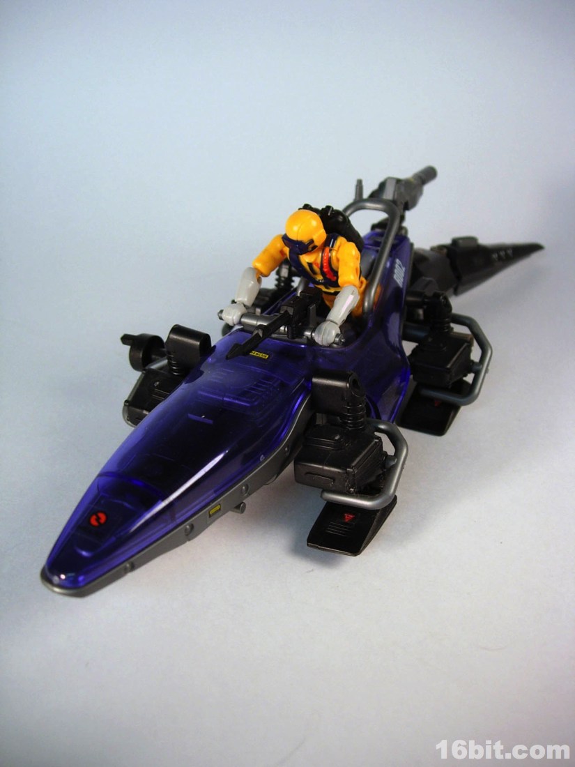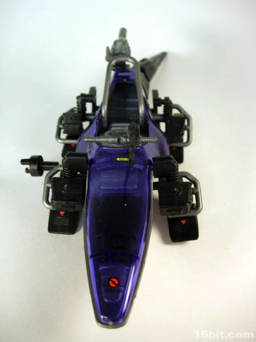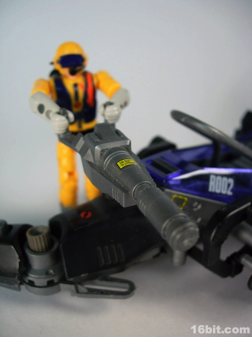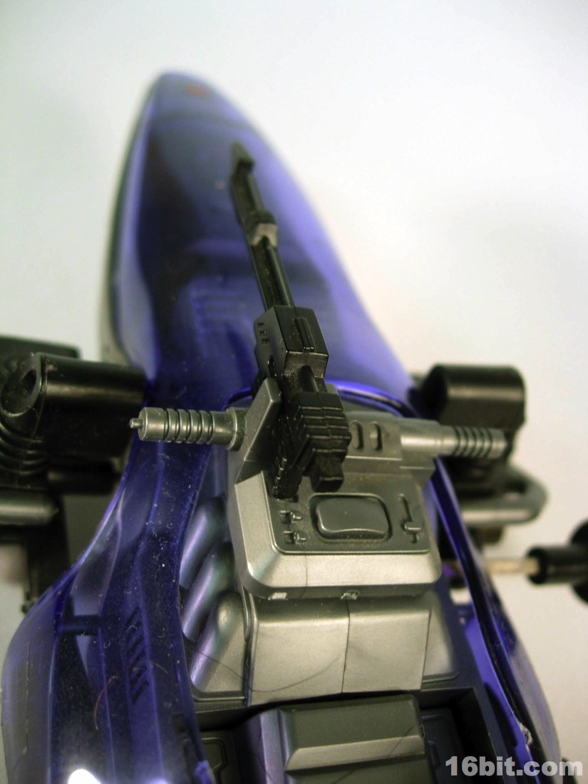 The robotic vehicle is inspired by an alligator, albeit an electronic futuristic one. The figure lays on his belly to reach the controls, which also have a slot for the figure's dart gun weapon. The dark blue, clear plastic shield covers the figure's body and is a sharp contrast to the mostly silver robotic vehicles sold in Japan. He has a wind-up motor, posable tail, and-- this is what really gets me happy-- an extra tail gun. The tail gun is cool because it can be rotated and the figure can "grip" it and "shoot," making the vehicle something like a bunker. Amping up the fun factor, the tail on Neptune has Zenevas kill marks, and a HELIC Combat Team symbol on its head complete with the name spelled out. I just like that sort of detail.