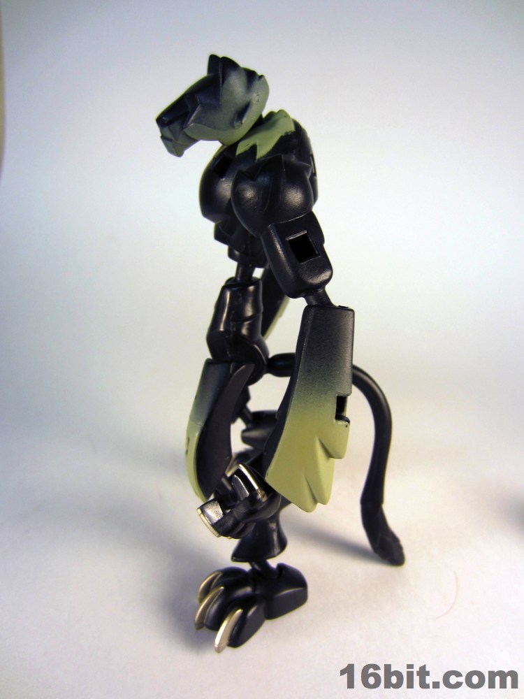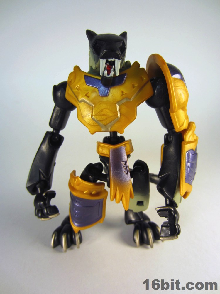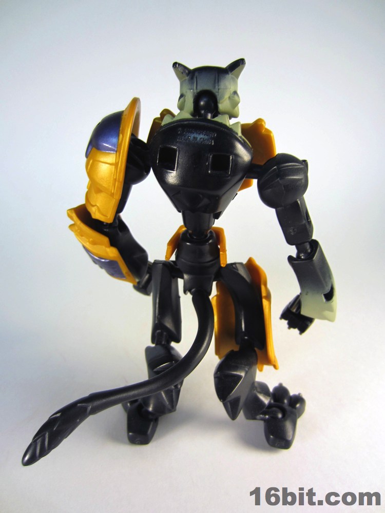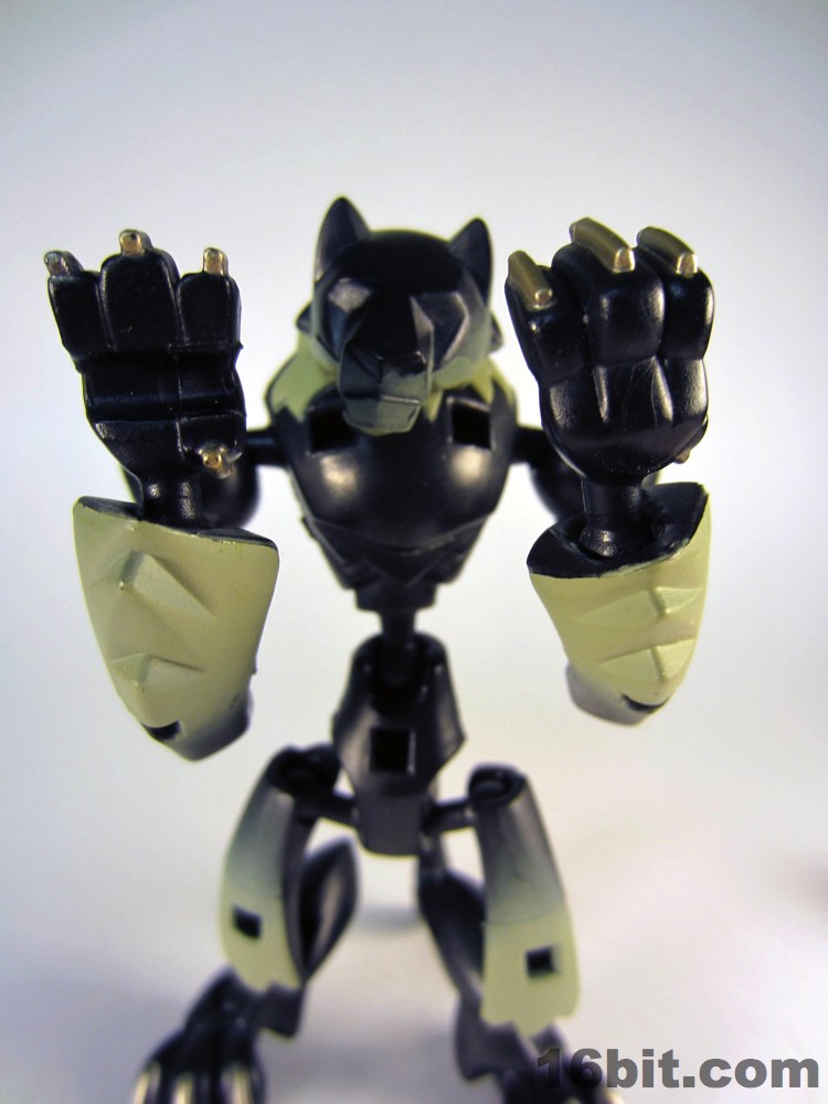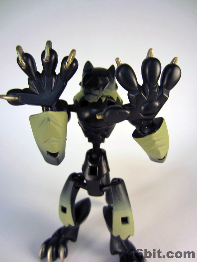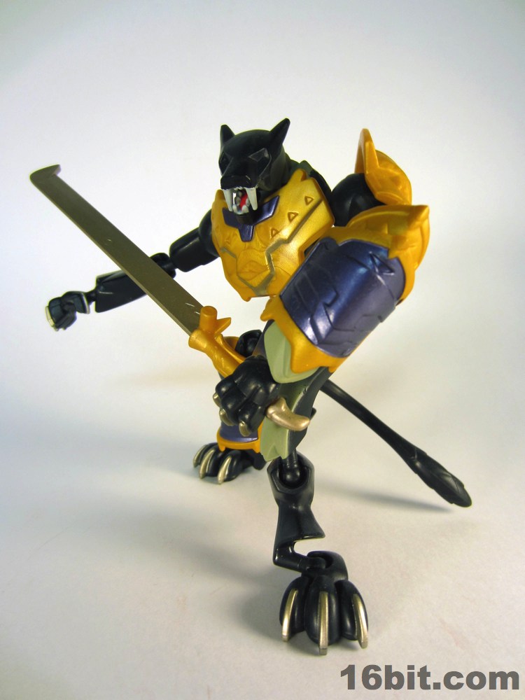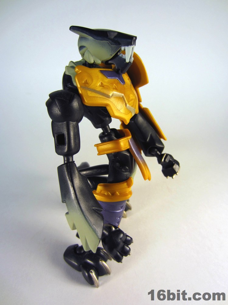 Like most Xevoz figures, he has sizable feet and stiff joints enabling him to assume a variety of poses. Not only can he stand and sit, but this figure can be placed on all fours to look like some sort of a panther. Given most action figures can barely sit down without problems, it's amazing to see such a simple, yet well-thought-out design emerge out of the 2000s. Hasbro reduced the poseability on some figures while increasing articulation, although this line stood out as being sort of a freak in 2004. With 14 points of articulation-- 16 if you count the tail and optional opening jaw-- there really wasn't anything else like it at the time and I would argue nothing since has surpassed it in terms of fun, customization, bang for the buck, or originality. Well, maybe not that last one-- Hasbro stirred a big pot of toy tropes to make this line, which is part of what makes it so great.