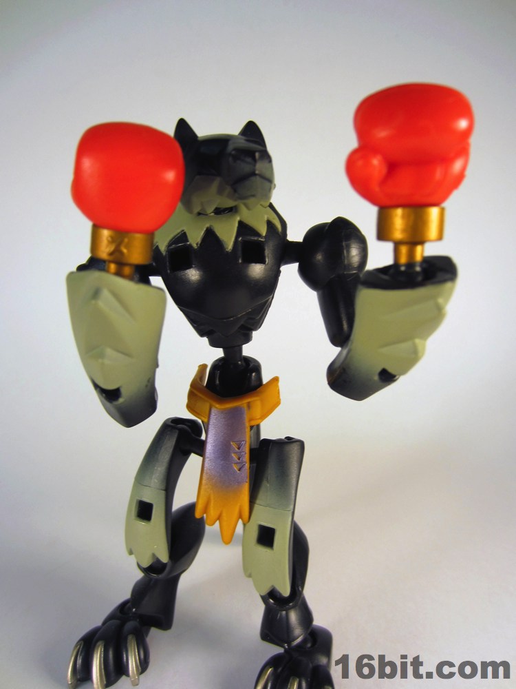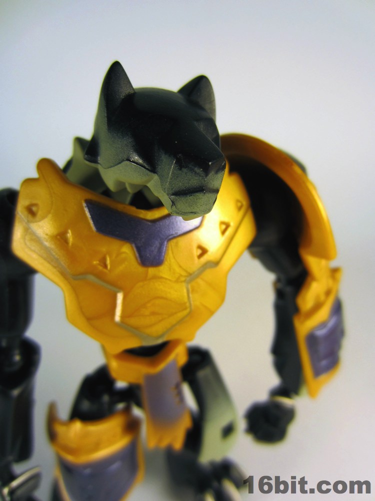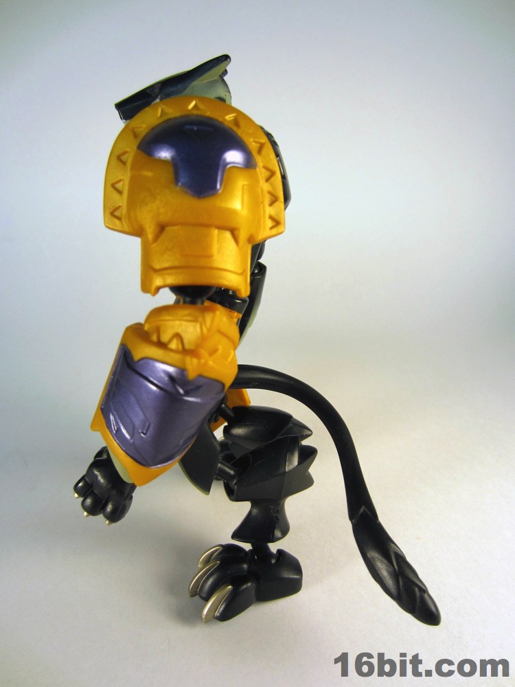 The black plastic figure has metallic claws and a light dusting of a brown color to add some "fur" to the relatively bare buck. Optional stickers were included but are in a box somewhere-- I opted not to use them. Two heads, three sets of hands, and a suit of armor were included to let you customize this figure or swap parts with other releases. The boxing gloves were a "gag" part, as each figure in the line tended to have one piece purely as a joke. Razorclaw's armor was molded in a gold color with purple painted highlights, and it fit right on the body using a simple system of holes and pegs, which is similar to how you got to be here. The amount of sculpting is pretty light, with vague shapes implying fur and slopes for eyes. It's highly stylized and has more in common with designer toys than most of what Hasbro sells... perhaps that's why it failed to catch on?