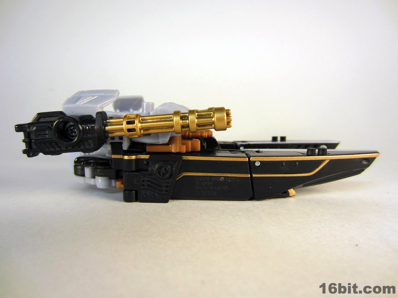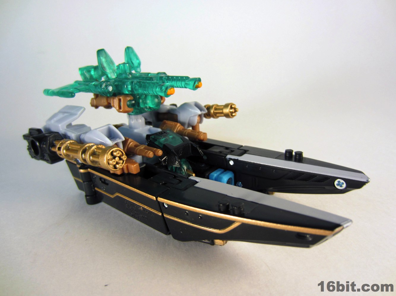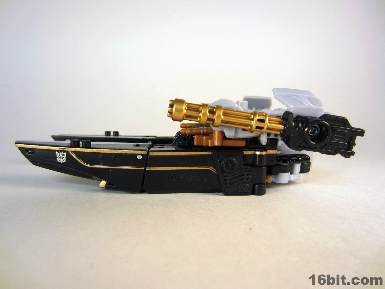 As a boat, it's a boat. It has two big guns on it and no action features to speak of, so it's sort of like the toys you probably grew up with, except with more bits and pieces. There's a Decepticon logo on one side and it's a sleek, mean looking water-based vehicle. It also feels more or less on par with the recent 2012 Generations Deluxe toys in terms of heft, which shows just how far we've fallen in terms of bang for the buck compared to how Asian manufacturing costs are catching up.