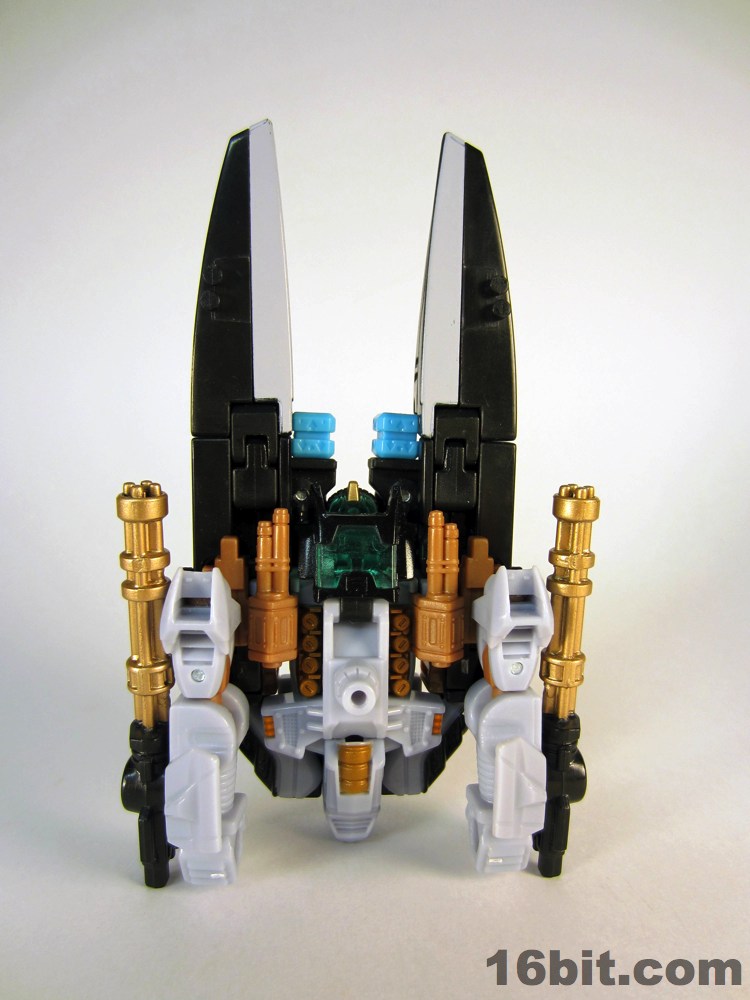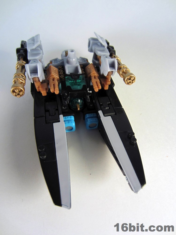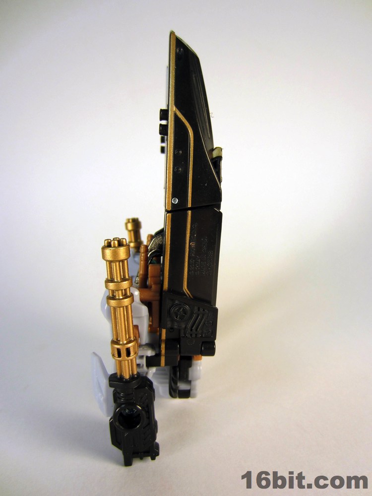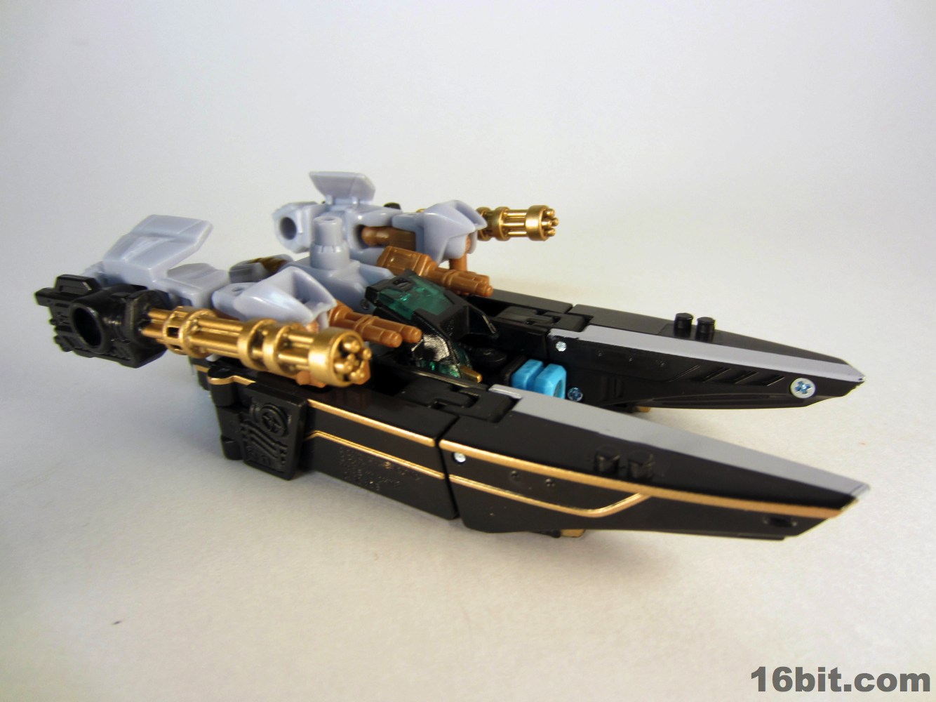 As a boat, it's a boat. It has two big guns on it and no action features to speak of, so it's sort of like the toys you probably grew up with, except with more bits and pieces. There's a Decepticon logo on one side and it's a sleek, mean looking water-based vehicle. It also feels more or less on par with the recent 2012 Generations Deluxe toys in terms of heft, which shows just how far we've fallen in terms of bang for the buck compared to how Asian manufacturing costs are catching up.