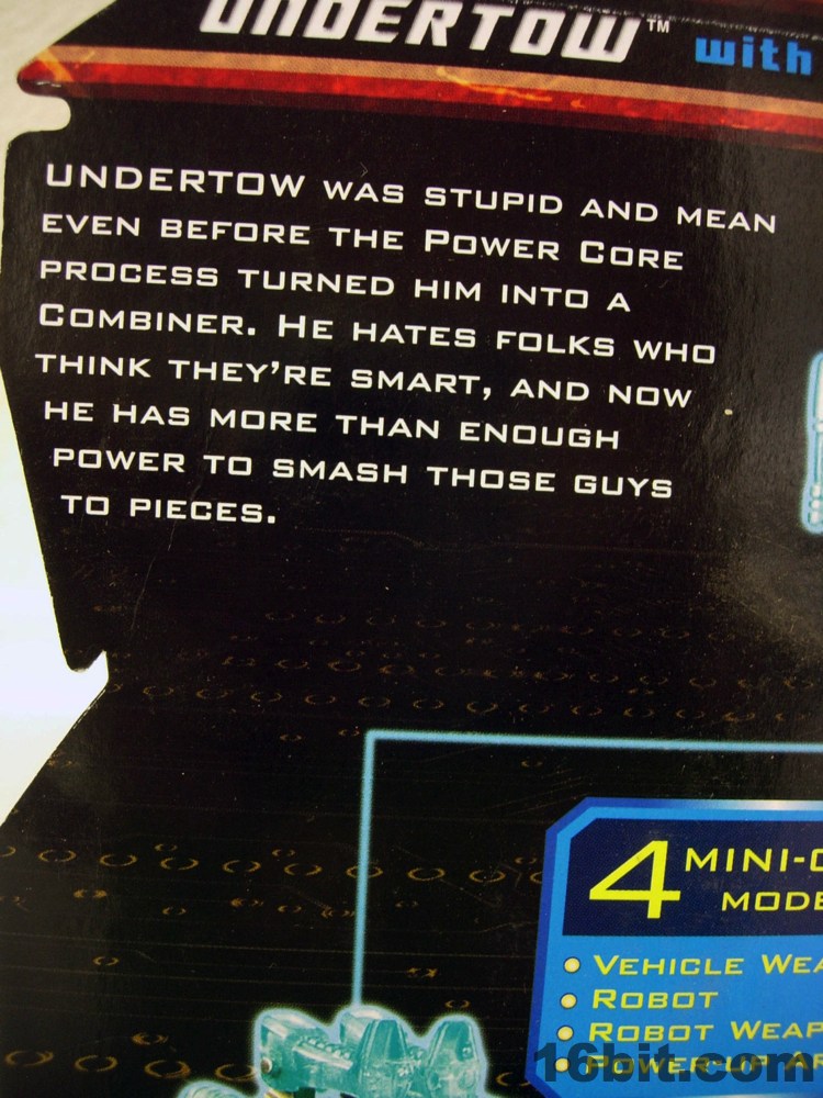 Sadly the Power Core Combiners concept was incredibly solid but didn't get much time to live. The first figures in this line showed up around July/August 2010, and the line was effectively dead at retail around January/February 2011. Undertow was one of the later releases, so short of getting some crazy Black Friday bundle or Toys R Us closeout, you probably never saw it, although it was sold online for most of 2011. The boat is a pretty simple toy with no real features to speak of, it looks OK and has a couple of cannons on the sides. You can also slap a Mini-Con on top, which it includes in the form of Waterlog. I rather like the little clear green guy because I'll buy pretty much anything Targetmasters-esque if the price is right.