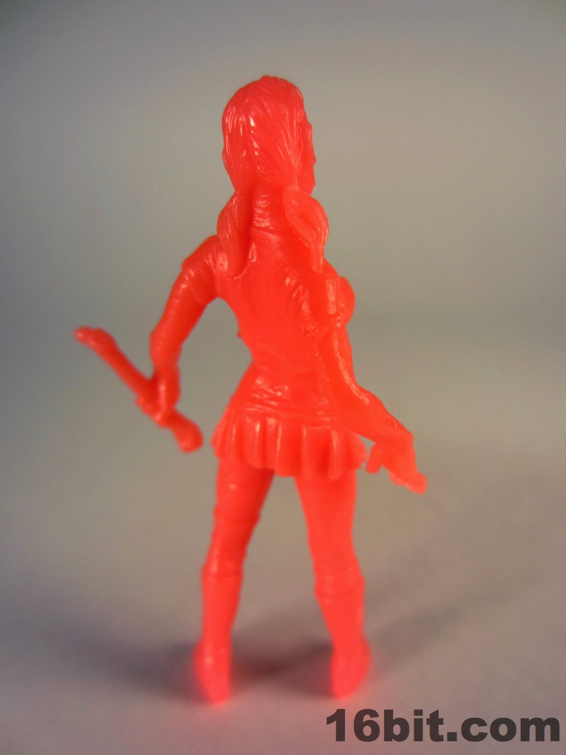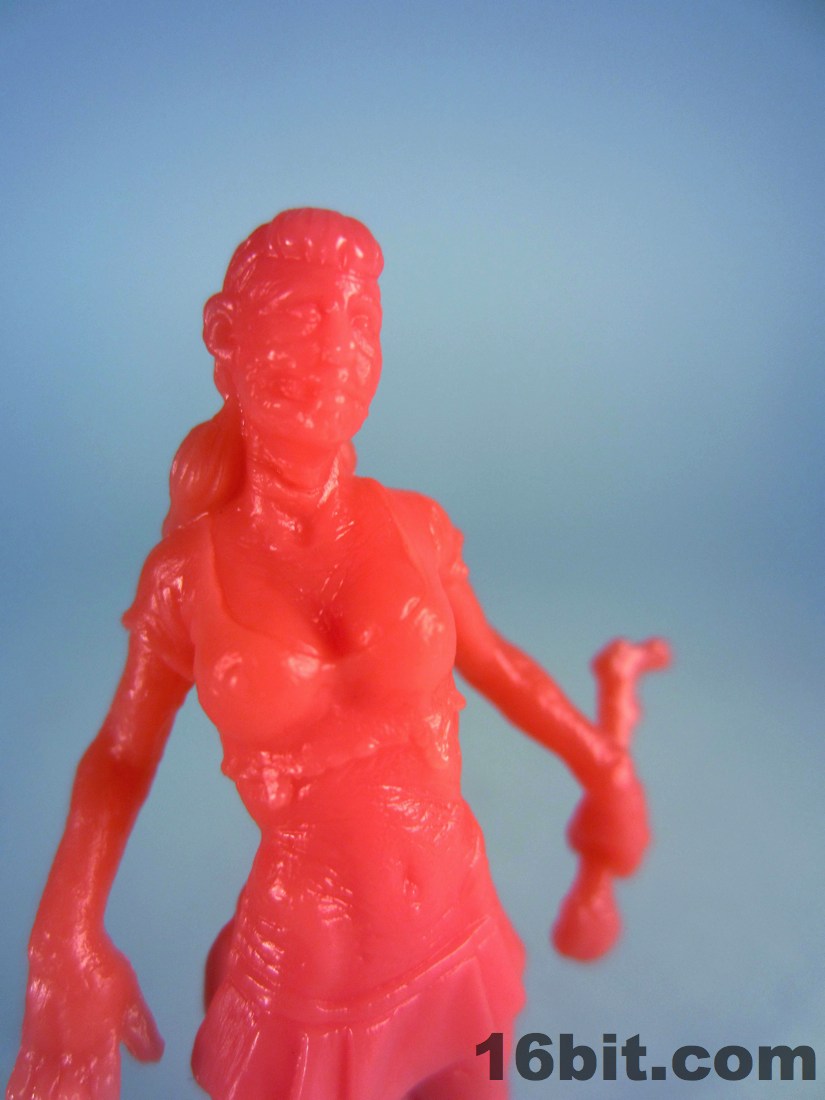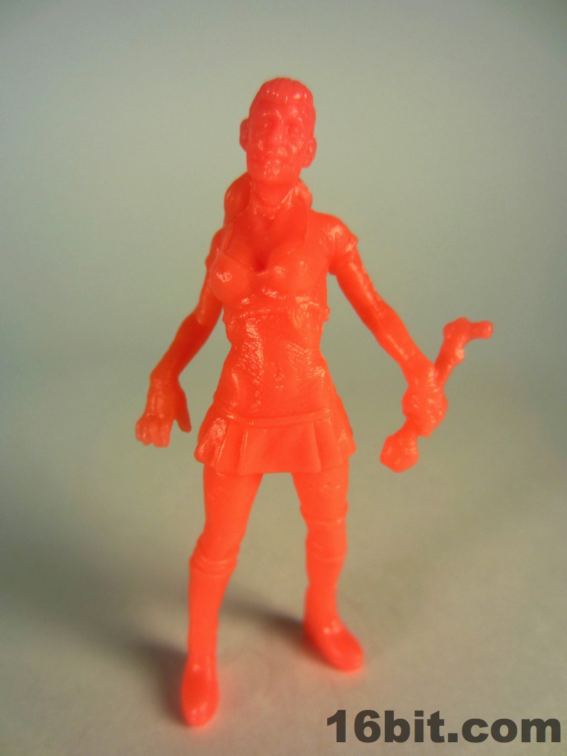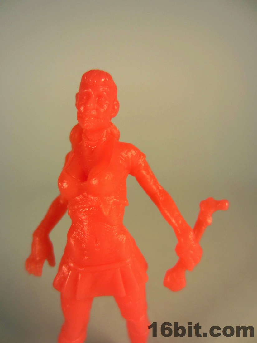 Completing the set is the Cheerleader Zombie, complete with huge boobs, sculpted nipples, insane abs, and a chunk of her face missing. Much like the cheerleaders in my high school, she also seems to have something carved in her leg. The cheerleader carries a bone in her hand plus wears high boots which should offer her no protection against the rampaging hordes of flesh-hungry undead. At about 2 1/3-inches high, she's the second tallest figure in the set.