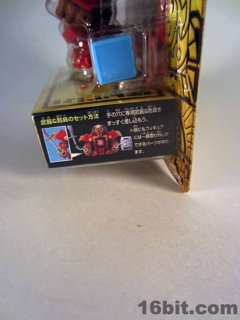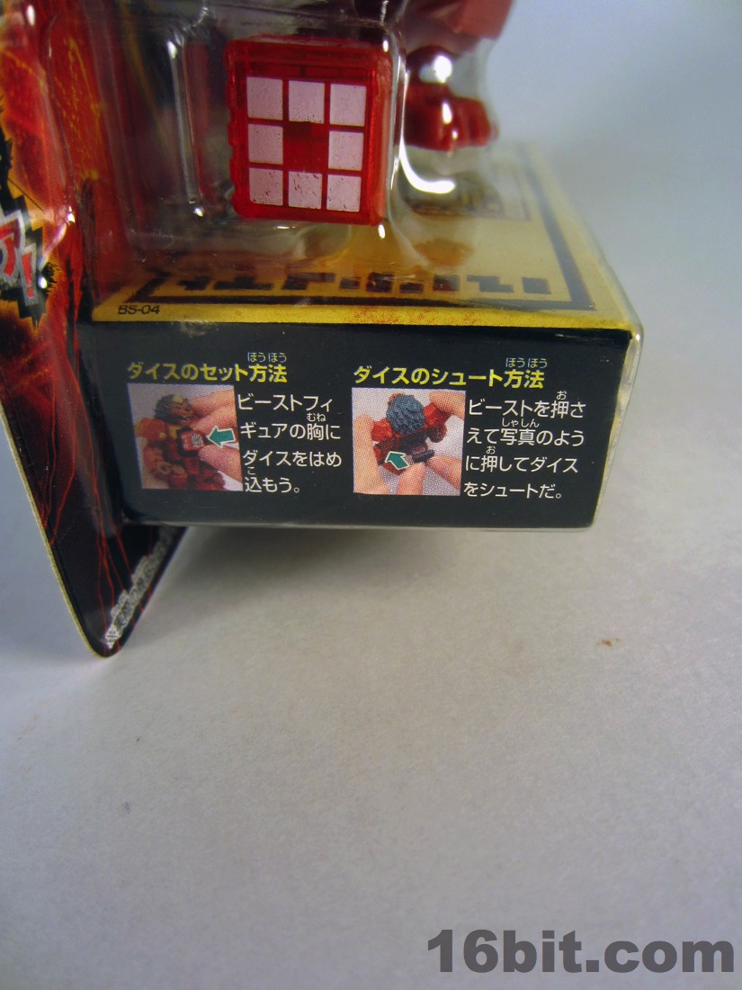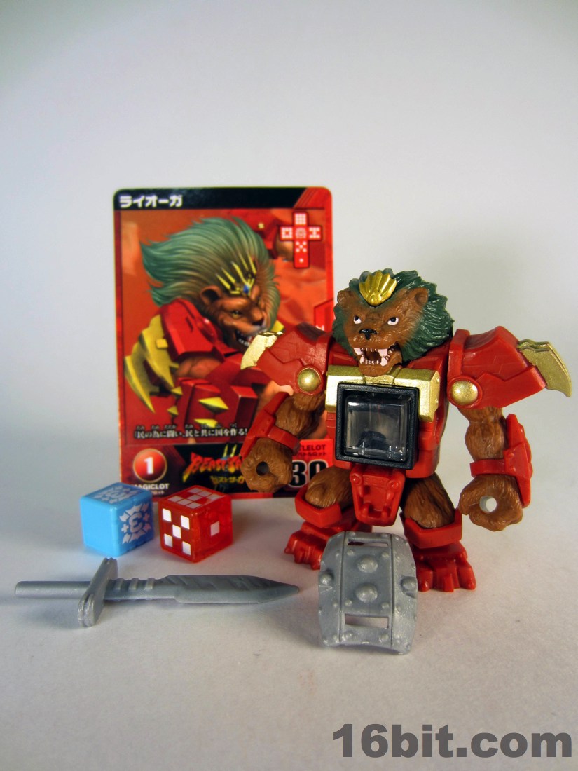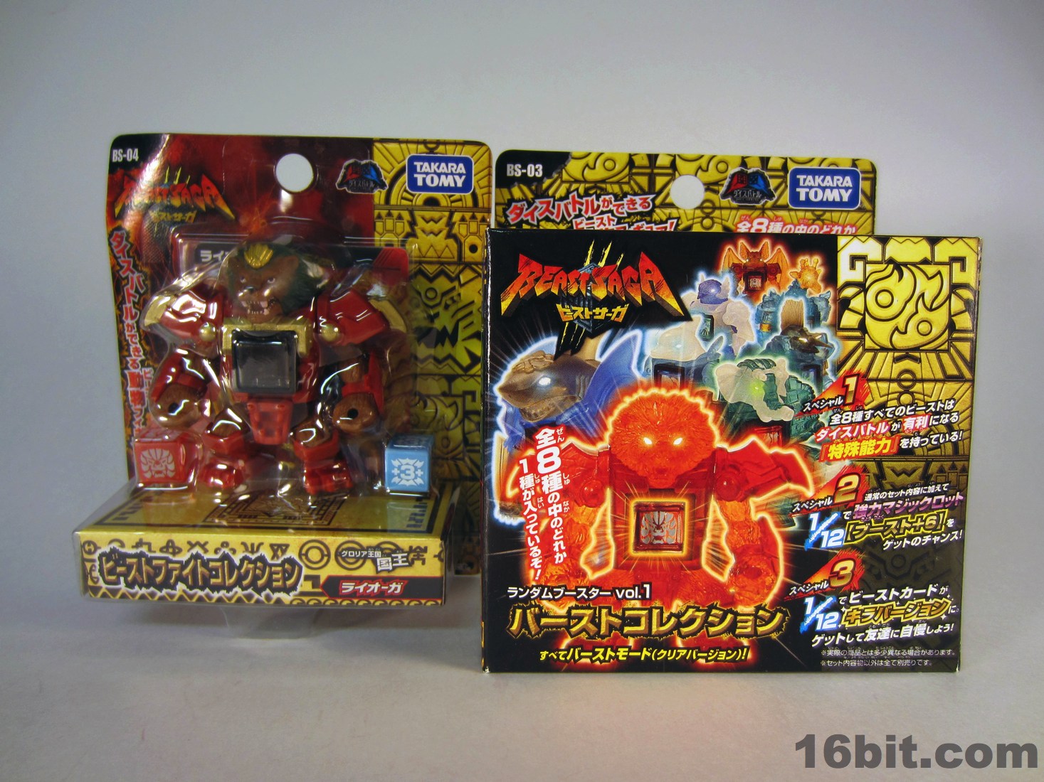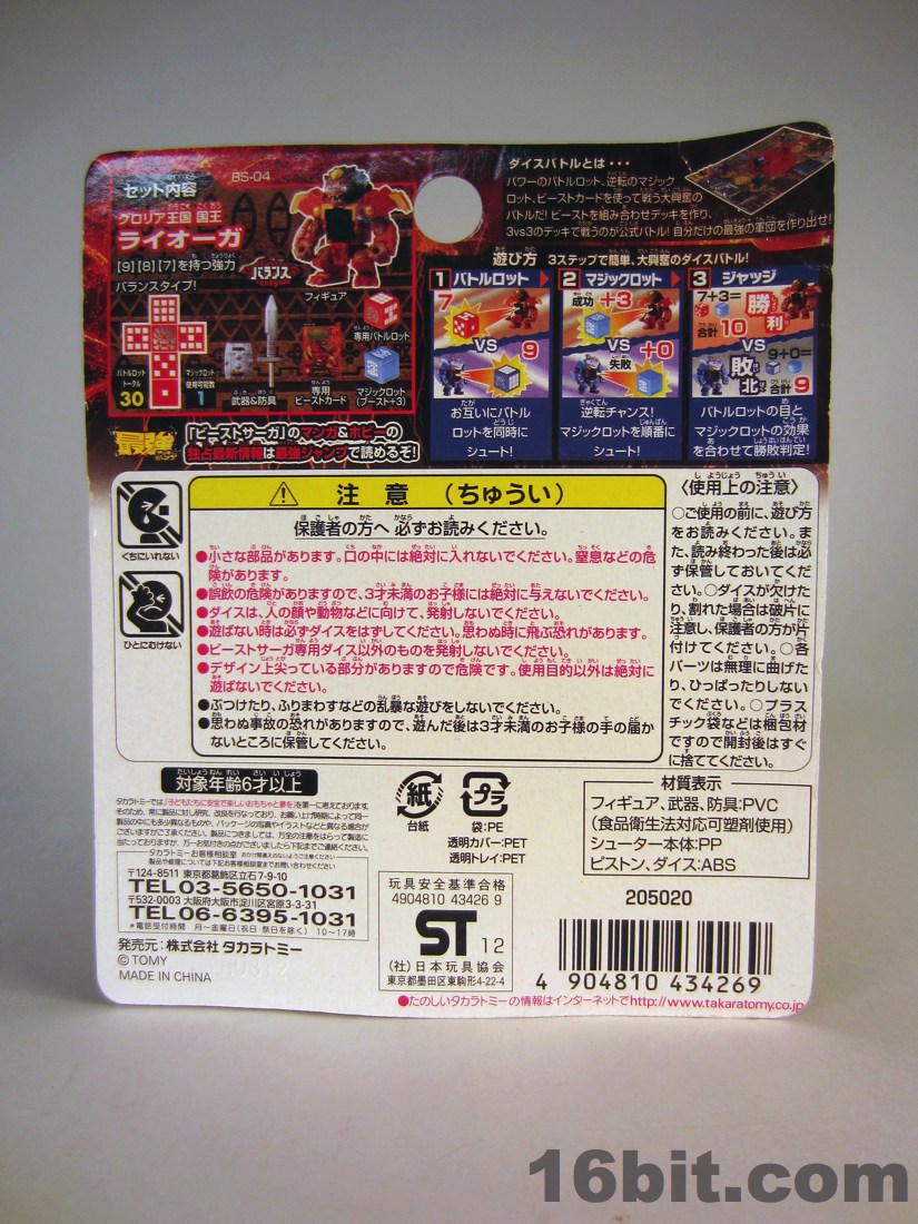 Don't get this single-carded Raioga. That's the one in the middle in the above photo. Consider getting a lion, but remember there are four Raioga figures and the single carded one offers nothing unique compared to the others. There's one in 3-pack BS-01 (with a hamster and deer, on the left) which has a unique sword and shield which are way, way cooler. The carded one (this one, BS-04) just has the bat's weapons. The blind-boxed clear Raioga (BS-03) also has the bat weapons, but it's a) clear and b) on fire. Since they all seem to have the same basic dice, this one is the one that's the most redundant. But being stupid and loose with my toy money, well, here we are. A capsule toy version of Raioga is on the way but color photos have yet to surface.