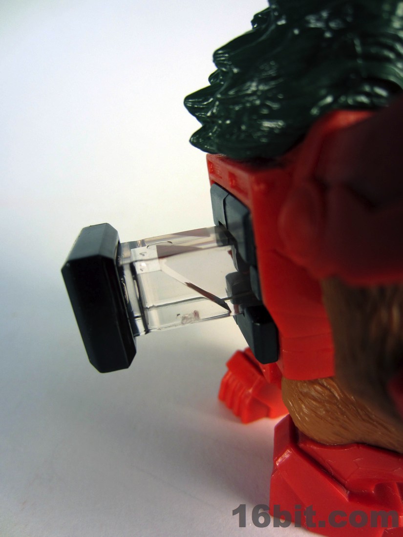Raioga's arms move pretty freely while the legs have limited movement, and the figure is indeed rubbery like the original Battle Beasts. The legs on most figures are not capable of swinging forward, so if you wanted Raioga to sit in your small vehicles from other toy lines it ain't gonna happen. Thanks to the figures huge feet, they have no problems standing unassisted-- which is important, because the game element requires you apply some force to the figure. A plunger in his back is made of a harder plastic piece, and the whole launcher assembly may be removed from the torso. You can cram a dice in it, and the non-spring-loaded launcher shoots the die out with about the same amount of force you shove on it. It's actually quite a bit of fun and well-designed. The niftiest thing about the launcher is how they decided to light-pipe the die. You see, the launcher is cast in clear plastic with a tiny prism-like cut, which beams light into the die and makes it glow a bit in a well-lit room. Nice! I don't fully g.shtml the game rules yet, but I'm guessing it's about as fun as the Bot Shots game I don't play and the Battle Beasts fire/wood/water thing I also never played as a kid. But with more shooting.