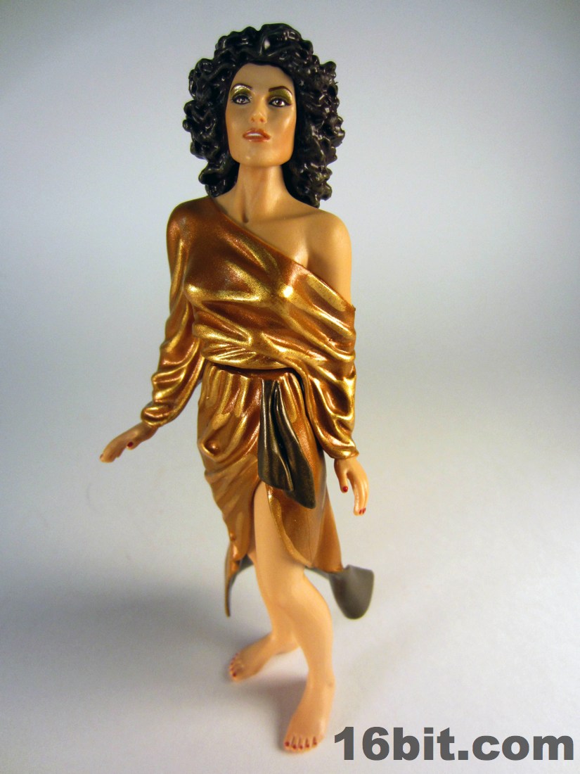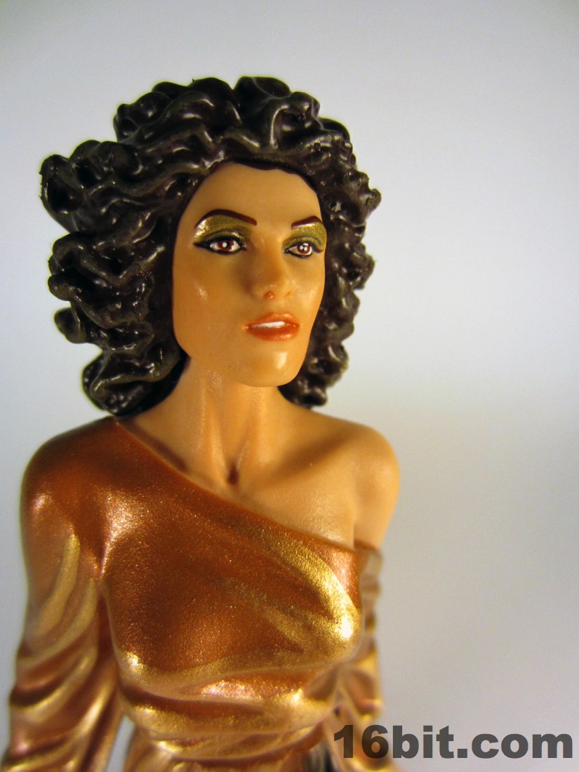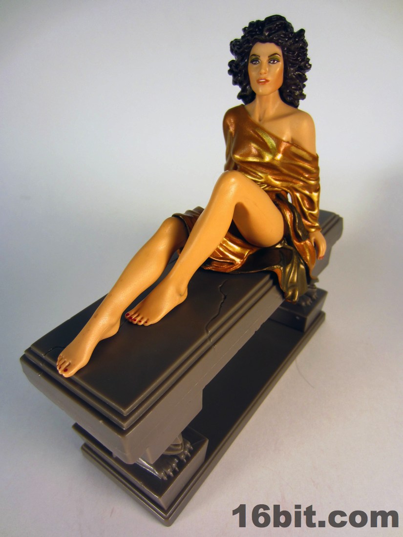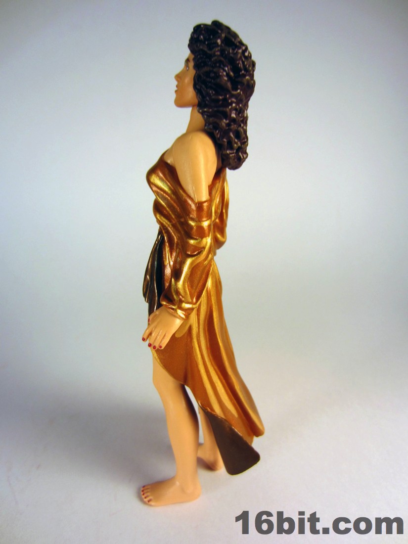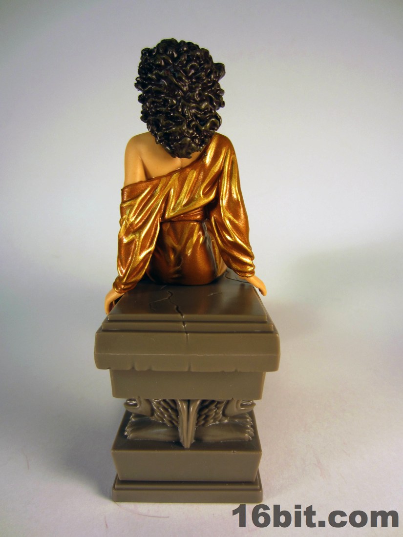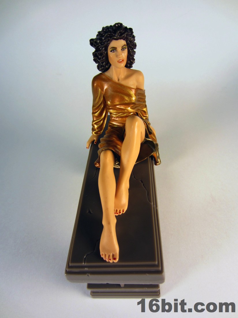 Due to the unusual pose, she doesn't necessarily stand all that well. She sits just fine, and her hands are posed in a way which should be awkward, but work perfectly. She can rest on this demonic bench thing, or stand in some sort of contemplative possessed state. The figure's deco could be a smidgen better, although once removed from the context of the movie it's kind of interesting to see how the costume feels less like something out of 1984 so much as the late 1970s. The makeup on the figure is actually far too subtle compared to the smokier eyes on screen, and hair-- being eternally tricky to sculpt-- looks a little more monstrous on the toy than on the big screen. The dress deco tries to capture the metallic look of the garment with paint, which is always something of a trick. Gold and bronze alternate on the fabric's folds, resulting in my astonishment that I never realized this was obviously some sort of allusion to disco until just recently.