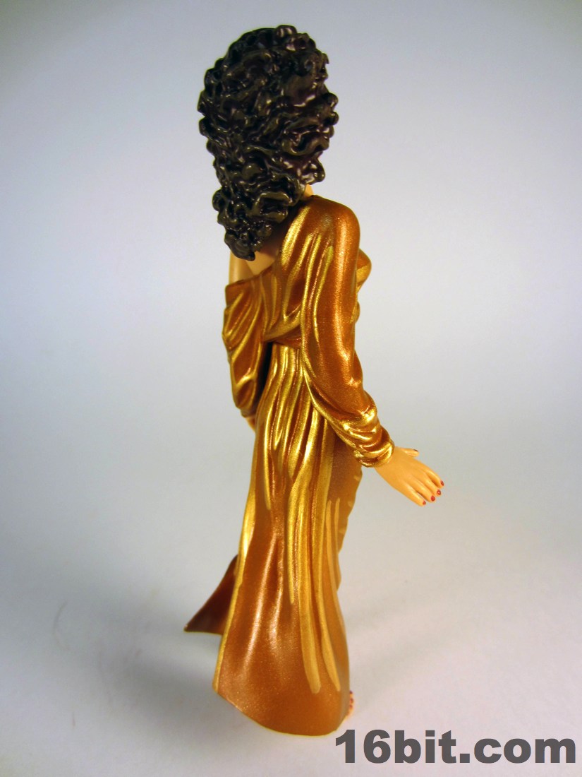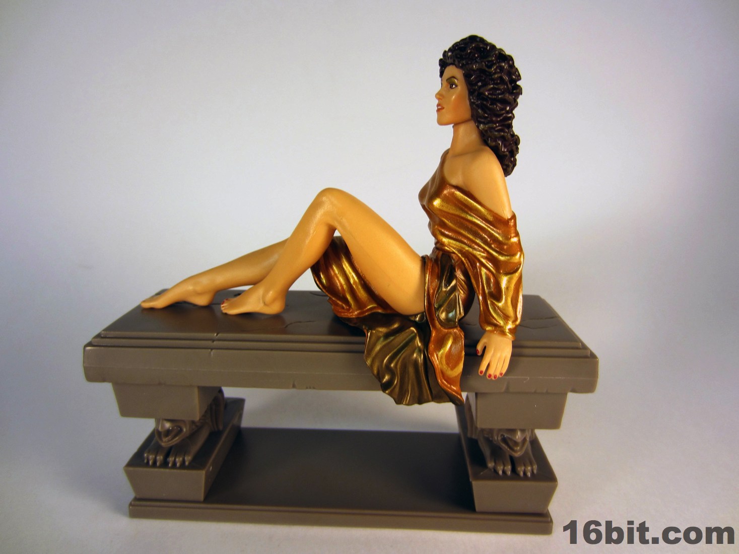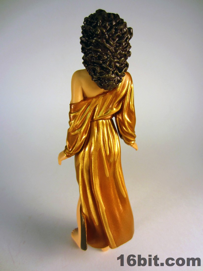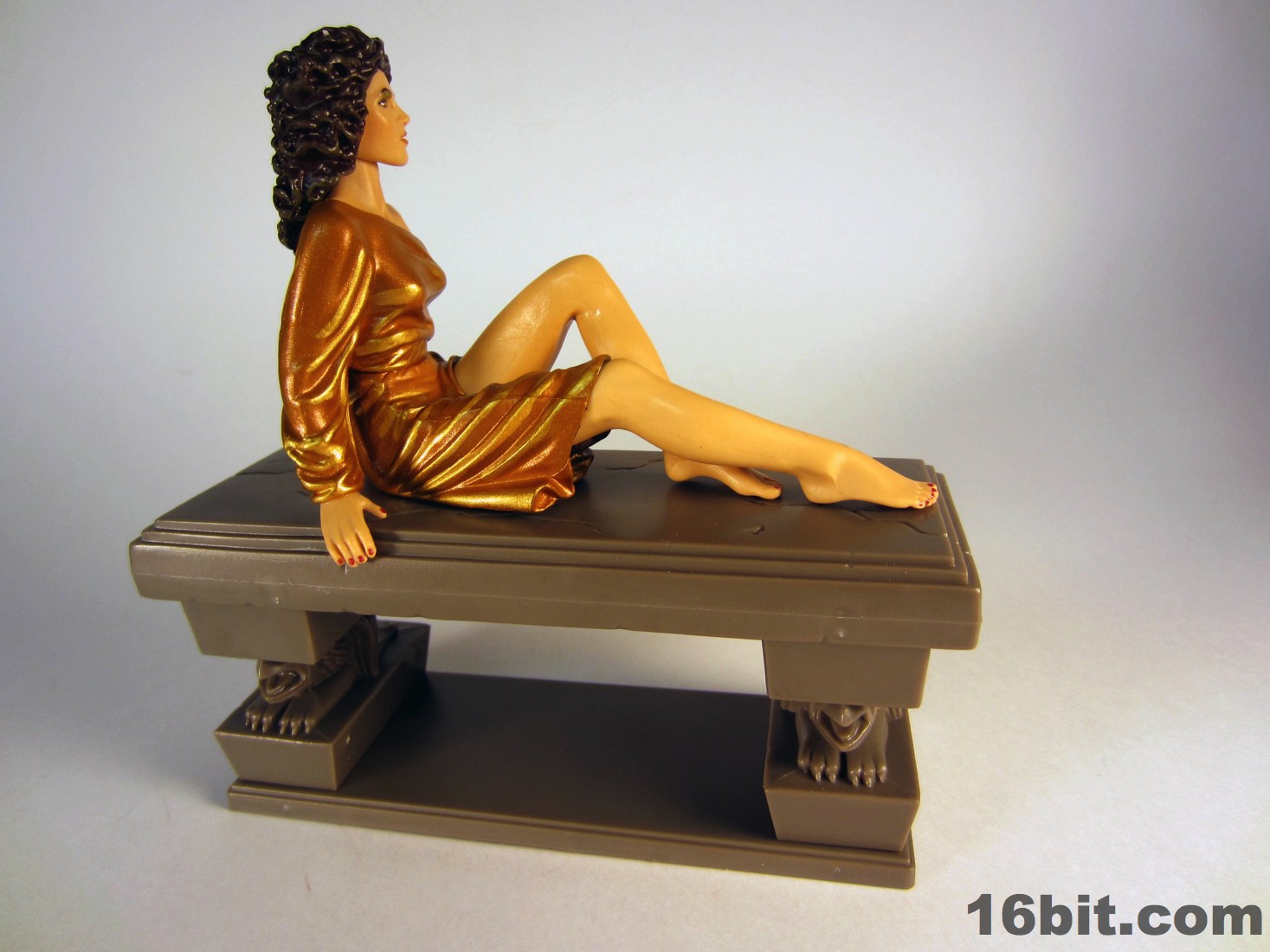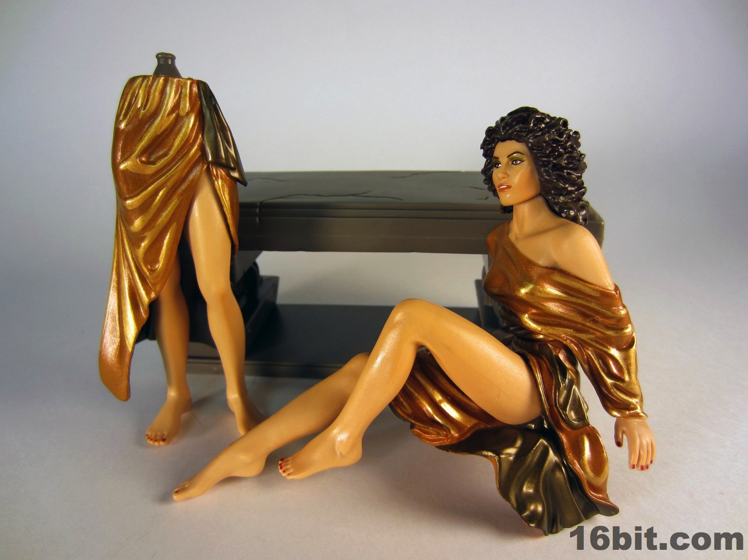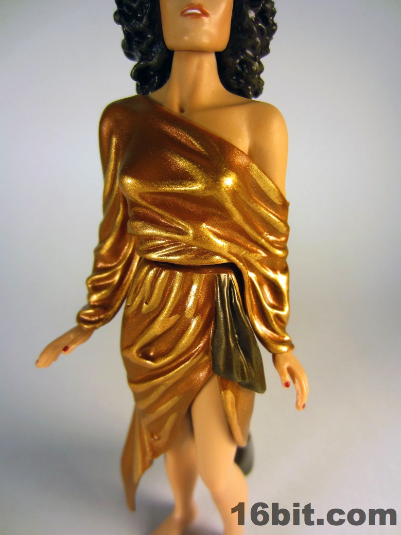 Due to the unusual pose, she doesn't necessarily stand all that well. She sits just fine, and her hands are posed in a way which should be awkward, but work perfectly. She can rest on this demonic bench thing, or stand in some sort of contemplative possessed state. The figure's deco could be a smidgen better, although once removed from the context of the movie it's kind of interesting to see how the costume feels less like something out of 1984 so much as the late 1970s. The makeup on the figure is actually far too subtle compared to the smokier eyes on screen, and hair-- being eternally tricky to sculpt-- looks a little more monstrous on the toy than on the big screen. The dress deco tries to capture the metallic look of the garment with paint, which is always something of a trick. Gold and bronze alternate on the fabric's folds, resulting in my astonishment that I never realized this was obviously some sort of allusion to disco until just recently.