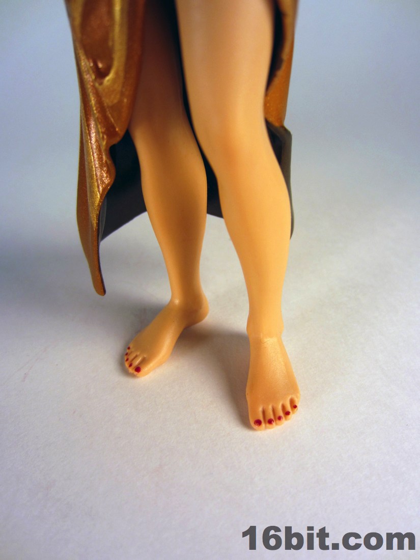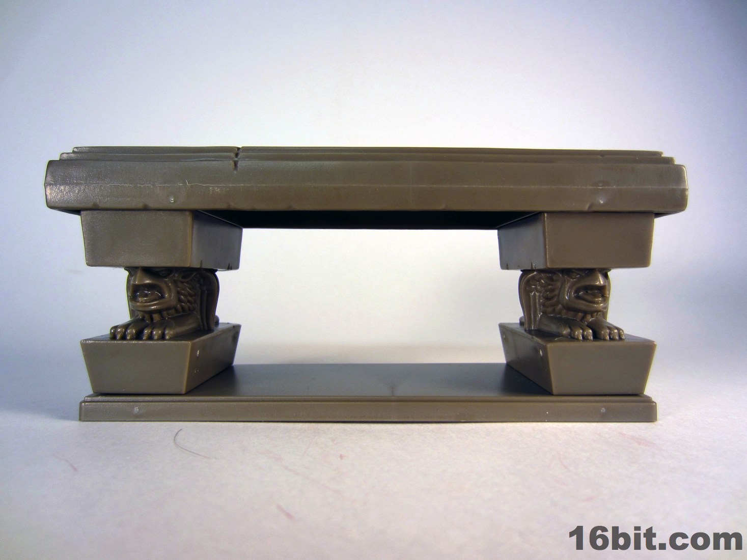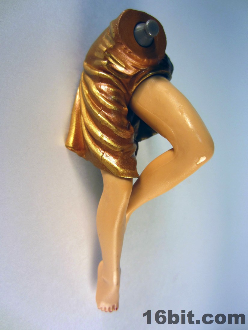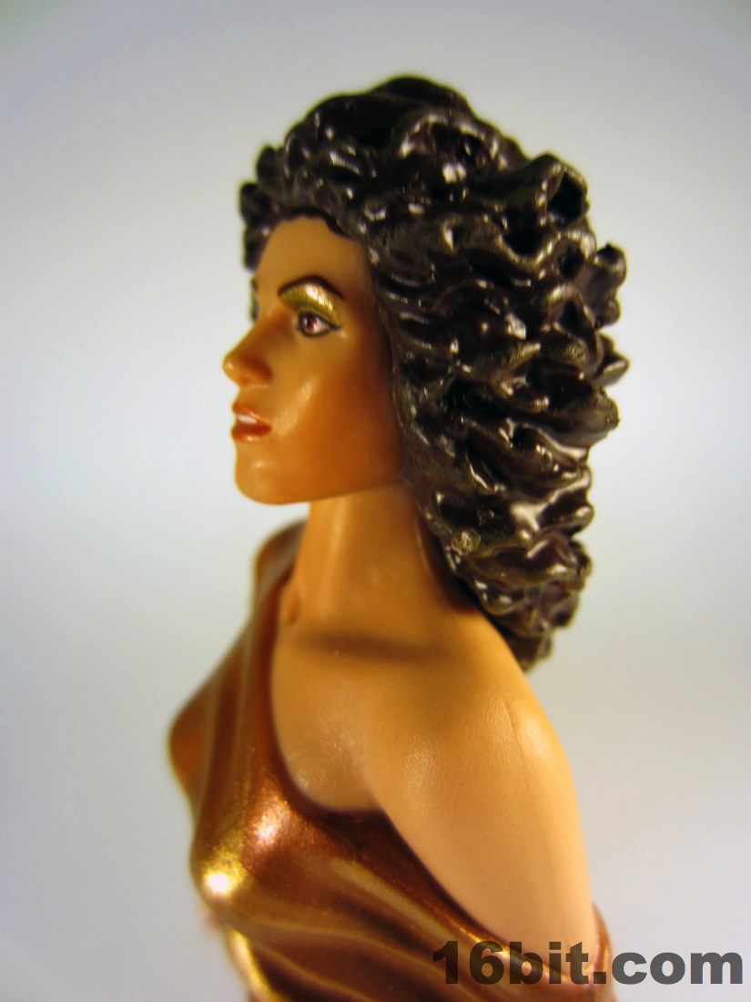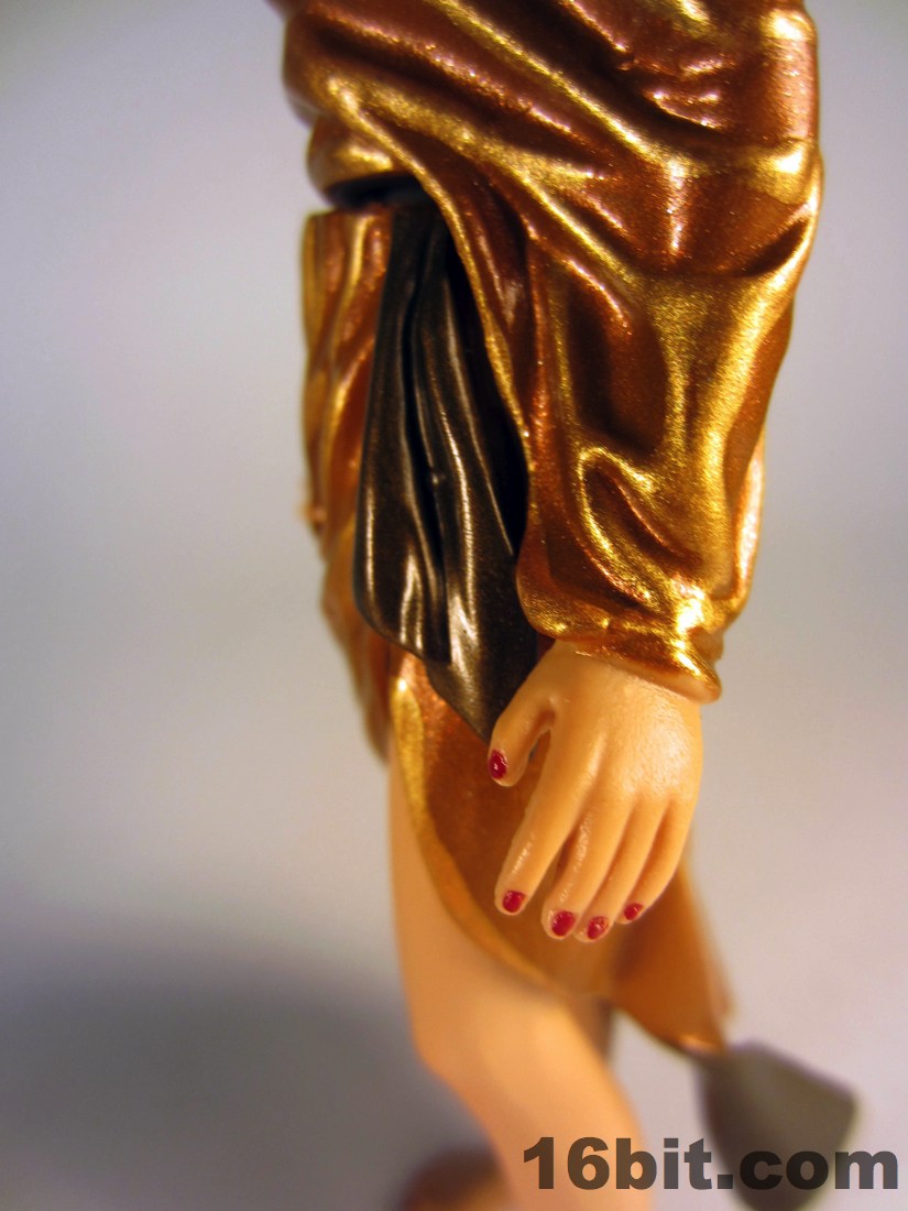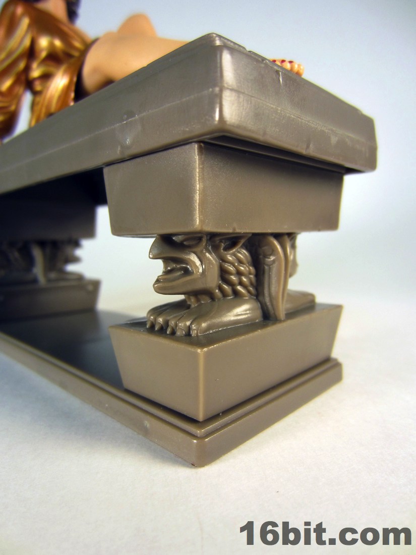 Due to the unusual pose, she doesn't necessarily stand all that well. She sits just fine, and her hands are posed in a way which should be awkward, but work perfectly. She can rest on this demonic bench thing, or stand in some sort of contemplative possessed state. The figure's deco could be a smidgen better, although once removed from the context of the movie it's kind of interesting to see how the costume feels less like something out of 1984 so much as the late 1970s. The makeup on the figure is actually far too subtle compared to the smokier eyes on screen, and hair-- being eternally tricky to sculpt-- looks a little more monstrous on the toy than on the big screen. The dress deco tries to capture the metallic look of the garment with paint, which is always something of a trick. Gold and bronze alternate on the fabric's folds, resulting in my astonishment that I never realized this was obviously some sort of allusion to disco until just recently.