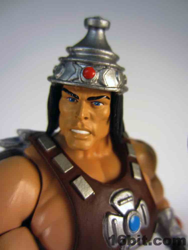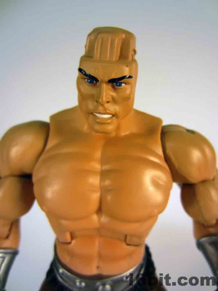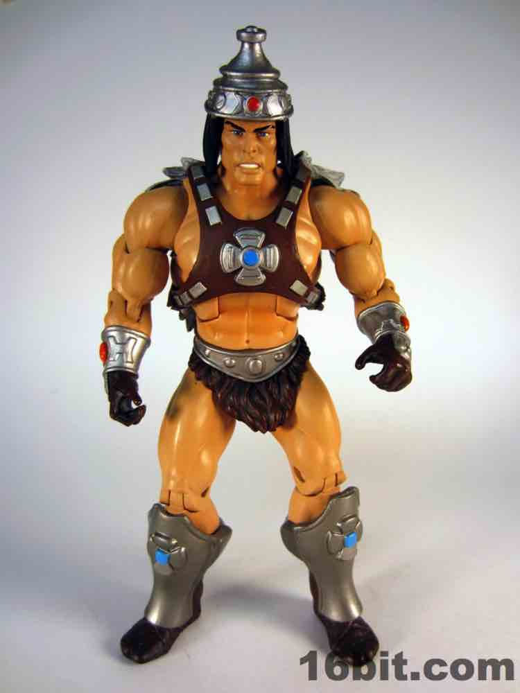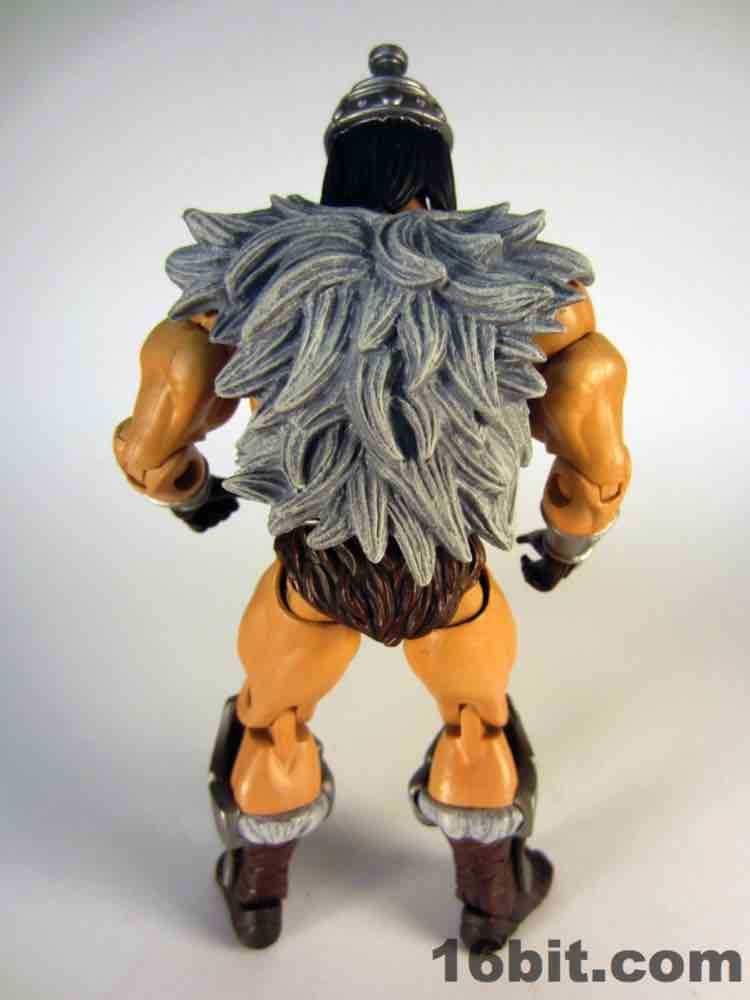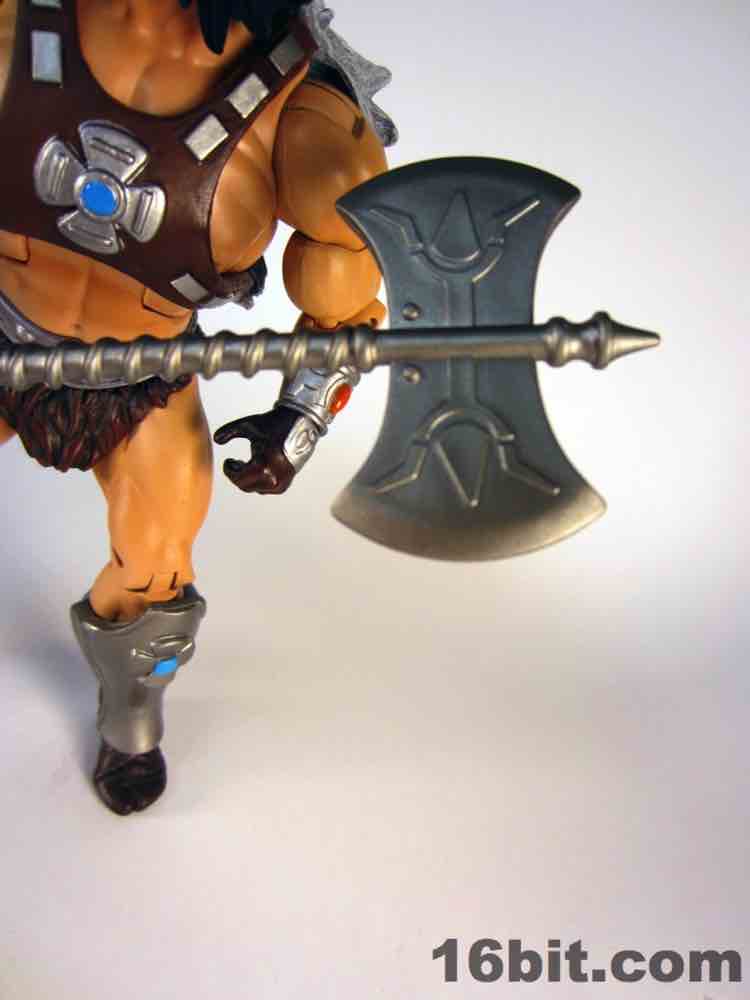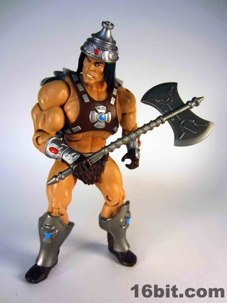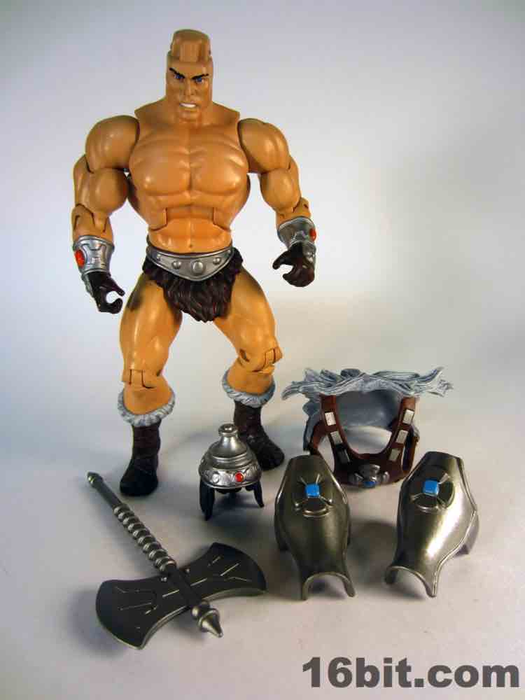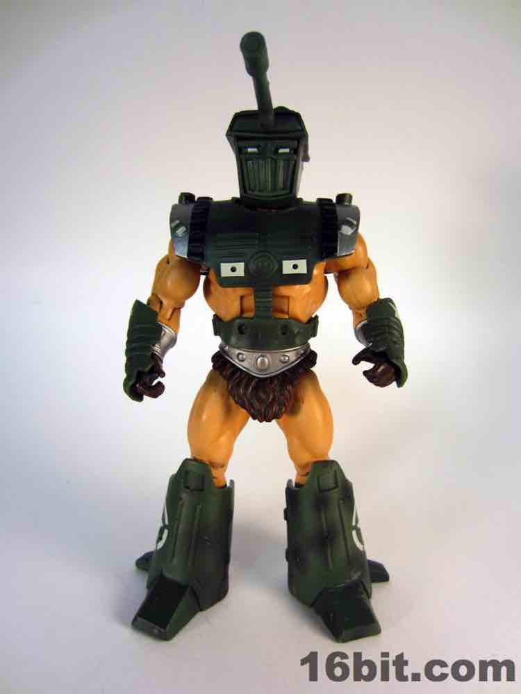 While technically a concept He-Man figure, Vykron borrows the original concept art for the character and applies it to a new character with a new name. Rather than being the most powerful man in the Universe (or his grampa) Vykron is an Eternian Champion, which is to say a Gladiator, which is to say Eternia's WWE. The alternate outfits are basically vanquished foes, or alternate costumes ala Mick Foley. The main outfit is the barbarian, which was how the figure was packed out for Comic-Con 2012. (The other versions were sold on Matty Collector a couple weeks later.) Borrowing heavily from the stock He-Man buck, Vykron gets new hands and forearms, plus a new head. The costume elements are new, his vambraces are snap-on accessories over his boots and the furry cape/harness pops on and off like all the rest. Particularly interesting is his helmet and hair, which are a single, removable piece which can be replaced for the space outfit's helmet. (The tank head is a complete head and must be swapped completely.) Vykron's barbarian weapon is a mighty axe, which is, unsurprisingly, quite cool. My only gripe about this mode is the black paint from the hair dried on the human head and at least on my sample, it can look sort of ugly without it. Solution: leave on a helmet at all times.