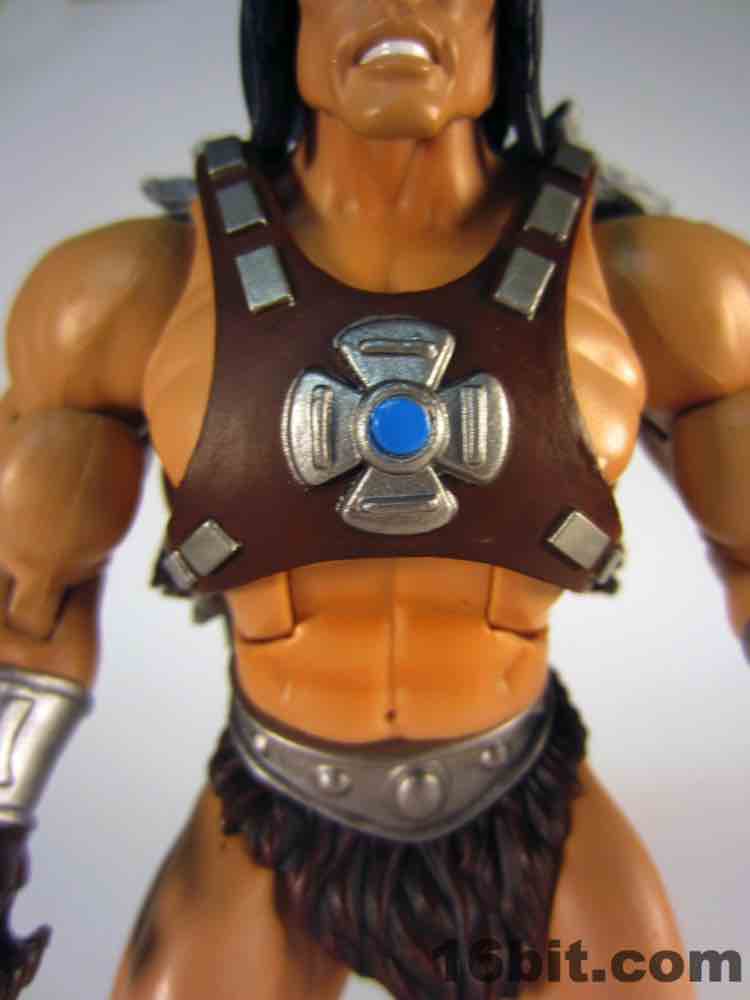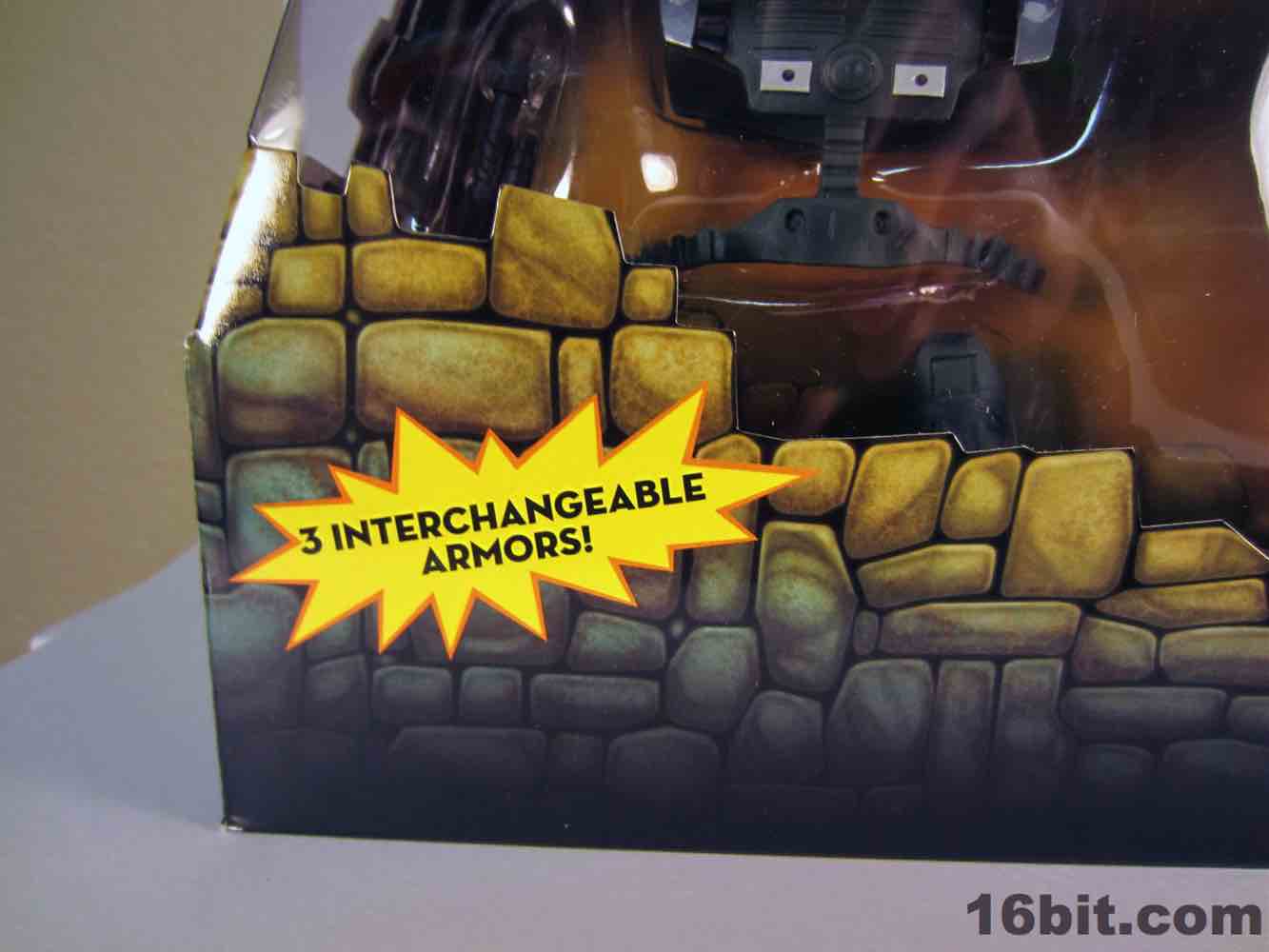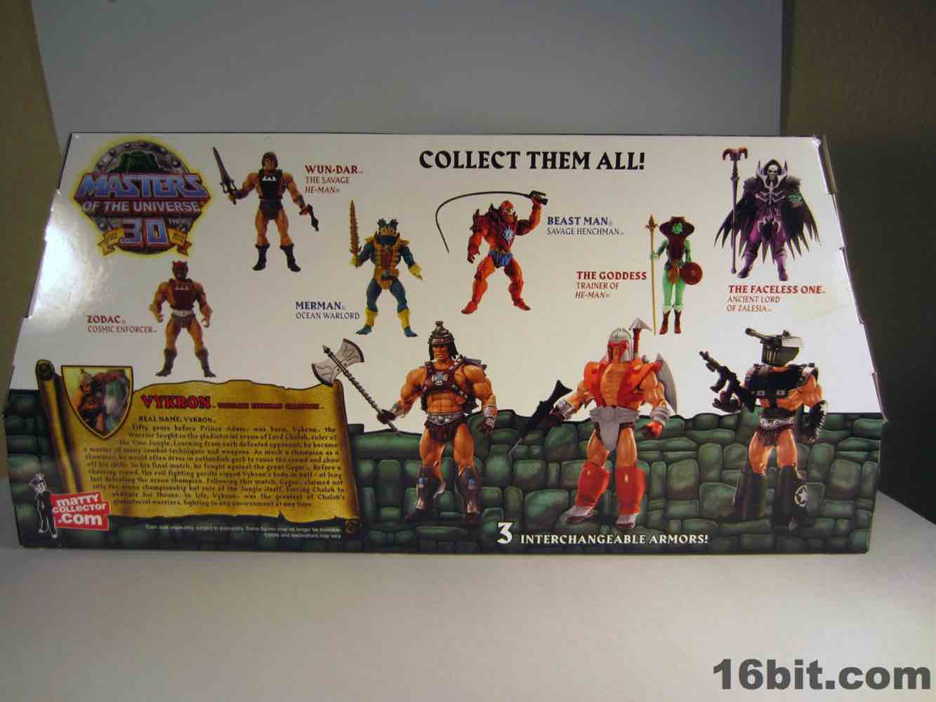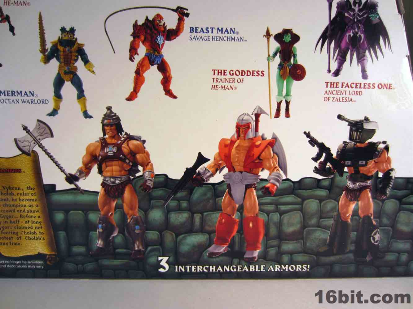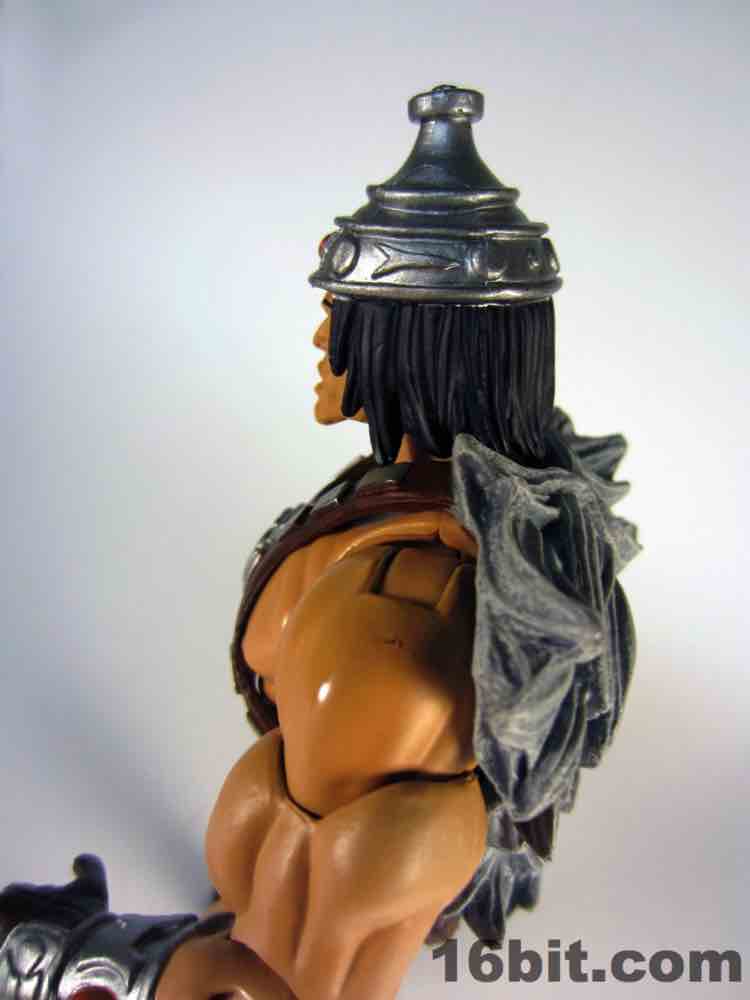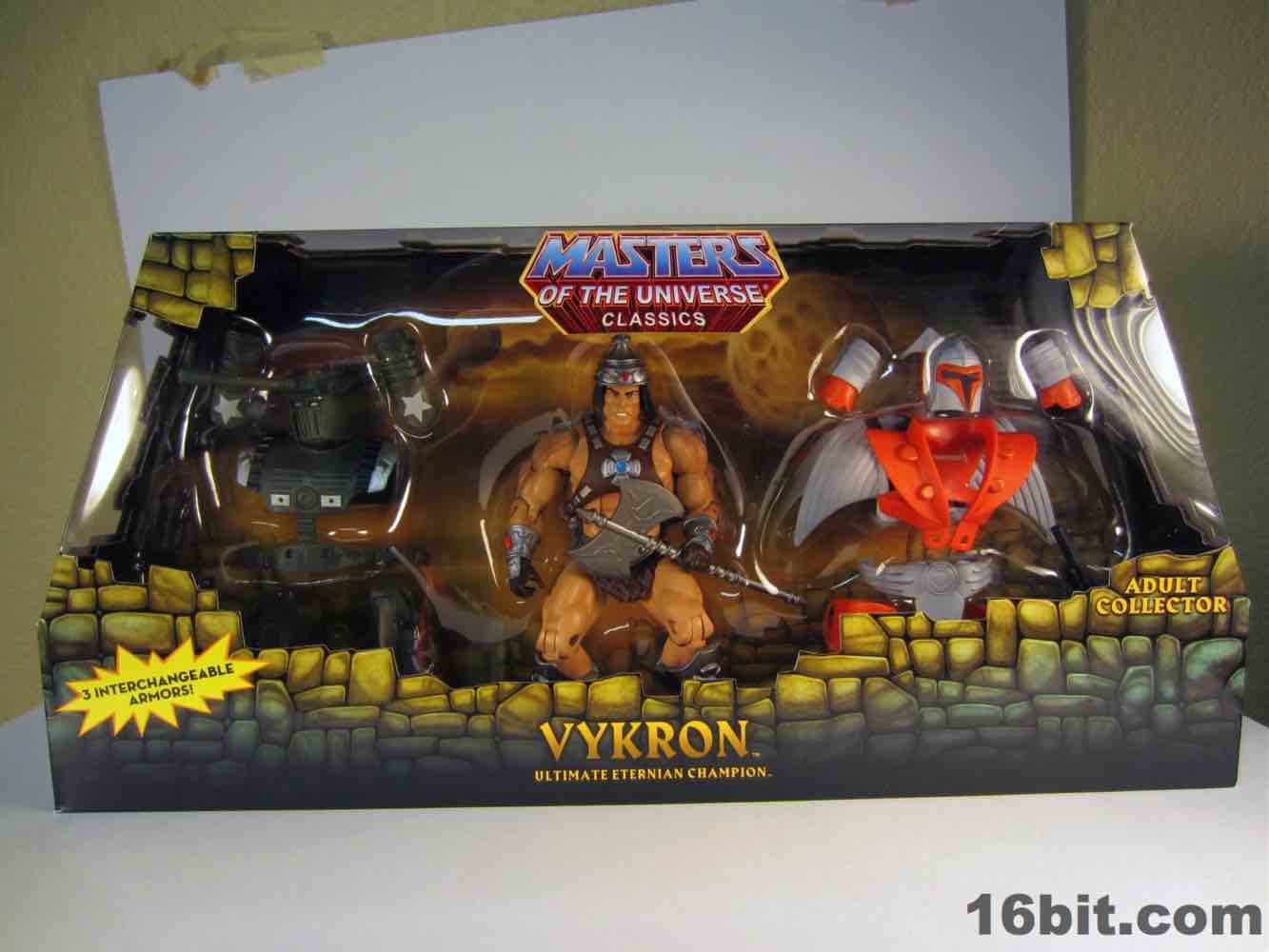 While technically a concept He-Man figure, Vykron borrows the original concept art for the character and applies it to a new character with a new name. Rather than being the most powerful man in the Universe (or his grampa) Vykron is an Eternian Champion, which is to say a Gladiator, which is to say Eternia's WWE. The alternate outfits are basically vanquished foes, or alternate costumes ala Mick Foley. The main outfit is the barbarian, which was how the figure was packed out for Comic-Con 2012. (The other versions were sold on Matty Collector a couple weeks later.) Borrowing heavily from the stock He-Man buck, Vykron gets new hands and forearms, plus a new head. The costume elements are new, his vambraces are snap-on accessories over his boots and the furry cape/harness pops on and off like all the rest. Particularly interesting is his helmet and hair, which are a single, removable piece which can be replaced for the space outfit's helmet. (The tank head is a complete head and must be swapped completely.) Vykron's barbarian weapon is a mighty axe, which is, unsurprisingly, quite cool. My only gripe about this mode is the black paint from the hair dried on the human head and at least on my sample, it can look sort of ugly without it. Solution: leave on a helmet at all times.