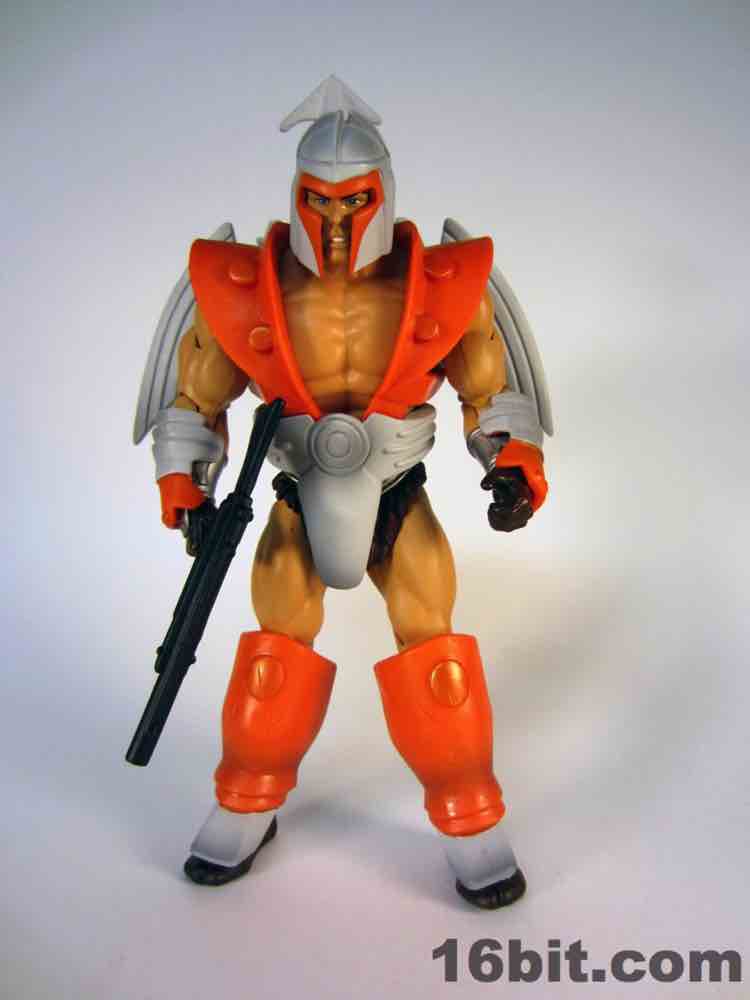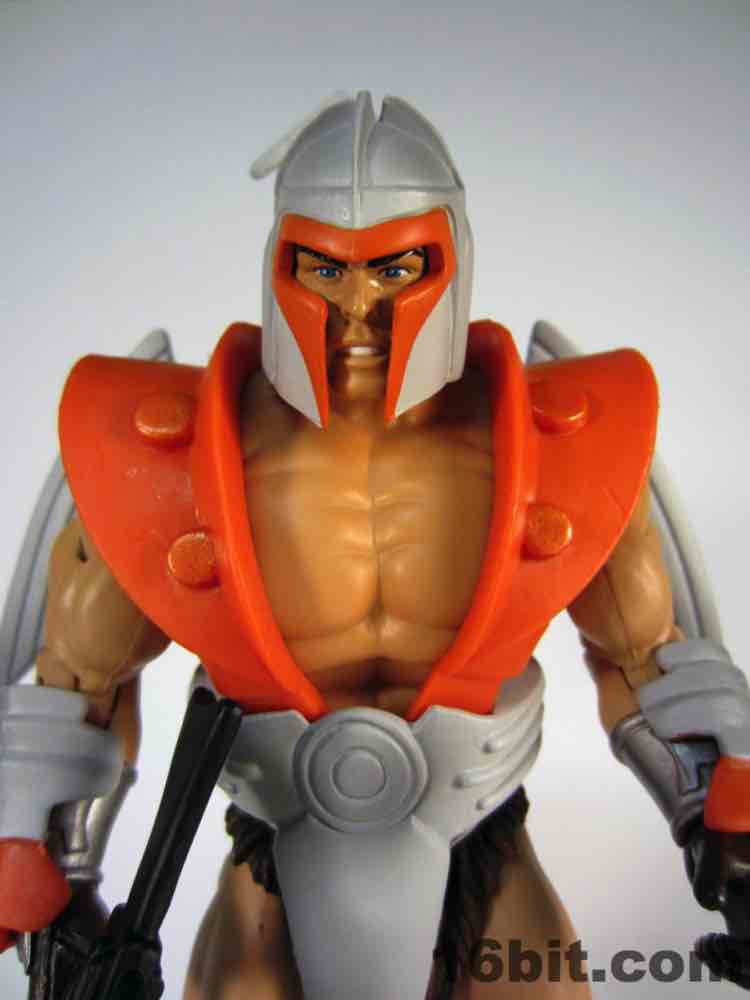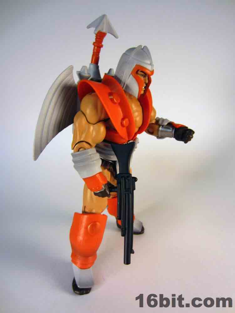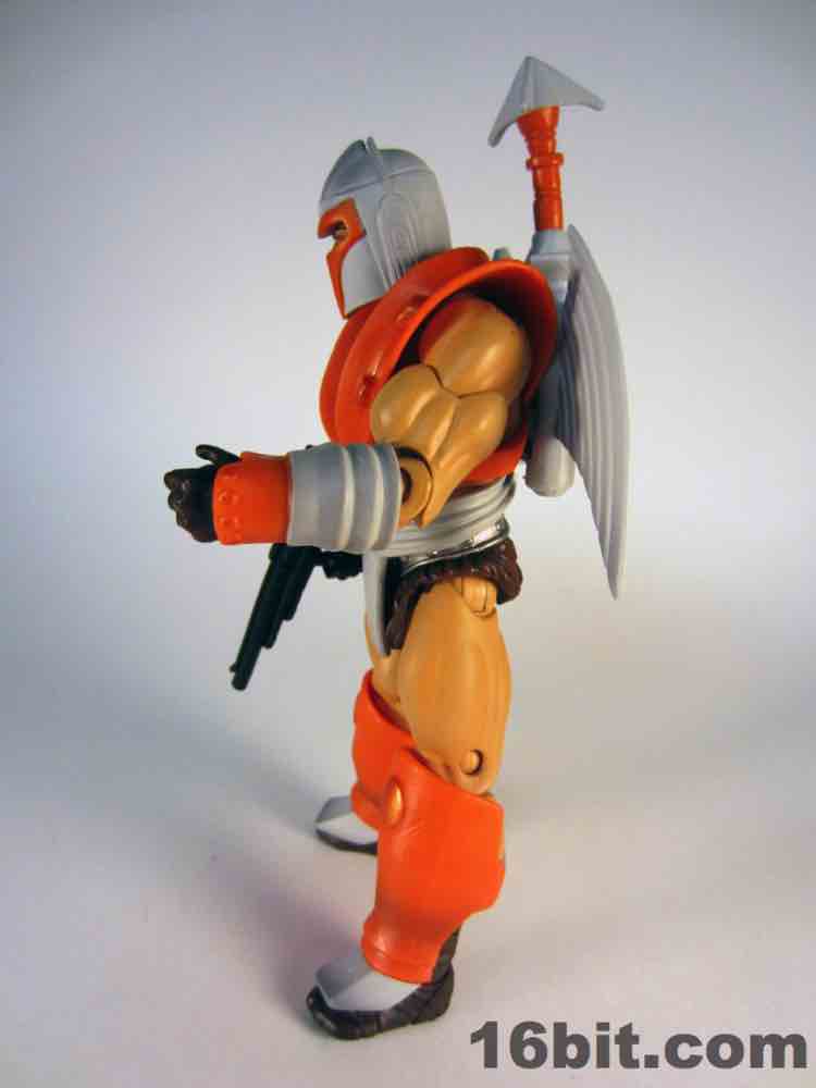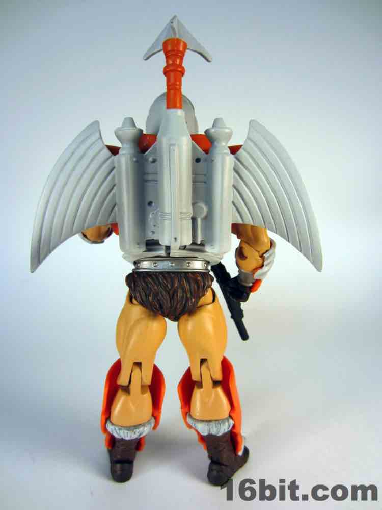 Simultaneously the most interesting and my least favorite costume, the Space Man borrowed heavily from another action figure line. The original prototype used the helmet and backpack of Boba Fett, a 12-inch Kenner figure from 1979. The influences remain on this new version, which is decked out nicely with added wings on the jetpack, new gauntlets, new vambraces, and a gun. I had some difficulty getting this outfit tabbed into place on the figure, but (at least from where I sit) that's OK. I didn't much plan on displaying him this way, as its orange and grey look feels more at home on Cloud City than near Castle Grayskull. I'm not saying I dislike it, it's just that when paired with the really cool barbarian and completely insane tank man, it loses something.