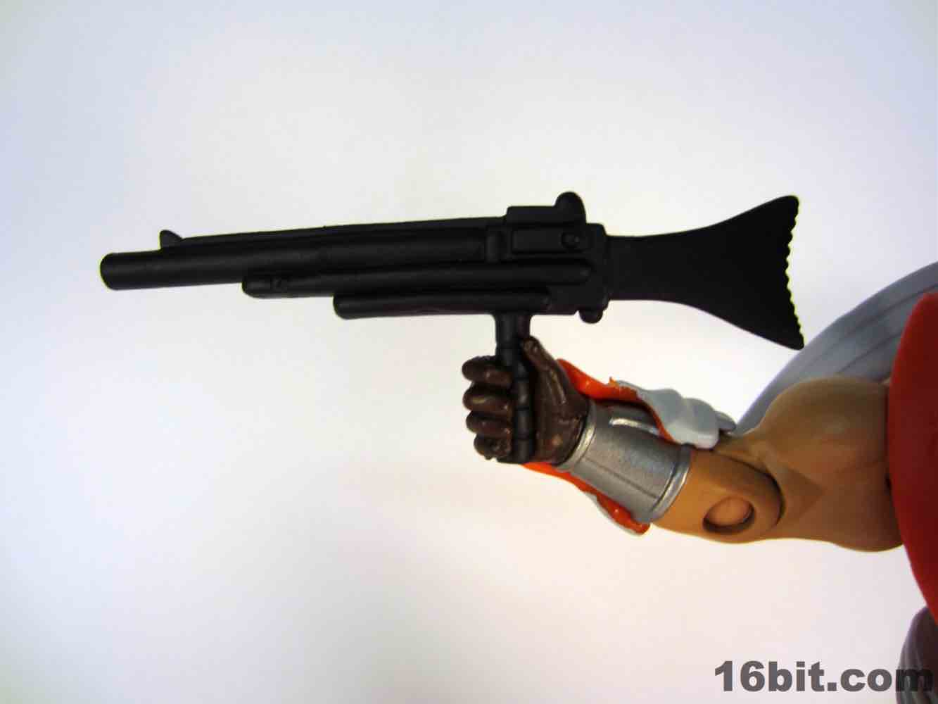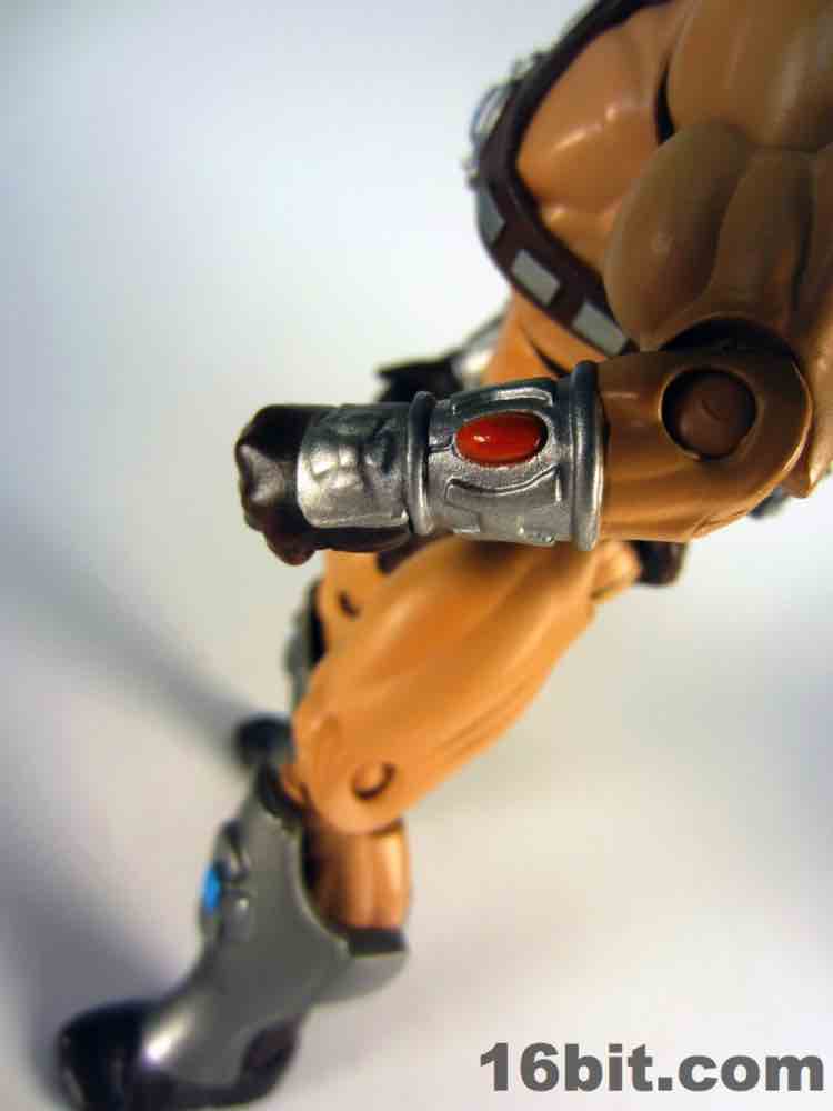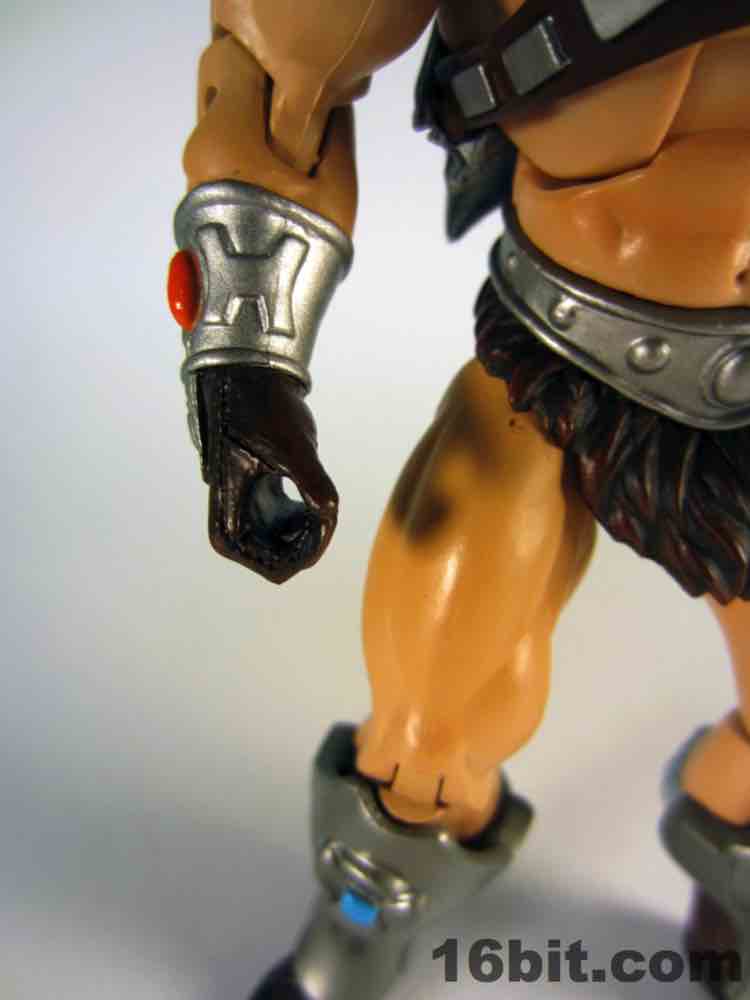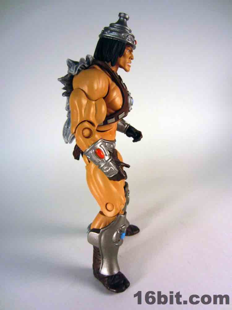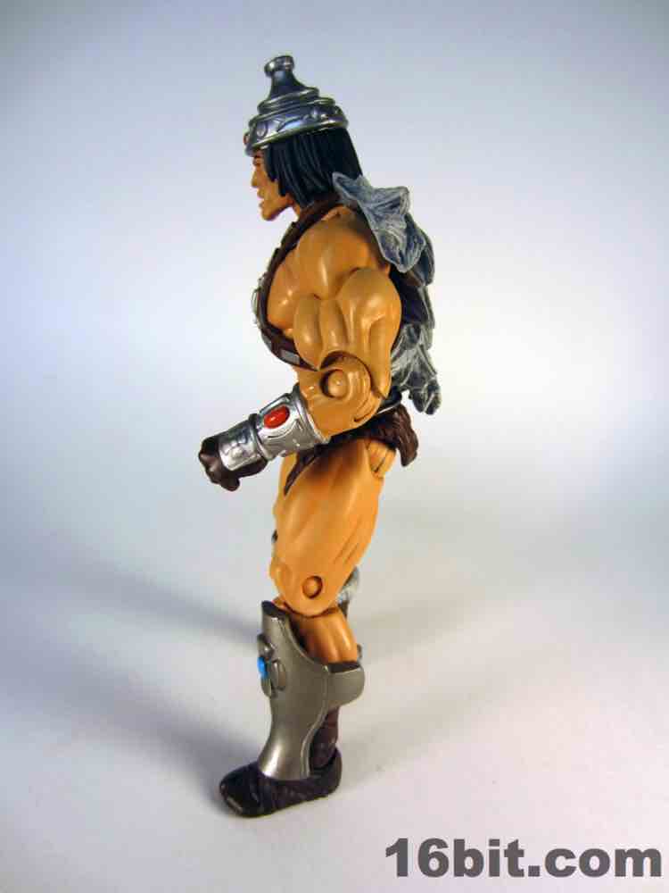Simultaneously the most interesting and my least favorite costume, the Space Man borrowed heavily from another action figure line. The original prototype used the helmet and backpack of Boba Fett, a 12-inch Kenner figure from 1979. The influences remain on this new version, which is decked out nicely with added wings on the jetpack, new gauntlets, new vambraces, and a gun. I had some difficulty getting this outfit tabbed into place on the figure, but (at least from where I sit) that's OK. I didn't much plan on displaying him this way, as its orange and grey look feels more at home on Cloud City than near Castle Grayskull. I'm not saying I dislike it, it's just that when paired with the really cool barbarian and completely insane tank man, it loses something.