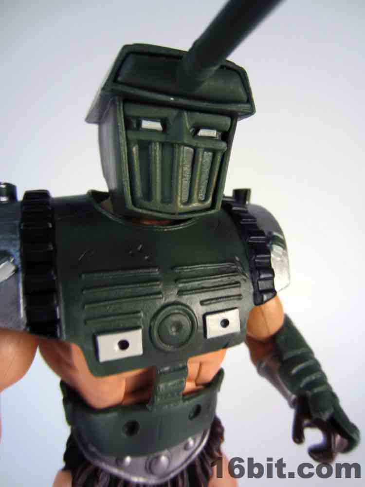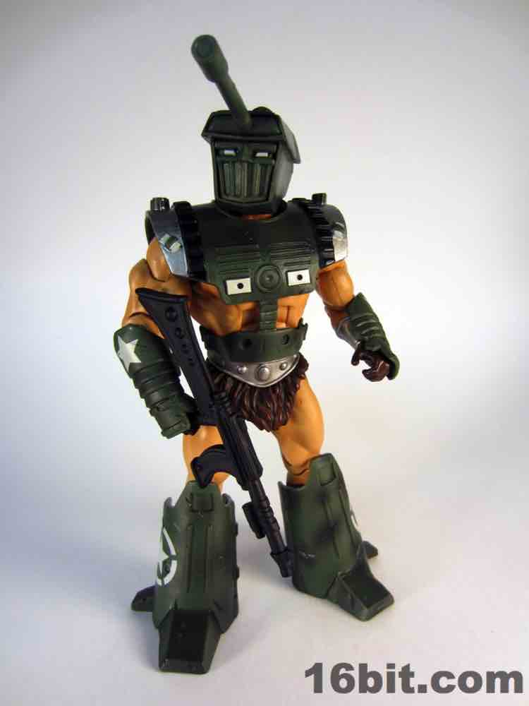 The figure has snap-on leg and wrist armor, a tank torso covering, and a turret for a head. A rifle weapon almost seems like overkill, but I'm glad it's here. The mouth grille reminds me a little of Darth Vader, and the strange blue window eyes give him a fairly ominous air-- it's amazing to think this was a concept for a hero figure in a flagship action figure line! It reminds me a lot of a male version of Japan's popular Mecha Musume statues, where a girl and a model airplane are merged into a single entity far less gruesome than it sounds. Tank Vykron has amazing deco, the green paint has some scrapes and damage which bring it to life in an extremely fun way. I like this figure so much, I'd buy it if it weren't part of Masters of the Universe, just like Optikk, Draego-Man, and quite a few other out-there releases.