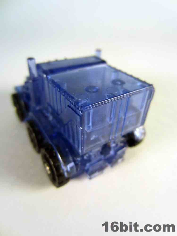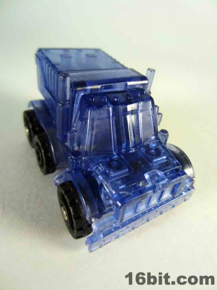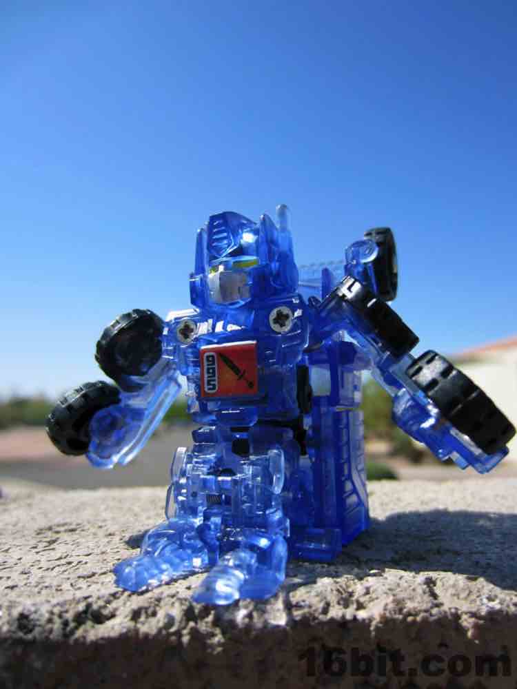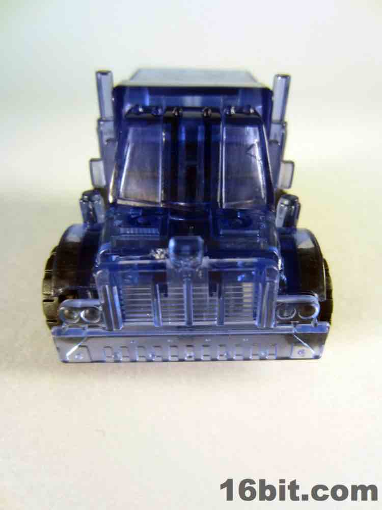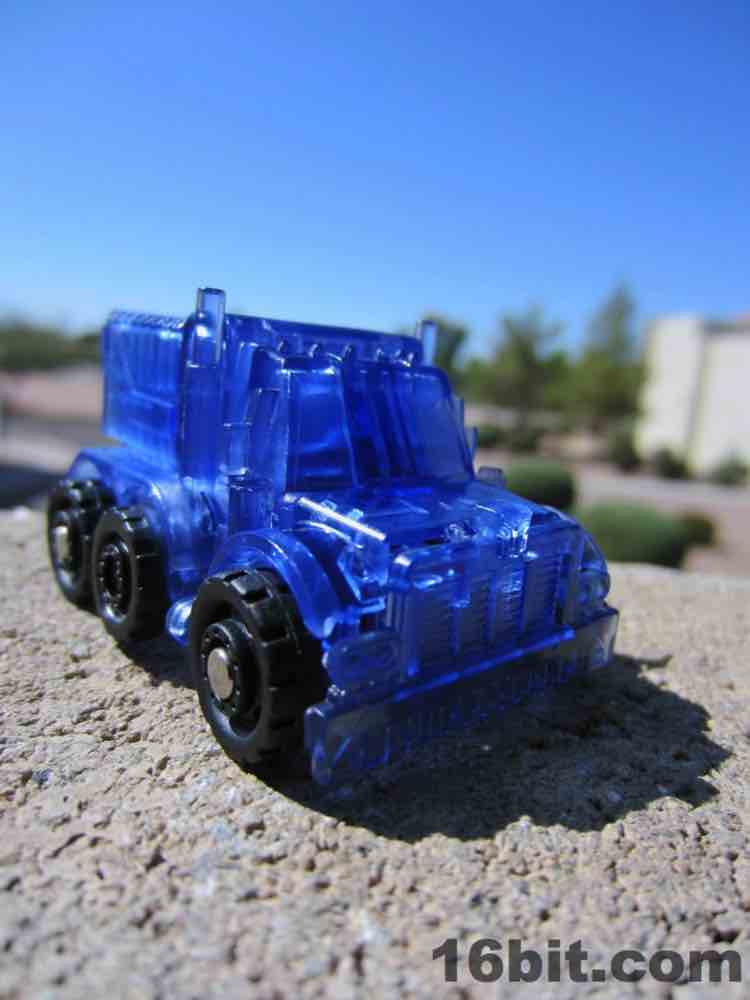The light blue plastic is much clearer than some of the other Super Bot figures, giving him a more skeletal, schematic-like look in a dark room when placed in front of my computer monitor. It's funny, there's a chance this figure was a little cheaper to produce due to the lack of deco, but if Hasbro sold it for $10 as a convention exclusive I'd probably say "OK, not a problem." This one really does feel more like a premium piece worth chasing down rather than another clear redeco, like truck Megatron. I like it a lot, you should get it if you can score one for four bucks. Clear blue definitely works for Optimus Prime, I'd love to see this plastic applied to a full-size deluxe or voyager toy in the future.