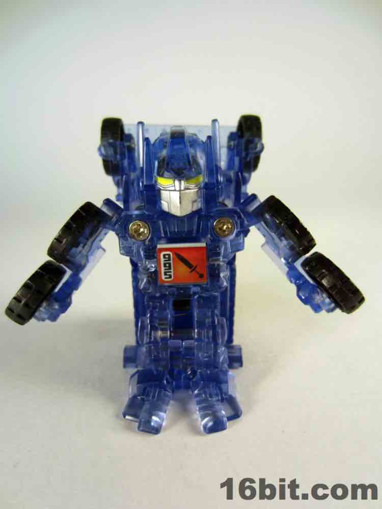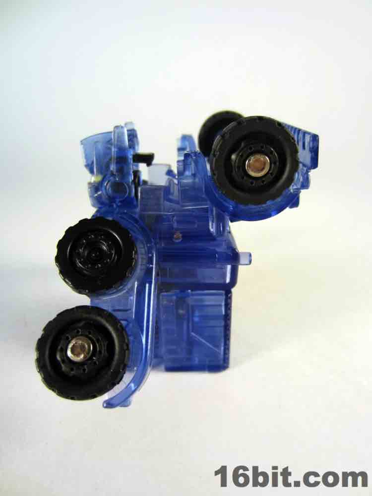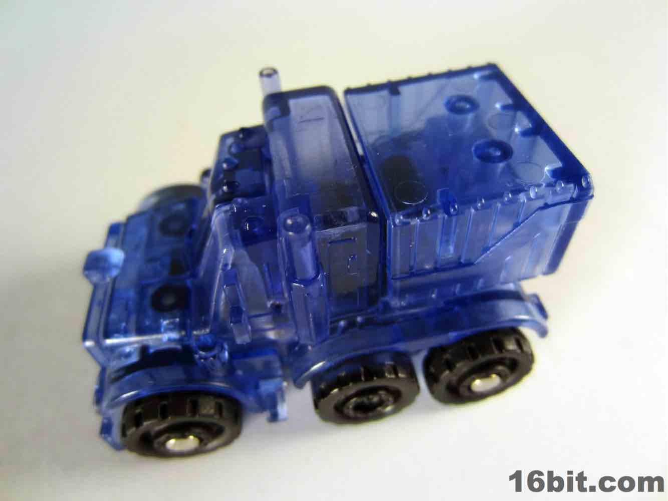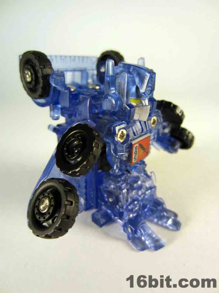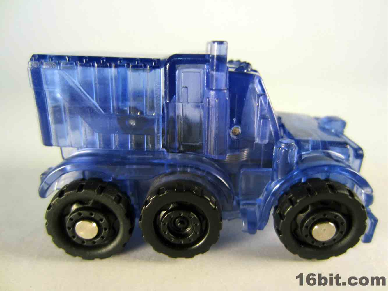 The light blue plastic is much clearer than some of the other Super Bot figures, giving him a more skeletal, schematic-like look in a dark room when placed in front of my computer monitor. It's funny, there's a chance this figure was a little cheaper to produce due to the lack of deco, but if Hasbro sold it for $10 as a convention exclusive I'd probably say "OK, not a problem." This one really does feel more like a premium piece worth chasing down rather than another clear redeco, like truck Megatron. I like it a lot, you should get it if you can score one for four bucks. Clear blue definitely works for Optimus Prime, I'd love to see this plastic applied to a full-size deluxe or voyager toy in the future.