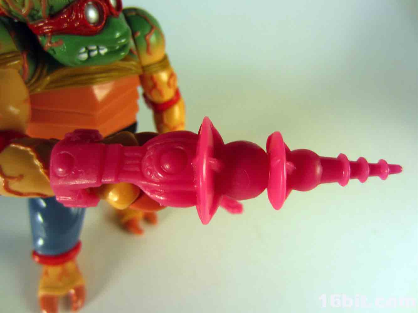 The figure is an entirely new sculpt and to my knowledge, was never repainted, but variant weapon colors do exist. The Super Atomic Sai is the best of the set, but the "club" and ray gun are also peppered with the traditional retro atom symbol which automatically makes everything cooler.