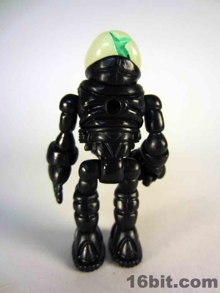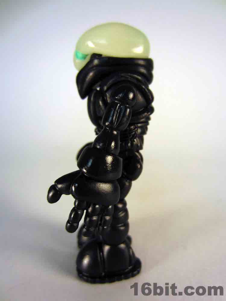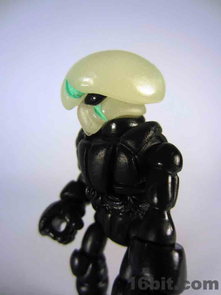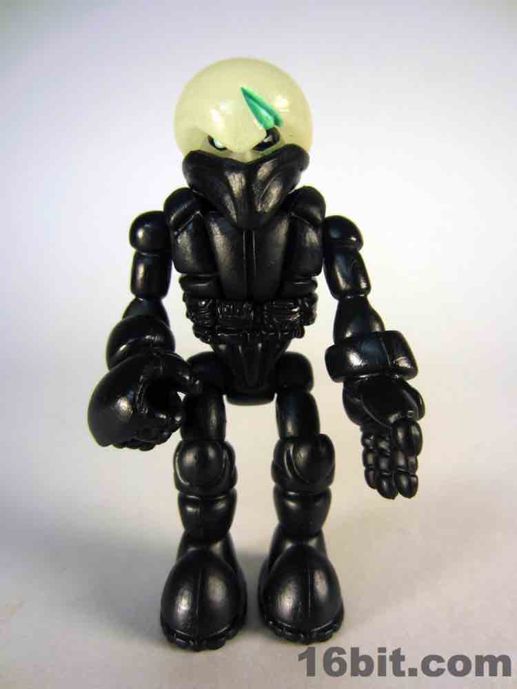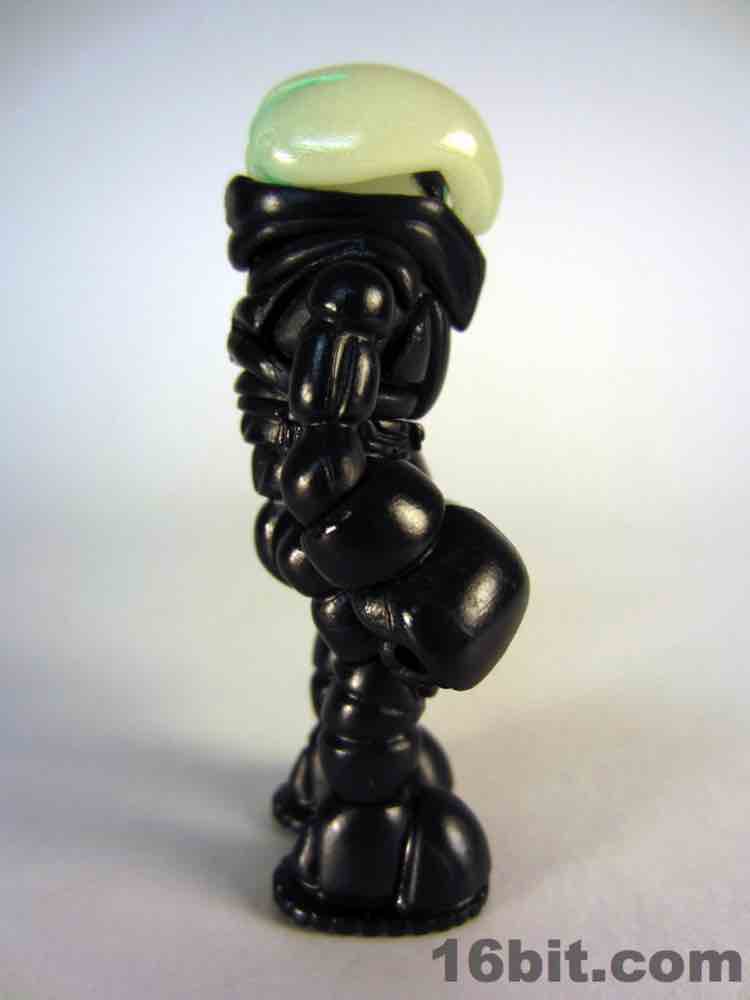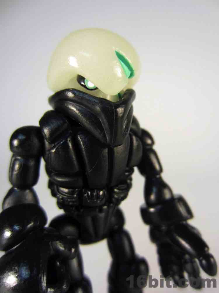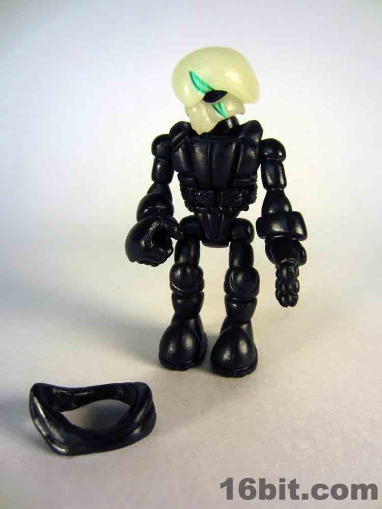 Roughly 2 3/4-inches tall, this release is made of mostly classic Pheyden parts but you'll recognize upper torso piece as being from Sarvos, which means he actually has a backpack hole if you're so inclined. Most photos of the character show him with a gun arm accessory (sold separately), but the figure is still pretty good as it is. The black body is a standard in this line, showing up again every year or so. What makes it unusual is a glow-in-the-dark head, specifically the Scar Pheyden noggin with a fair amount of paint. If you take off the head and look under the scarf, you'll see the scars are green, the eyes are black and black/white/green, and there's a painted neck too. The black paint on the lower part of the neck should be a great way to identify bogus versions of this figure, because scarves were available without Hades Pheyden, but only Hades Pheyden MK II seems to have a glow-in-the-dark head with a black painted neck from what I've seen so far.