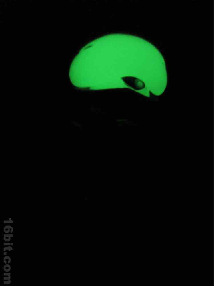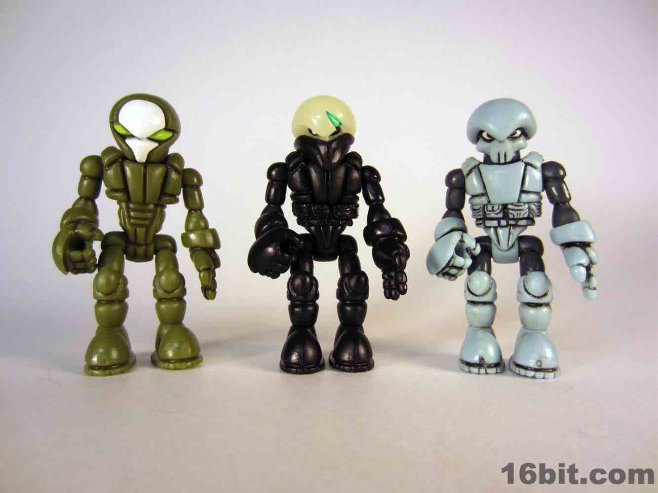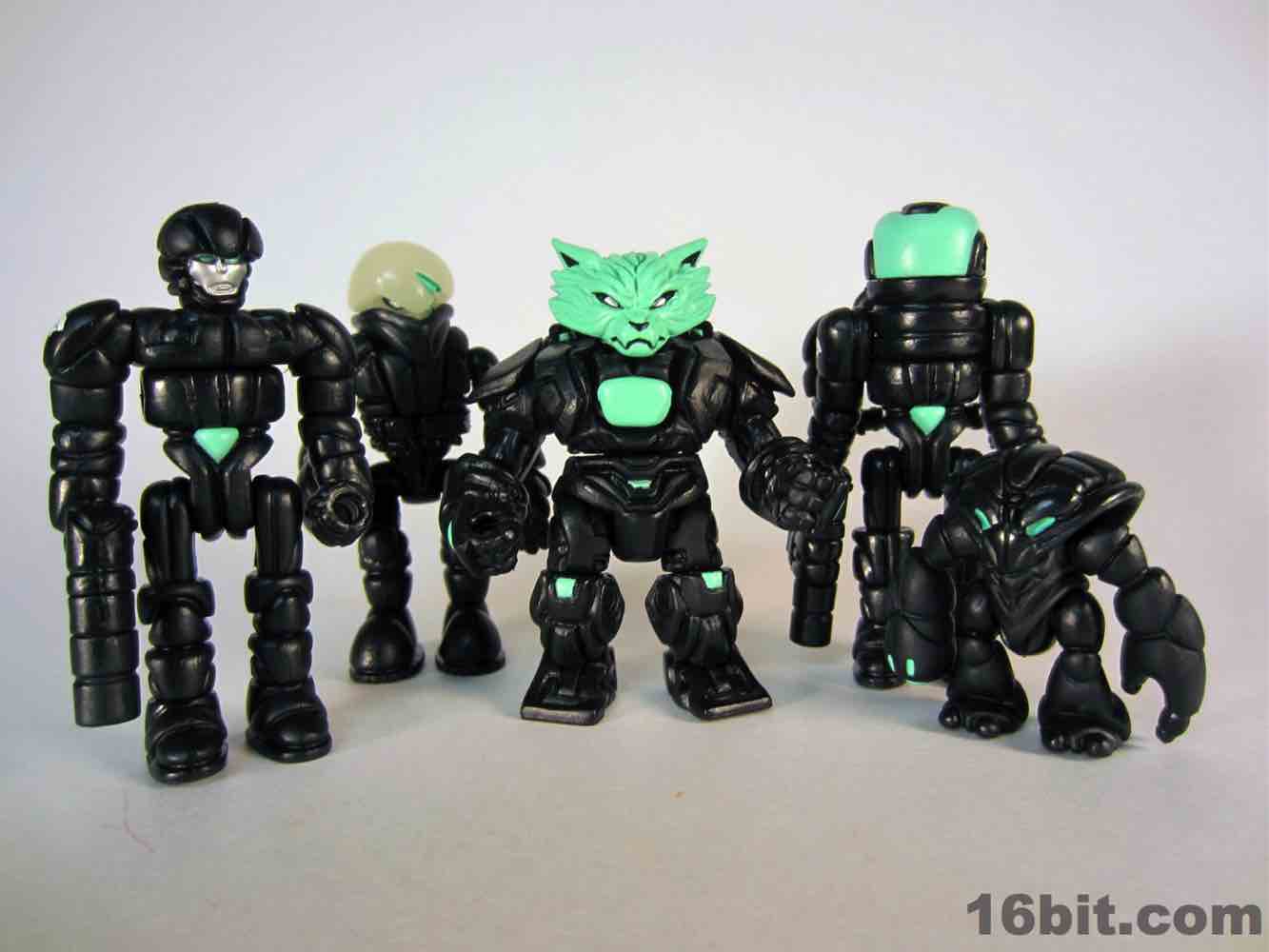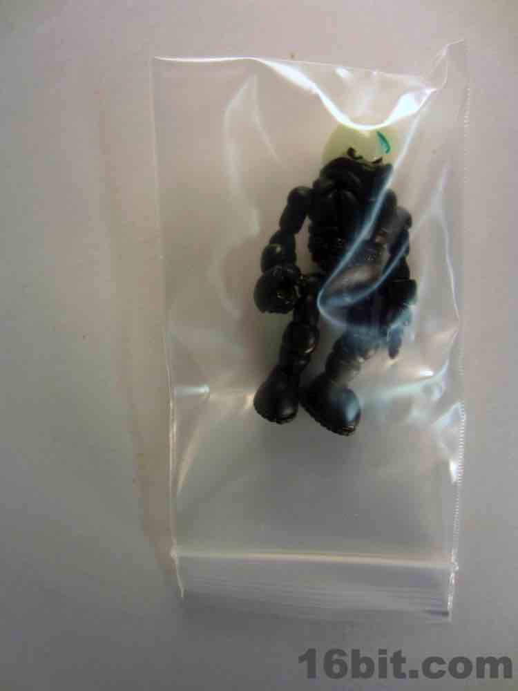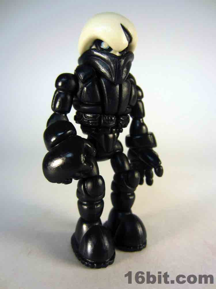 Roughly 2 3/4-inches tall, this release is made of mostly classic Pheyden parts but you'll recognize upper torso piece as being from Sarvos, which means he actually has a backpack hole if you're so inclined. Most photos of the character show him with a gun arm accessory (sold separately), but the figure is still pretty good as it is. The black body is a standard in this line, showing up again every year or so. What makes it unusual is a glow-in-the-dark head, specifically the Scar Pheyden noggin with a fair amount of paint. If you take off the head and look under the scarf, you'll see the scars are green, the eyes are black and black/white/green, and there's a painted neck too. The black paint on the lower part of the neck should be a great way to identify bogus versions of this figure, because scarves were available without Hades Pheyden, but only Hades Pheyden MK II seems to have a glow-in-the-dark head with a black painted neck from what I've seen so far.