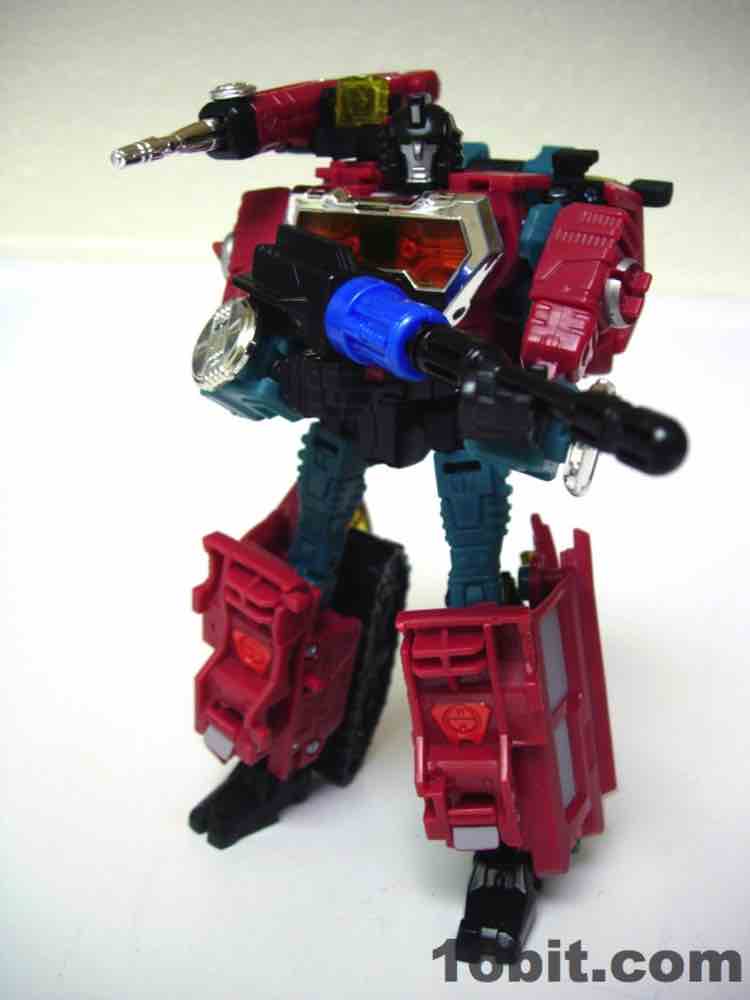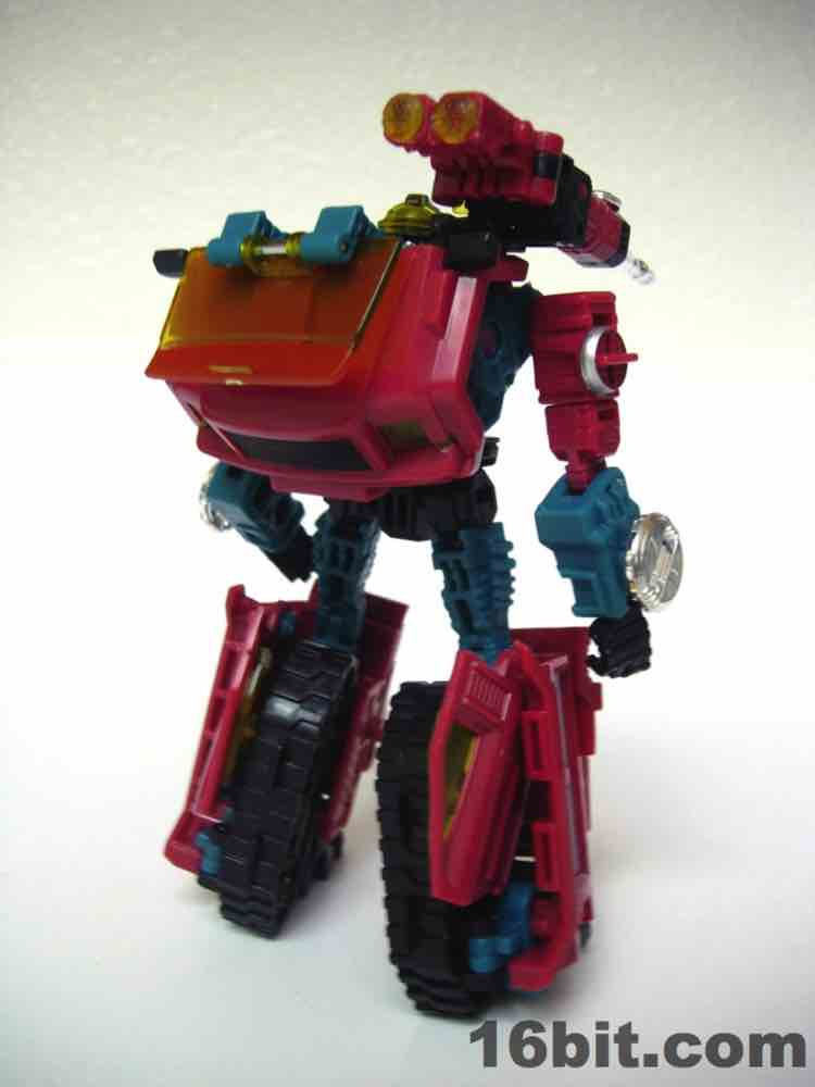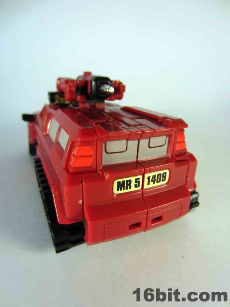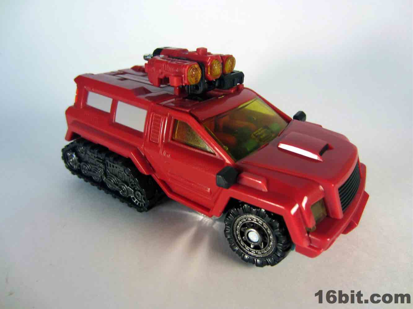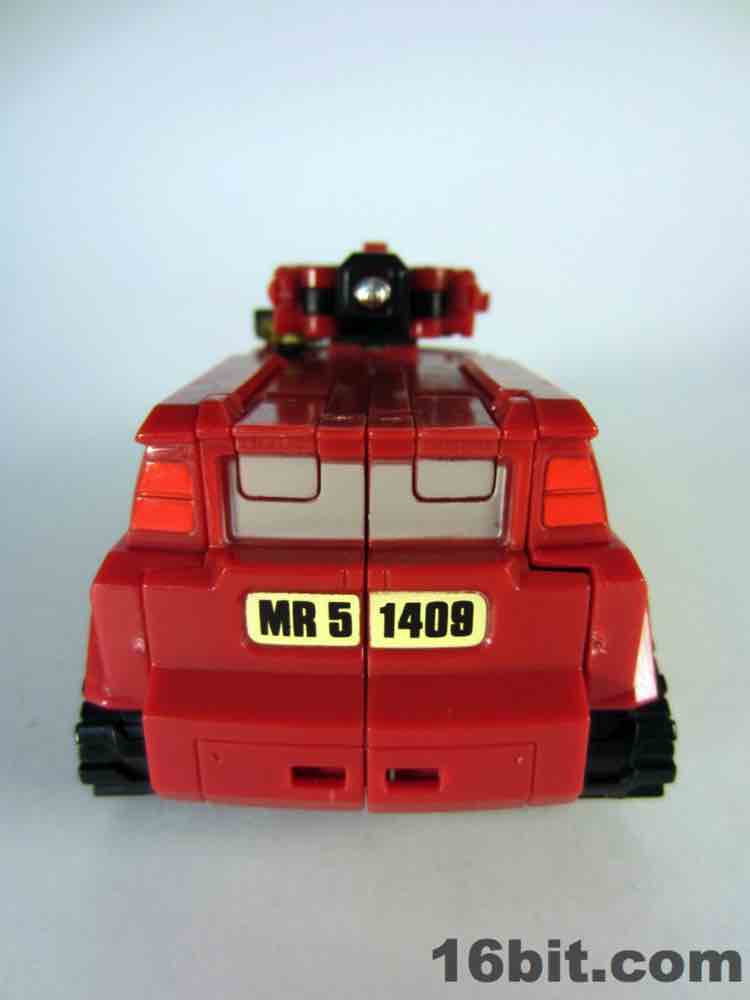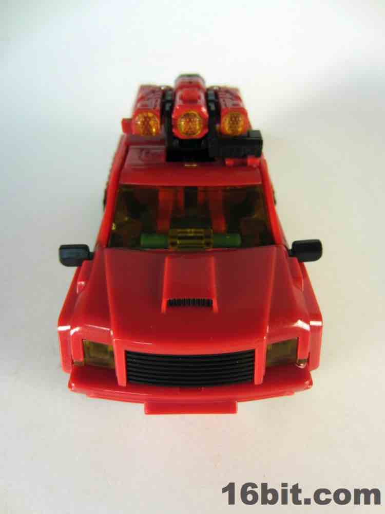 The truck is nice, but nothing special. It's a red craft with some neat lights on the top, with some windows clear orange and others painted silver. It's inconsistent, but it's OK. At 5-inches long it was a decent size when it came out, but today it's almost a giant as Deluxes have been downsized so much. The wheels roll if you transform it right, but it's such a pain in the neck to get everything just right.