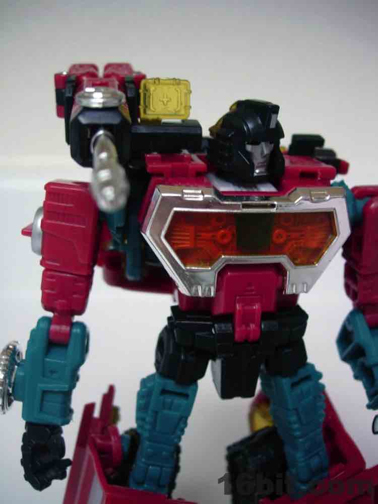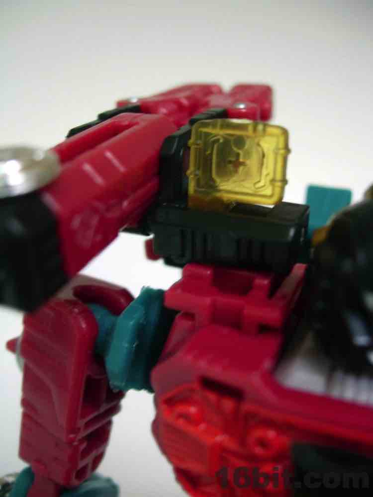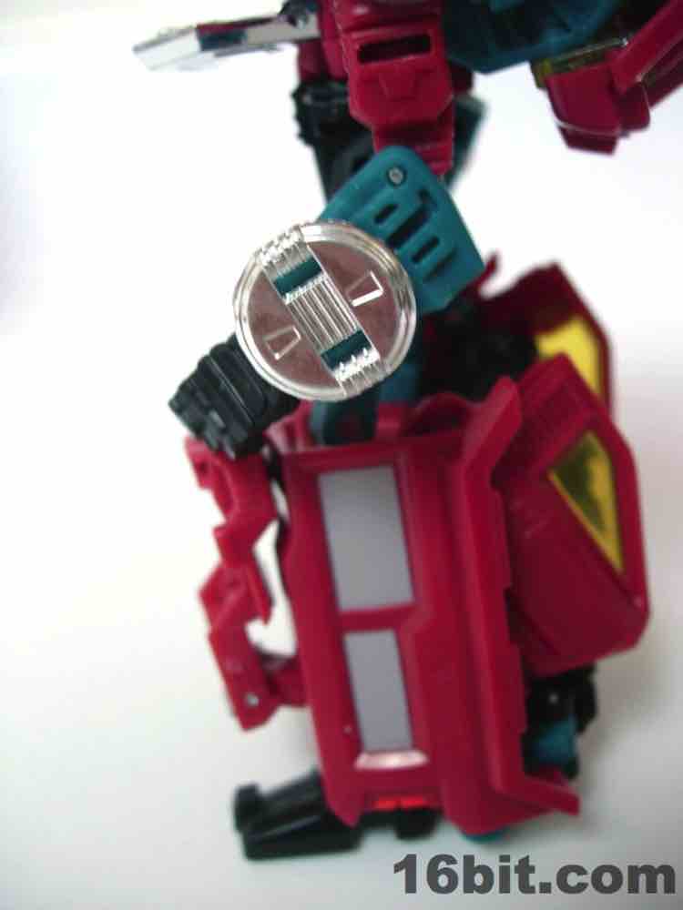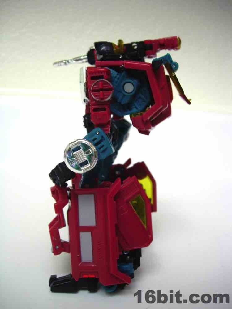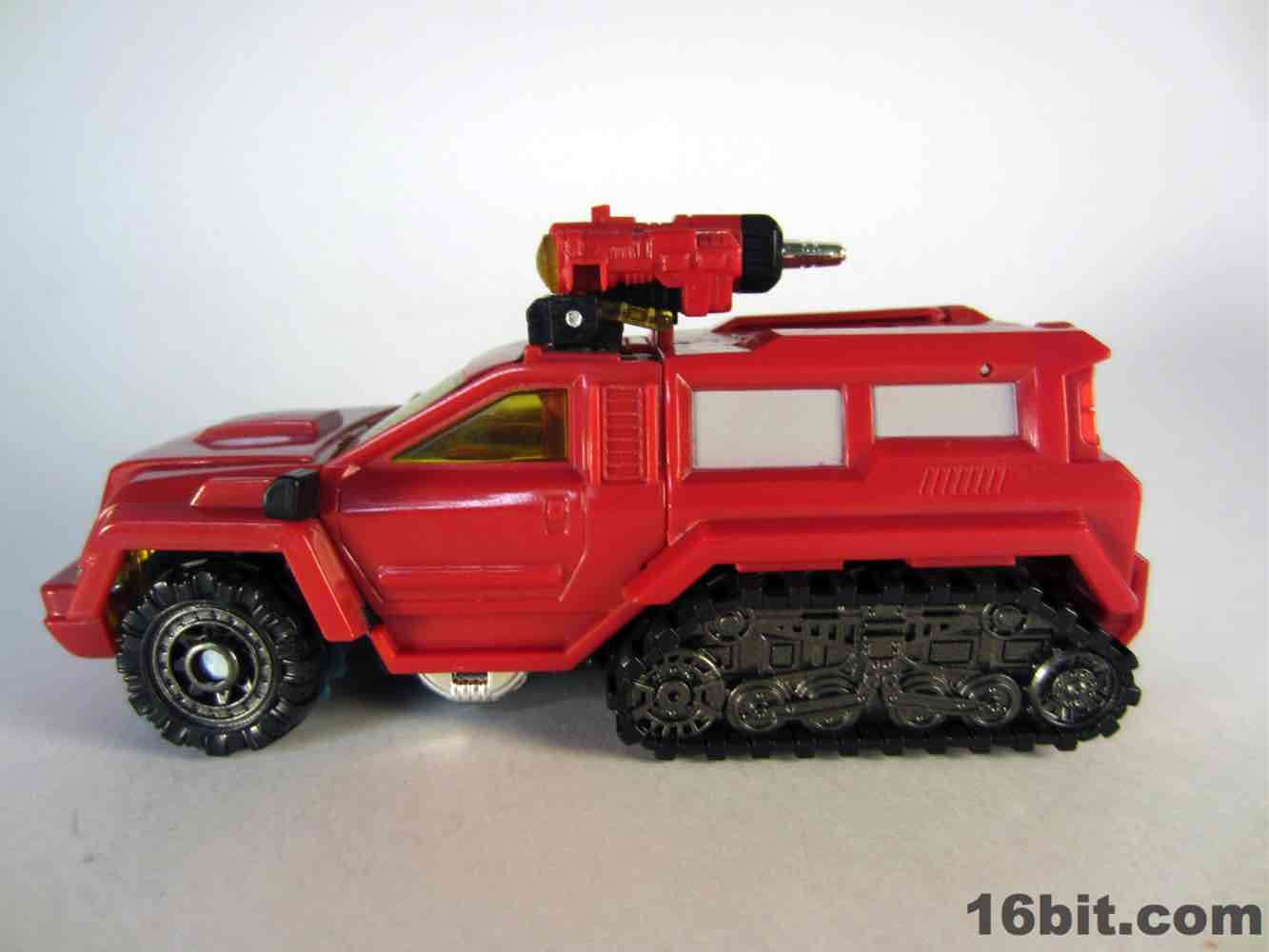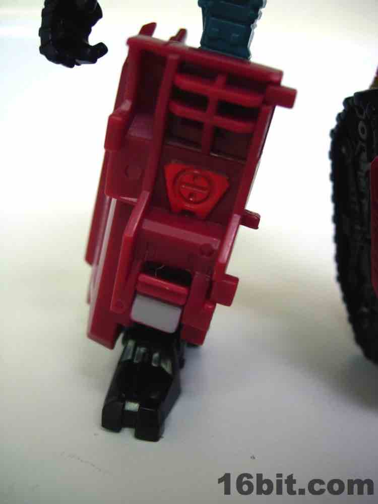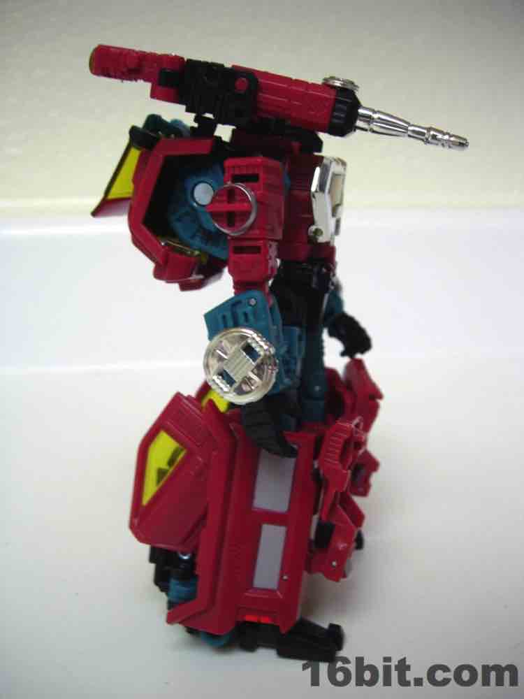 The truck is nice, but nothing special. It's a red craft with some neat lights on the top, with some windows clear orange and others painted silver. It's inconsistent, but it's OK. At 5-inches long it was a decent size when it came out, but today it's almost a giant as Deluxes have been downsized so much. The wheels roll if you transform it right, but it's such a pain in the neck to get everything just right.