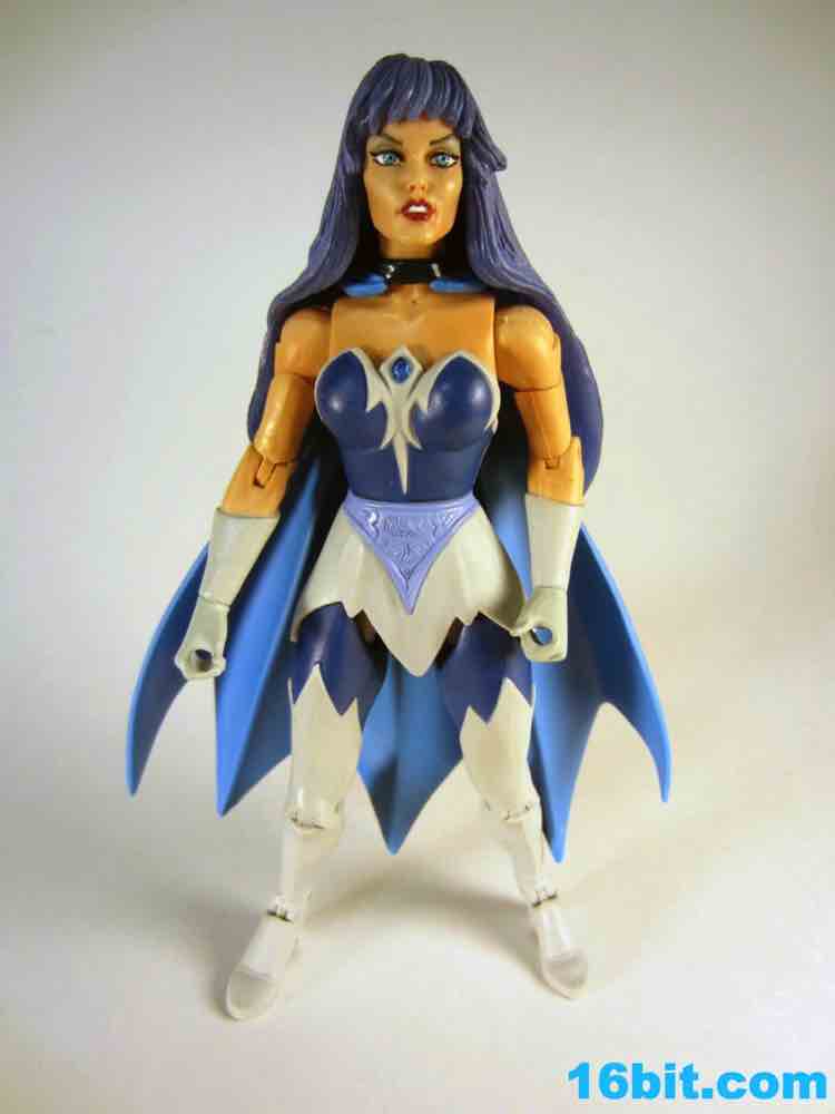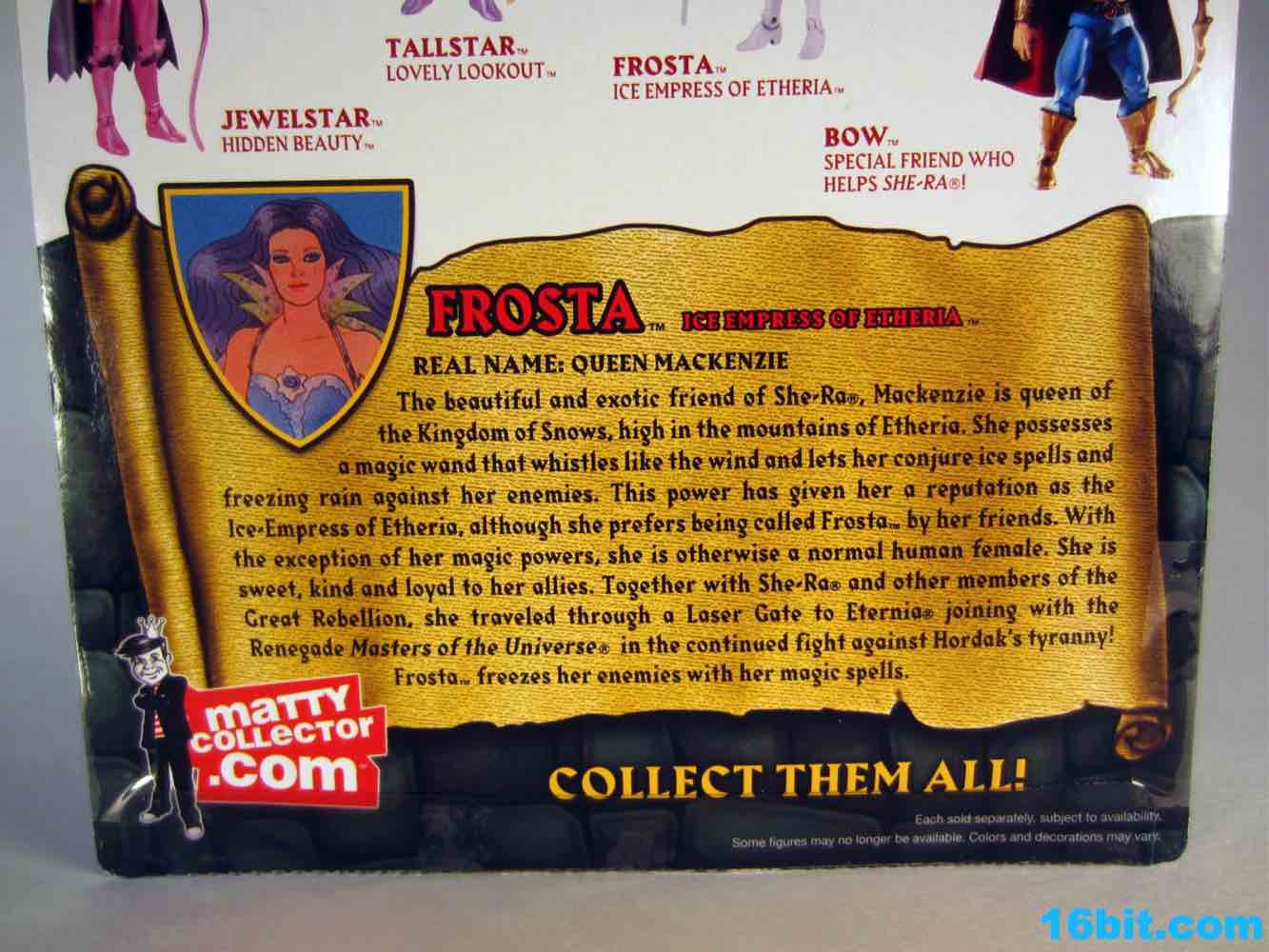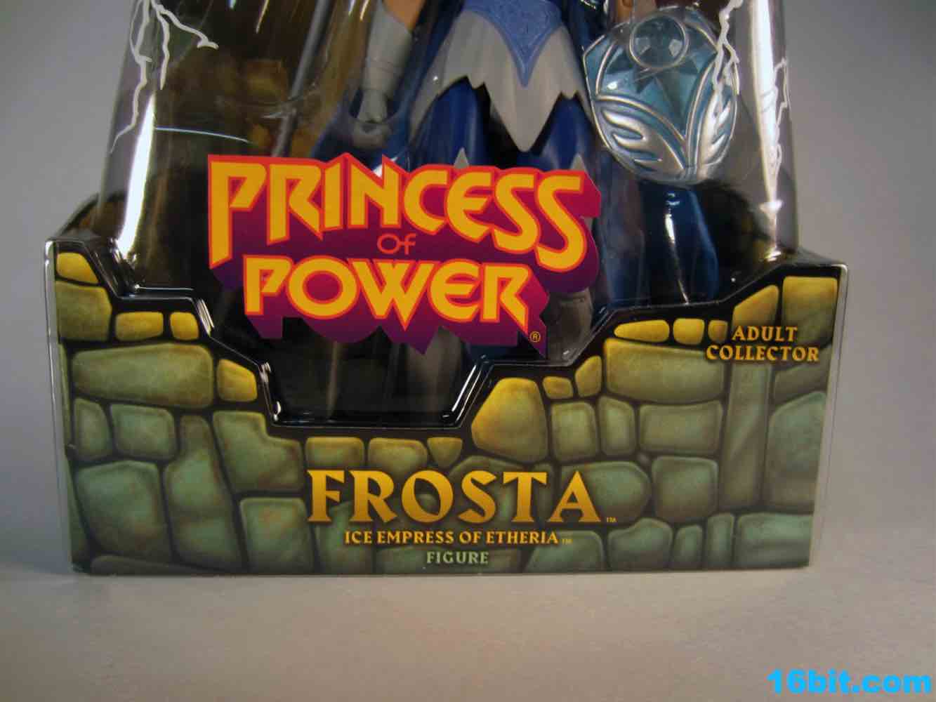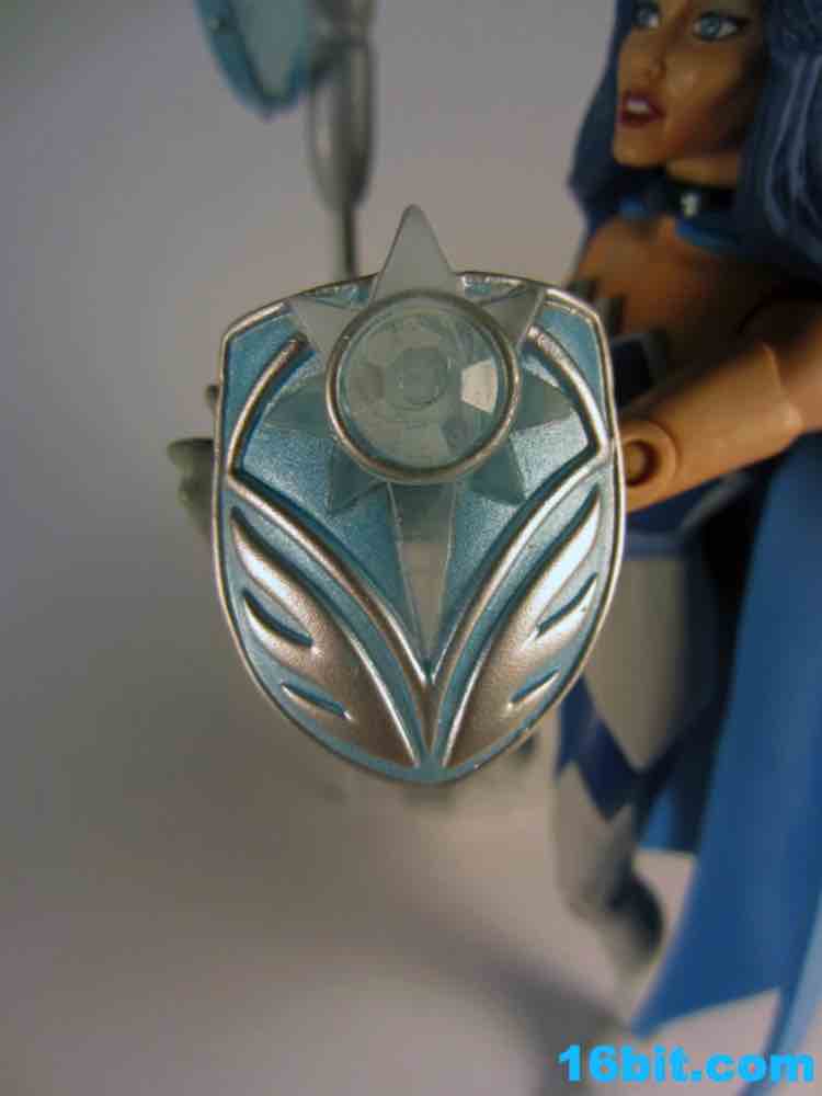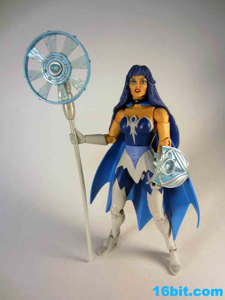 Drawing inspiration primarily from the old cartoons, Frosta nails the animation model in toy form in virtually all ways save for her hair color. The action figure is a smidgen darker, but she retains the gloved hands, blue-and-whiteish dress, and managed to translate the spinning accessory into something that looks more like a weapon. The comb from the original was (thankfully) dropped entirely, instead we got a swell shield. I like the design bunches.