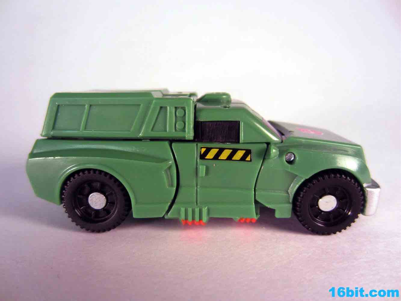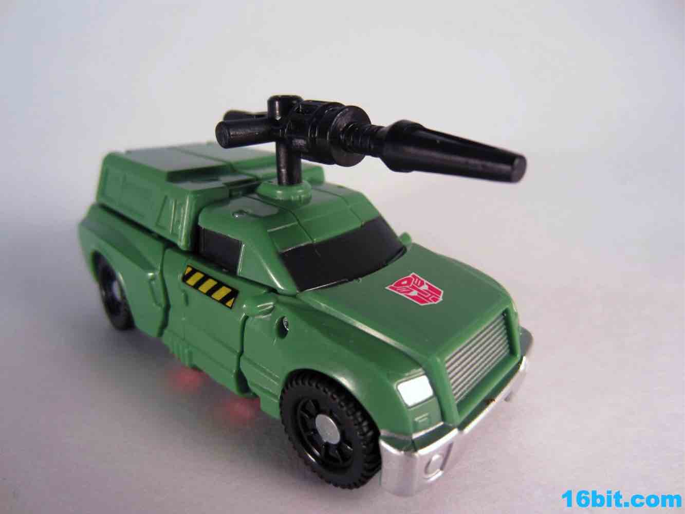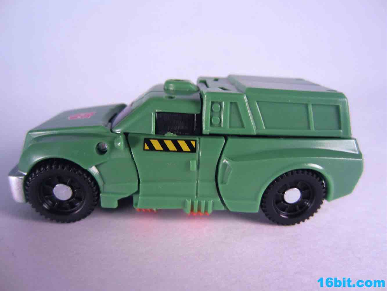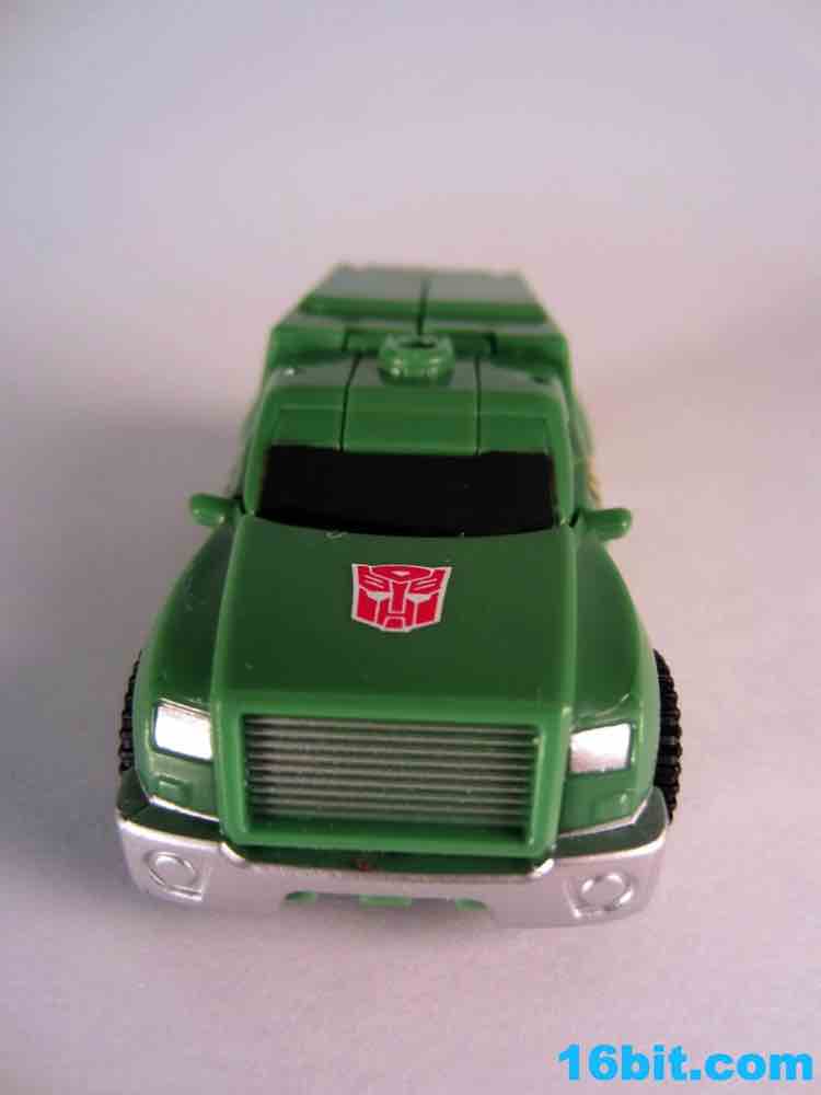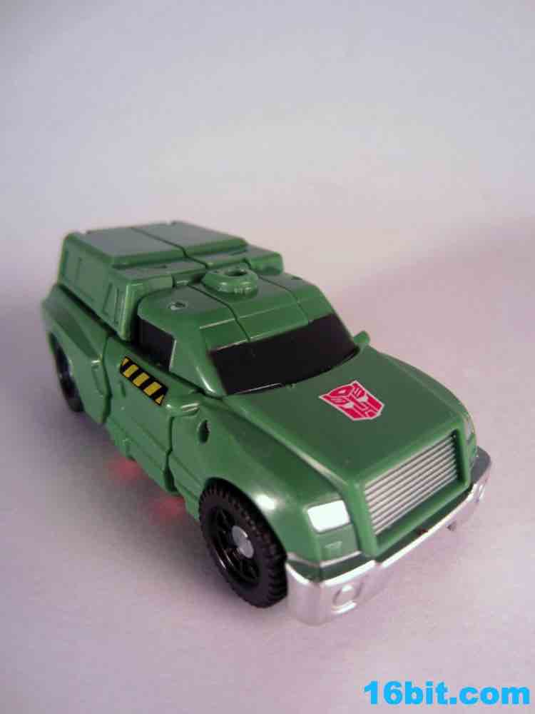 The stocky robot is pretty much the same as Trailcutter with tweaked hands and a hole in the back of his head. The enhanced deco brings a little more detail out, as the green highlights it successes and flaws quite well. For example, there's a lot of sculpted detail on the feet. There are also unpainted windows. The bright red Autobot symbol is always welcome, and it stands out better than the black stickers from the RTS sub-line.