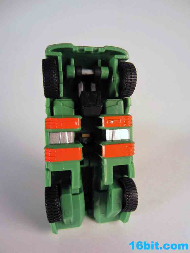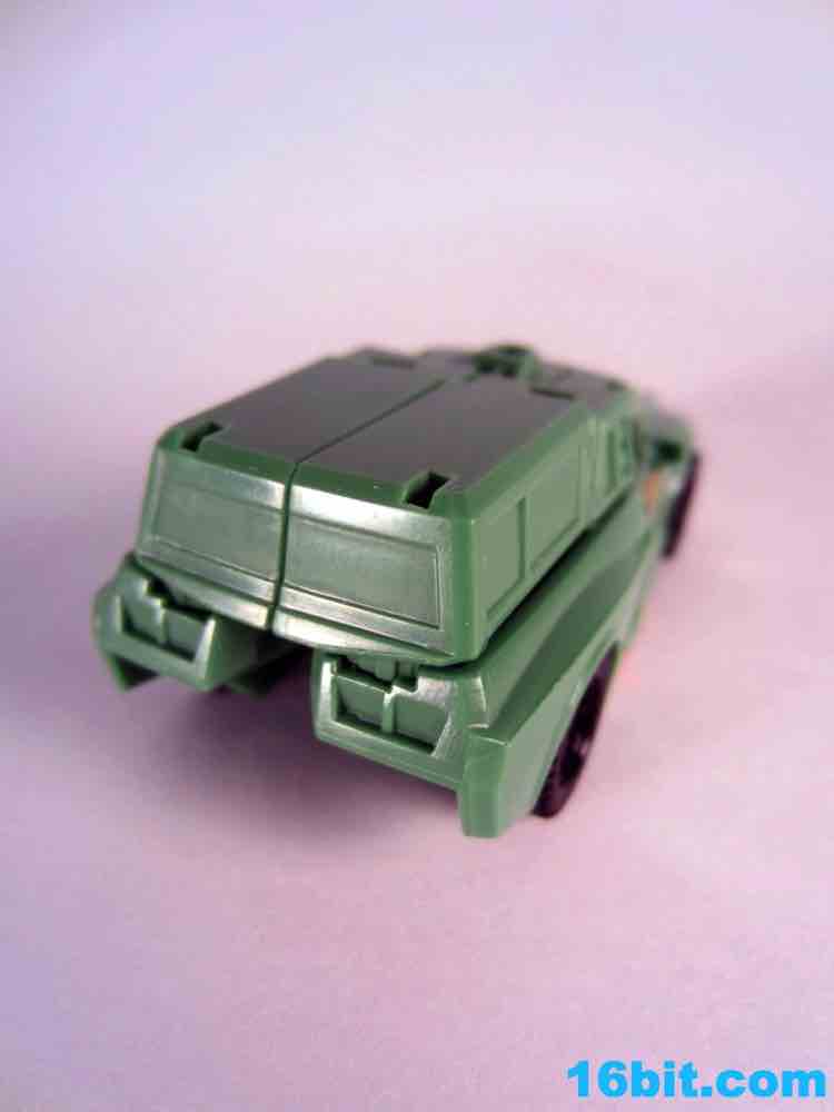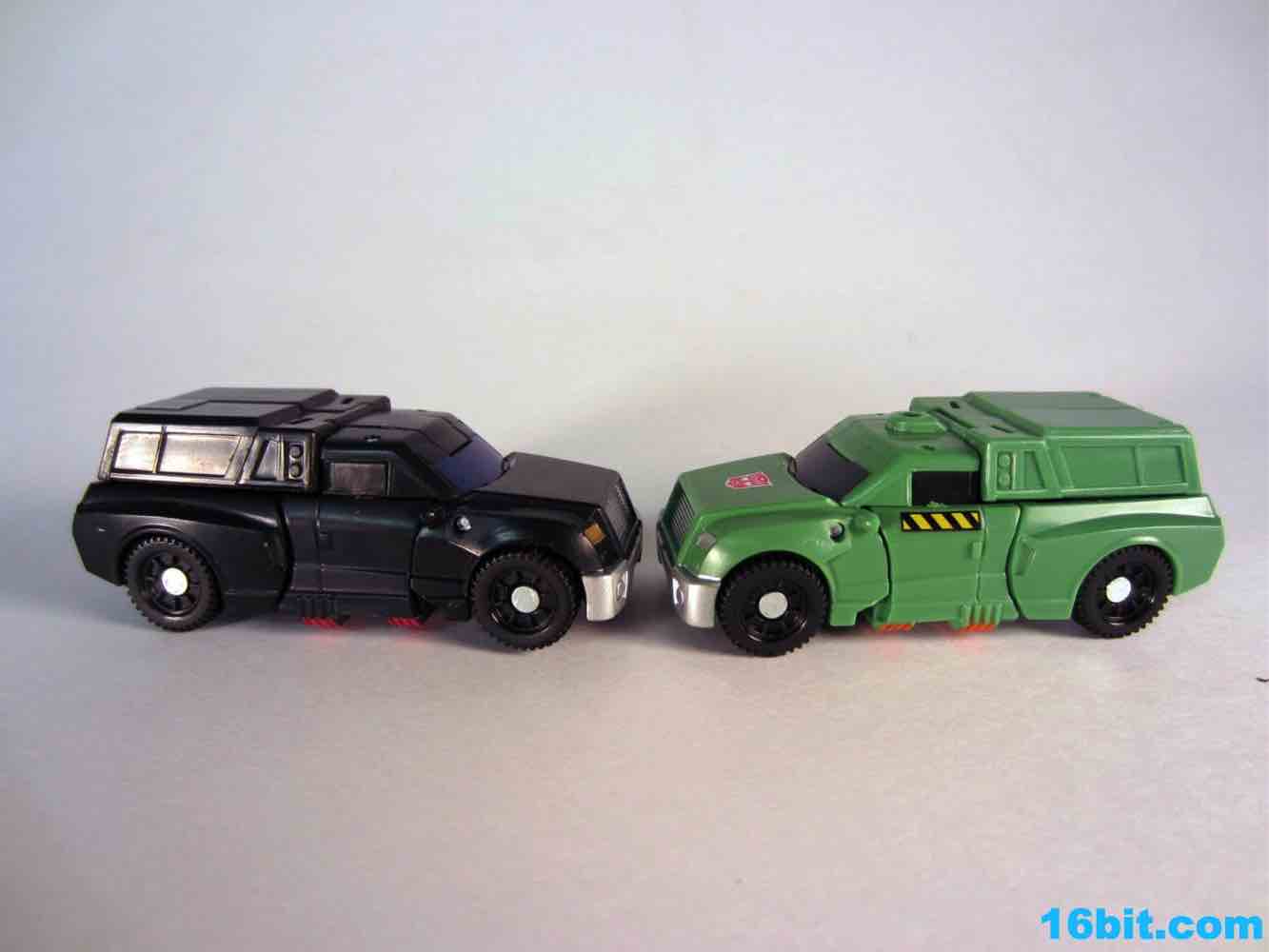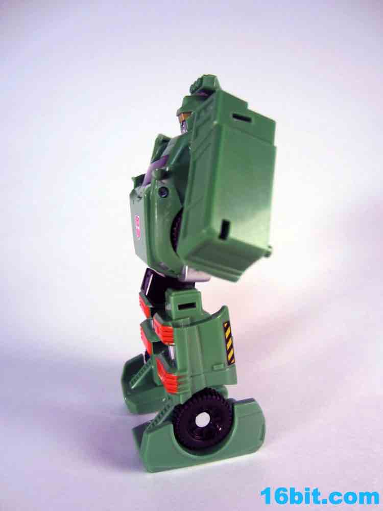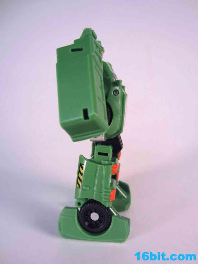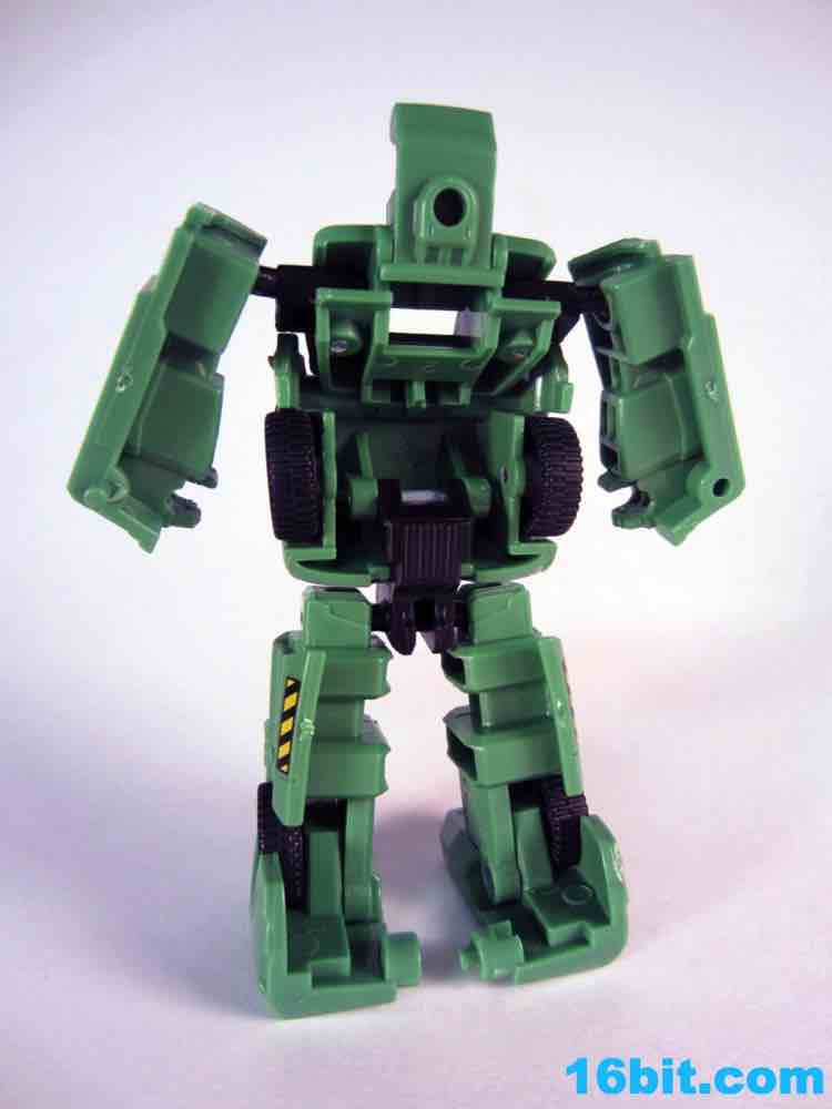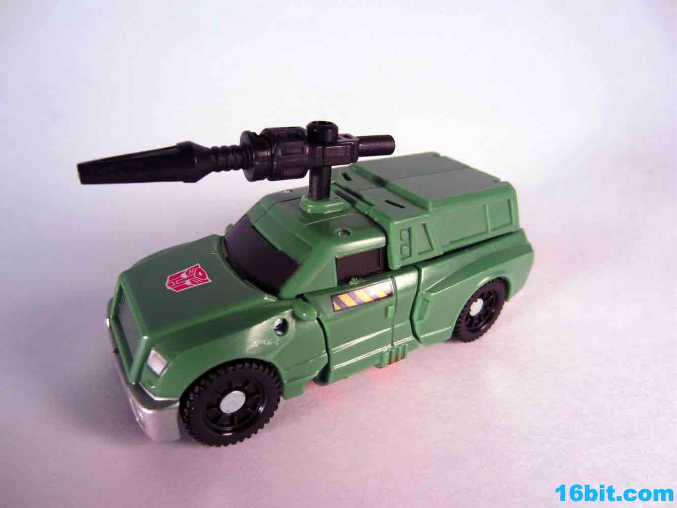 The stocky robot is pretty much the same as Trailcutter with tweaked hands and a hole in the back of his head. The enhanced deco brings a little more detail out, as the green highlights it successes and flaws quite well. For example, there's a lot of sculpted detail on the feet. There are also unpainted windows. The bright red Autobot symbol is always welcome, and it stands out better than the black stickers from the RTS sub-line.